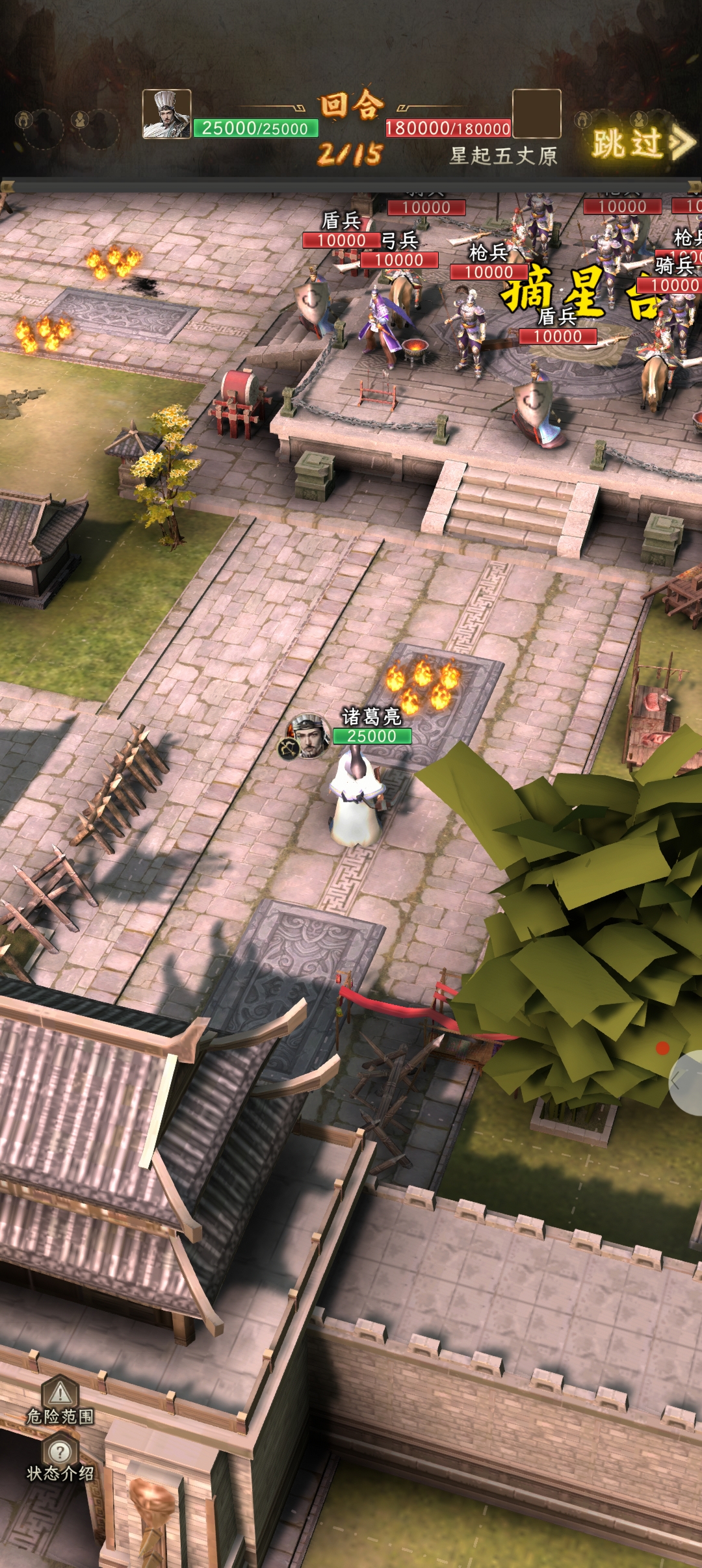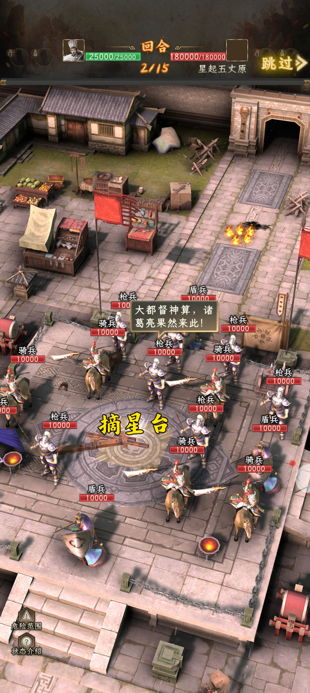 三国志战旗天下的画面中古色古香的战场场景极具代入感,石板路、民居、战火交织,还原了三国战场的真实风貌。我方与敌军在“摘星台”区域展开对峙,敌军布下枪兵、盾兵、骑兵等多种兵种组成的严密阵型,兵力高达180000,而我方需操控诸葛亮(兵力25000)在15回合内破局。“大都督神算,诸葛亮果然来此!”的台词,瞬间将人带入三国谋士交锋的紧张氛围中。游戏采用战旗策略玩法,玩家需在棋盘式的战场中,利用兵种克制、地形优势和武将技能来排兵布阵。每一步移动、每一次攻击都需精打细算,比如枪兵克制骑兵、盾兵抵御远程等机制,让战斗充满策略深度。跳过功能则为追求效率的玩家提供了便捷选择。从场景细节到兵种设计,从策略博弈到剧情还原,《三国志战旗天下》将三国战场的魅力展现得淋漓尽致。
