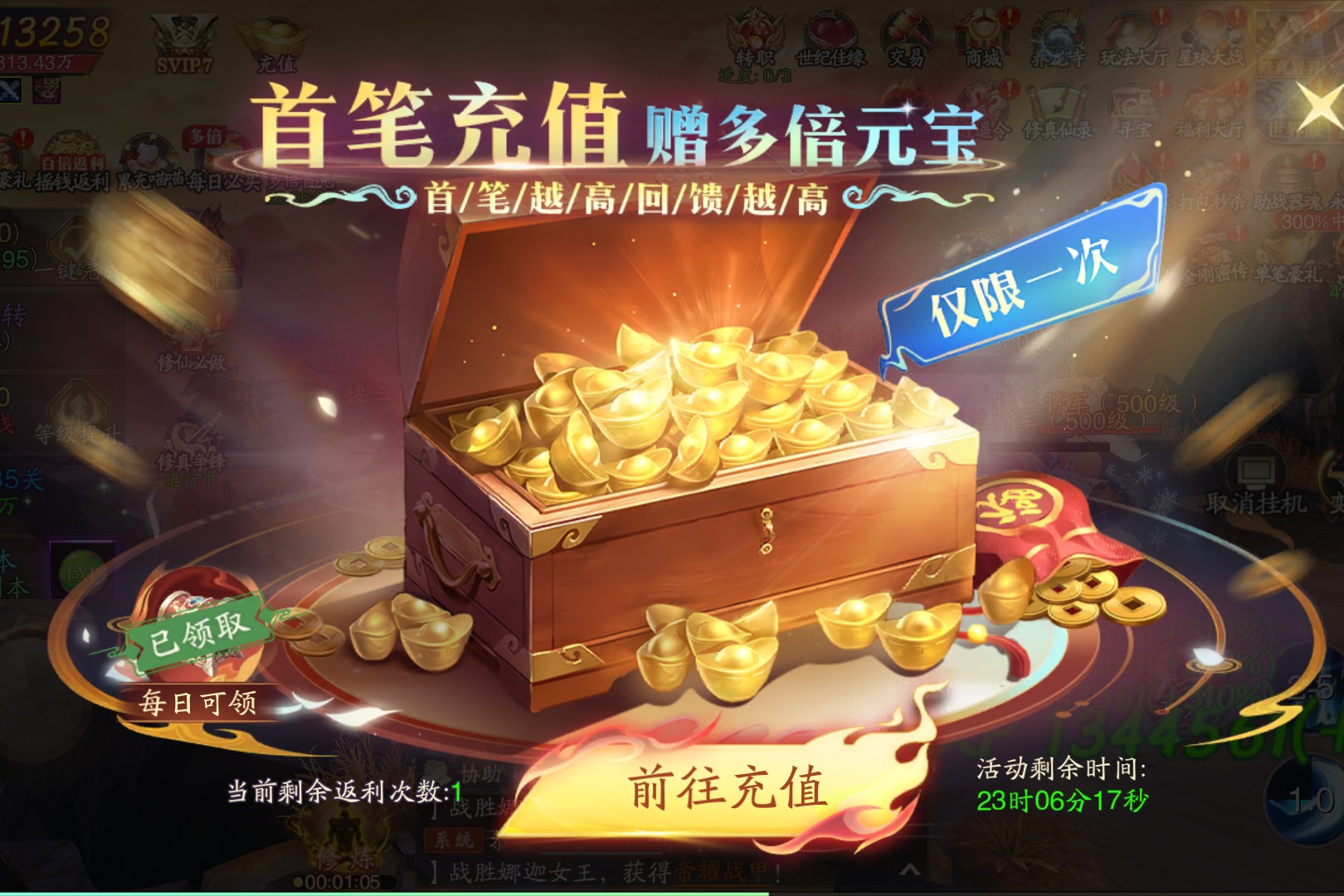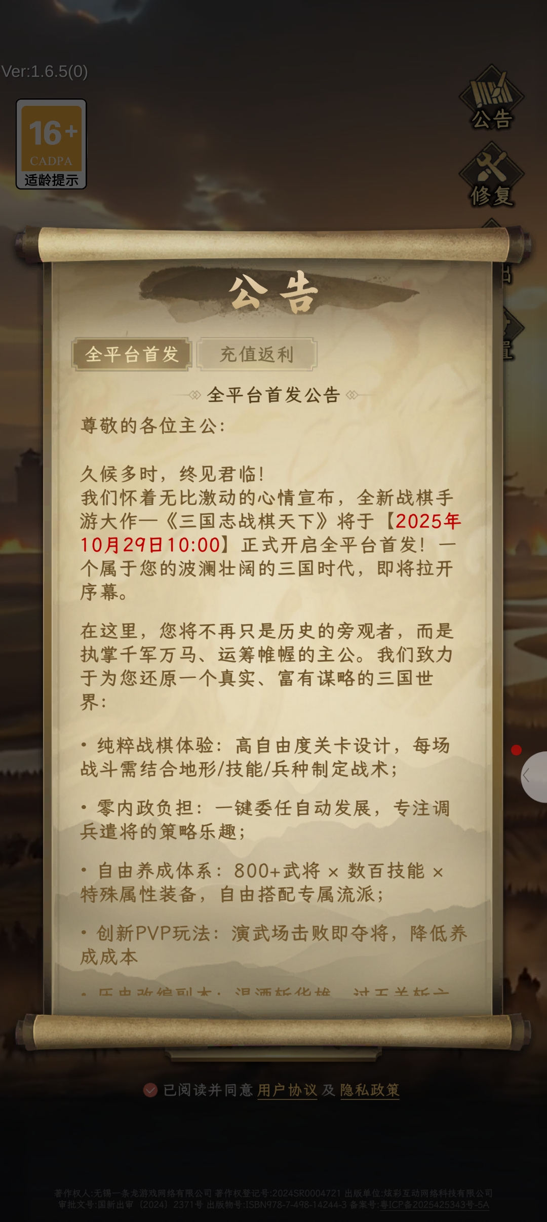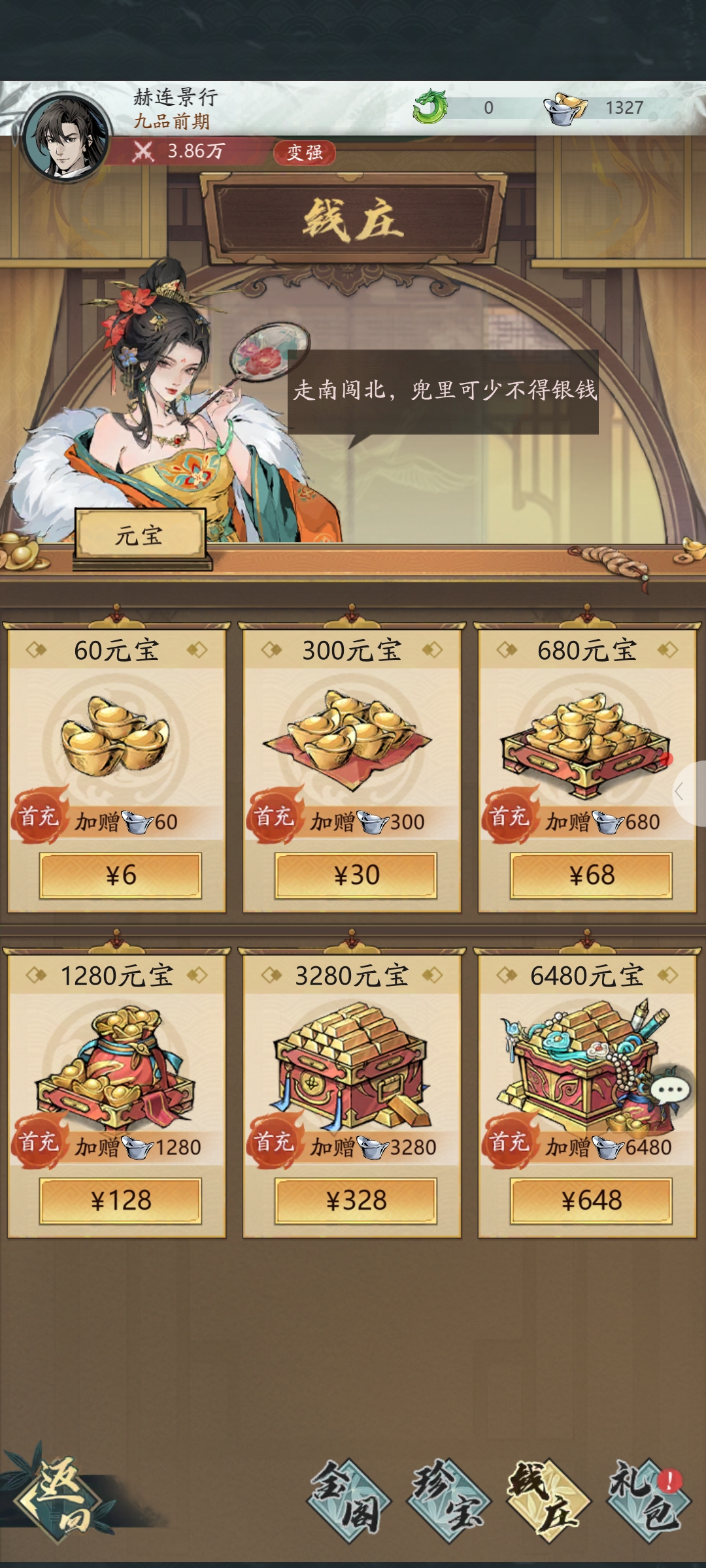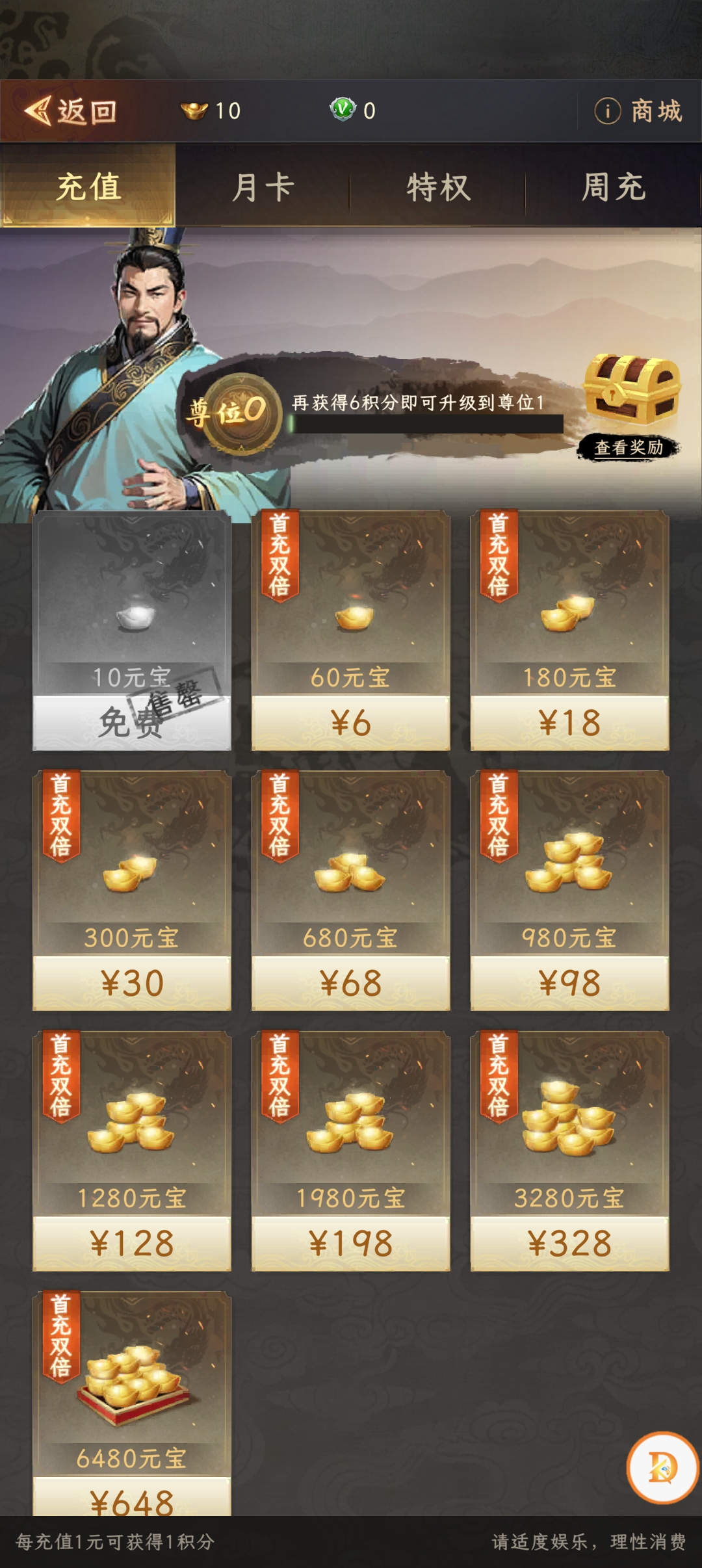 三国志战旗天下的乱世征程中充值系统是主公们获取资源、加速发展的重要途径。界面设计充满古风韵味,一位身着古装的谋士形象立于侧,仿佛在为主公的争霸之路出谋划策,充值选项丰富多样,从免费的10元宝福利,到6元60元宝、18元180元宝等不同档位,更有首充双倍的超值优惠,例如68元可获680元宝(首充双倍后收益倍增),最高648元可拿下6480元宝。每充值1元还可获得1积分,积分积累到一定程度能升级尊位,解锁更多奖励。这些元宝资源可用于招募武将、升级建筑、强化装备等诸多关键环节,助力主公在攻城略地(如攻占阳平关)、发展势力的过程中抢占先机。同时,系统也温馨提示“请适度娱乐,理性消费”,让主公们在享受游戏乐趣的同时,合理规划资源。无论是初入乱世的新手主公,还是意图一统天下的雄主,都能在这充值系统中找到适合自己的资源获取方式,为逐鹿中原、成就霸业奠定坚实基础。