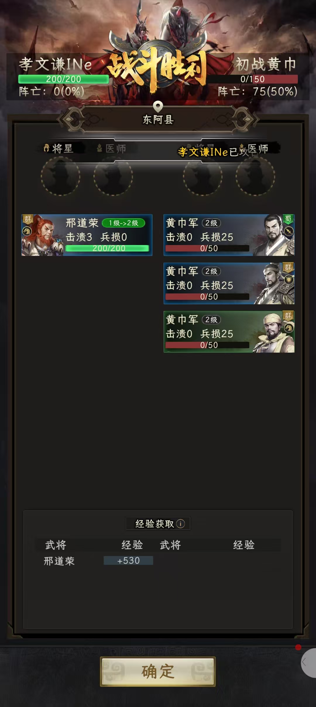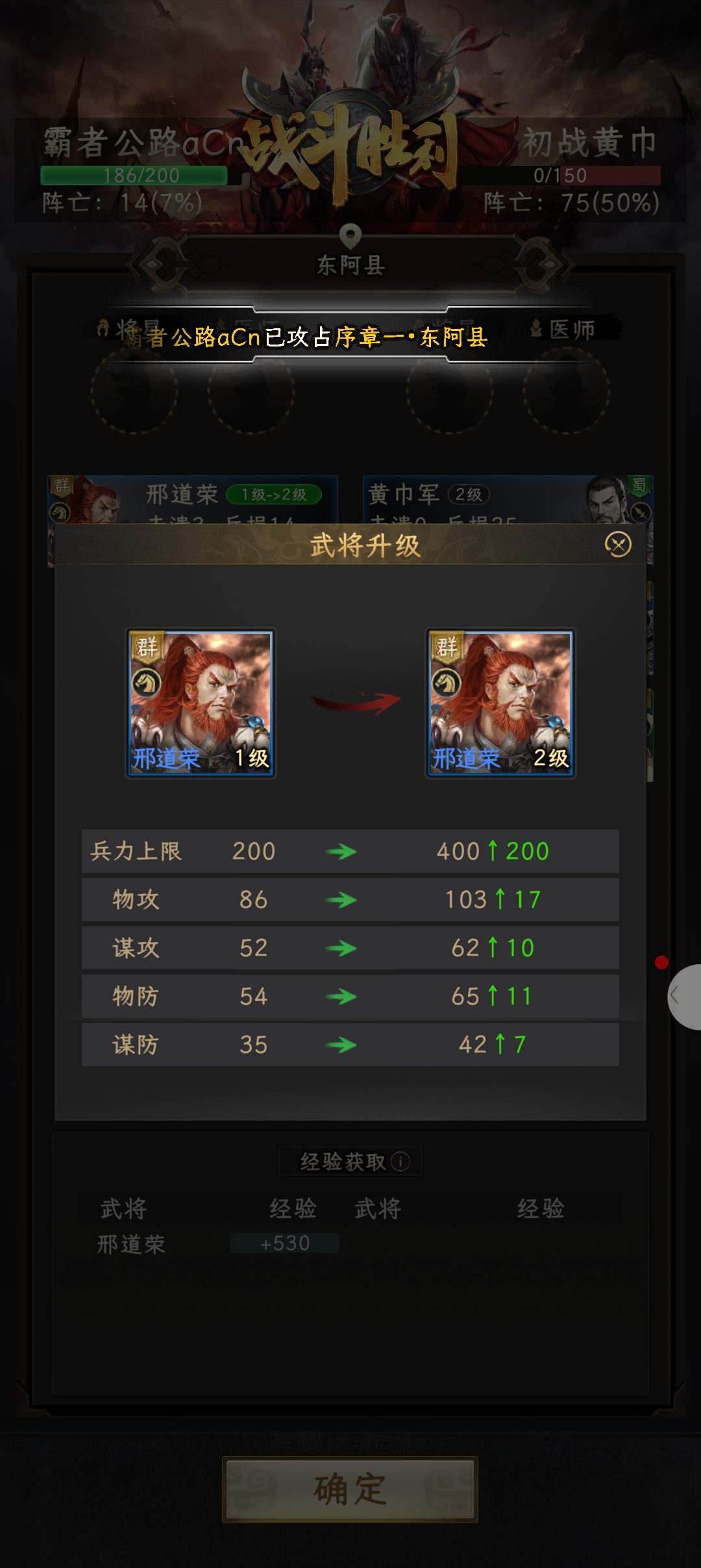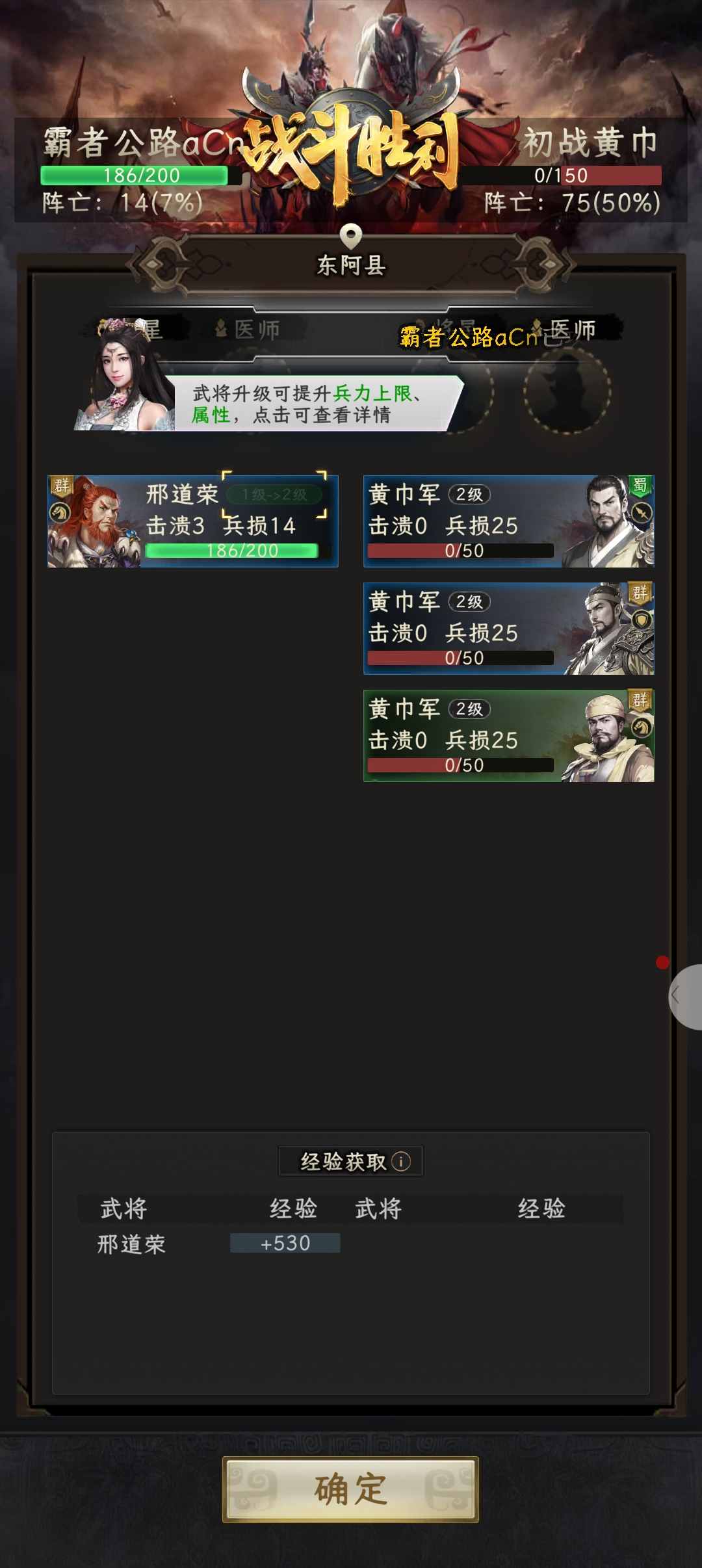 在《三国志战棋天下》的战场中,东阿县之战尽显策略与热血。邢道荣在战斗中击溃敌军,自身仅兵损14,战后升级,兵力上限、攻防等属性全面提升。攻占东阿县后,新增招贤武将张曼成、邢道荣、裴元绍,为阵营注入新战力阳平关之战中,玩家指挥邢道荣、廖化对阵黄巾军,廖化洞悉敌军扎堆布阵的弱点,凭借枪兵之能从容应对。游戏战旗玩法策略感十足,玩家需合理排兵布阵,利用武将特性克敌制胜。从招贤纳将到沙场征战,从城池攻占再到属性成长,每一步都充满三国乱世的权谋与热血,带你沉浸式体验运筹帷幄、逐鹿中原的快感,快来打造属于你的三国霸业!