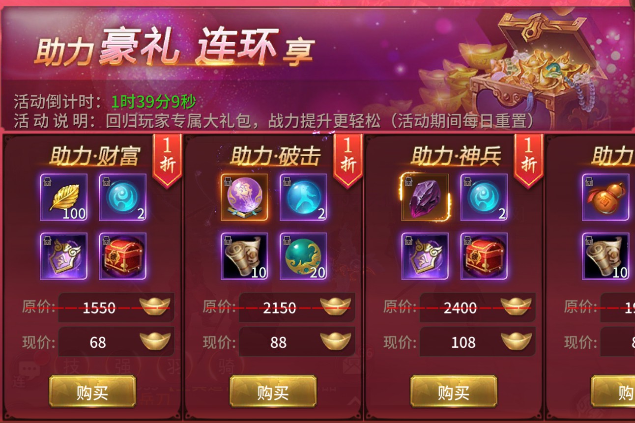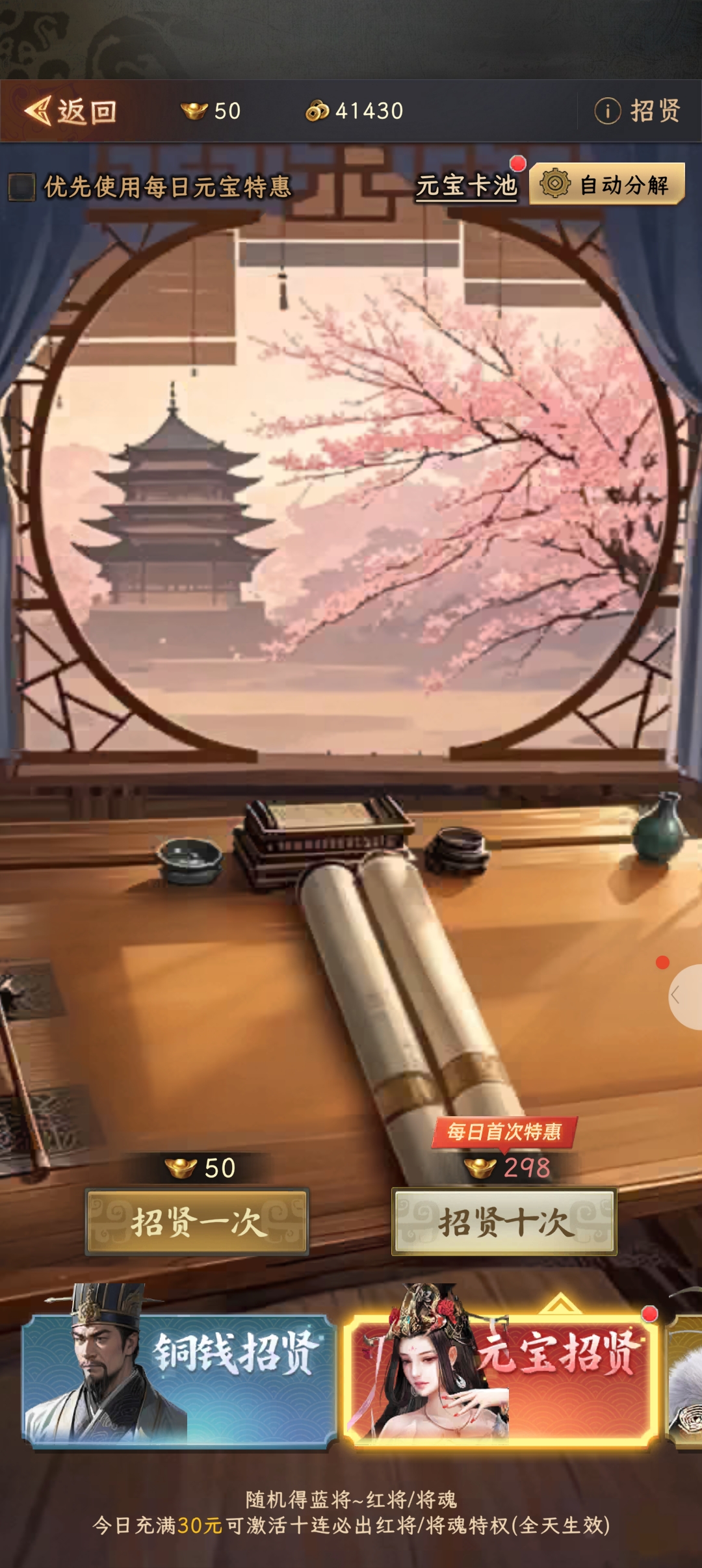 在三国志战旗天下中周充奖励活动以“每周累计充值指定金额,领取额外奖励”为核心,搭配古风韵味十足的界面设计,一位身着粉色汉服、手持团扇的佳人立于侧,尽显三国风情。从充值10元即可获取100元宝的入门福利,到充值50元解锁“贤”字道具与300元宝,再到充值1000元斩获15个“贤”道具与5000元宝,奖励梯度层层递进。后续充值2000元、3000元乃至更高额度,元宝与“贤”道具的数量更是大幅跃升,例如充值5000元可获100个“贤”道具与12000元宝,充值10000元则能拿下200个“贤”道具与18000元宝。这些奖励中的“贤”道具可助力主公招揽贤才、提升武将实力,元宝更是游戏内通用资源,可用于招募、养成、装备强化,在获取丰厚资源的同时,切记适度娱乐、理性消费,方能在三国乱世中长久立足、成就霸业。