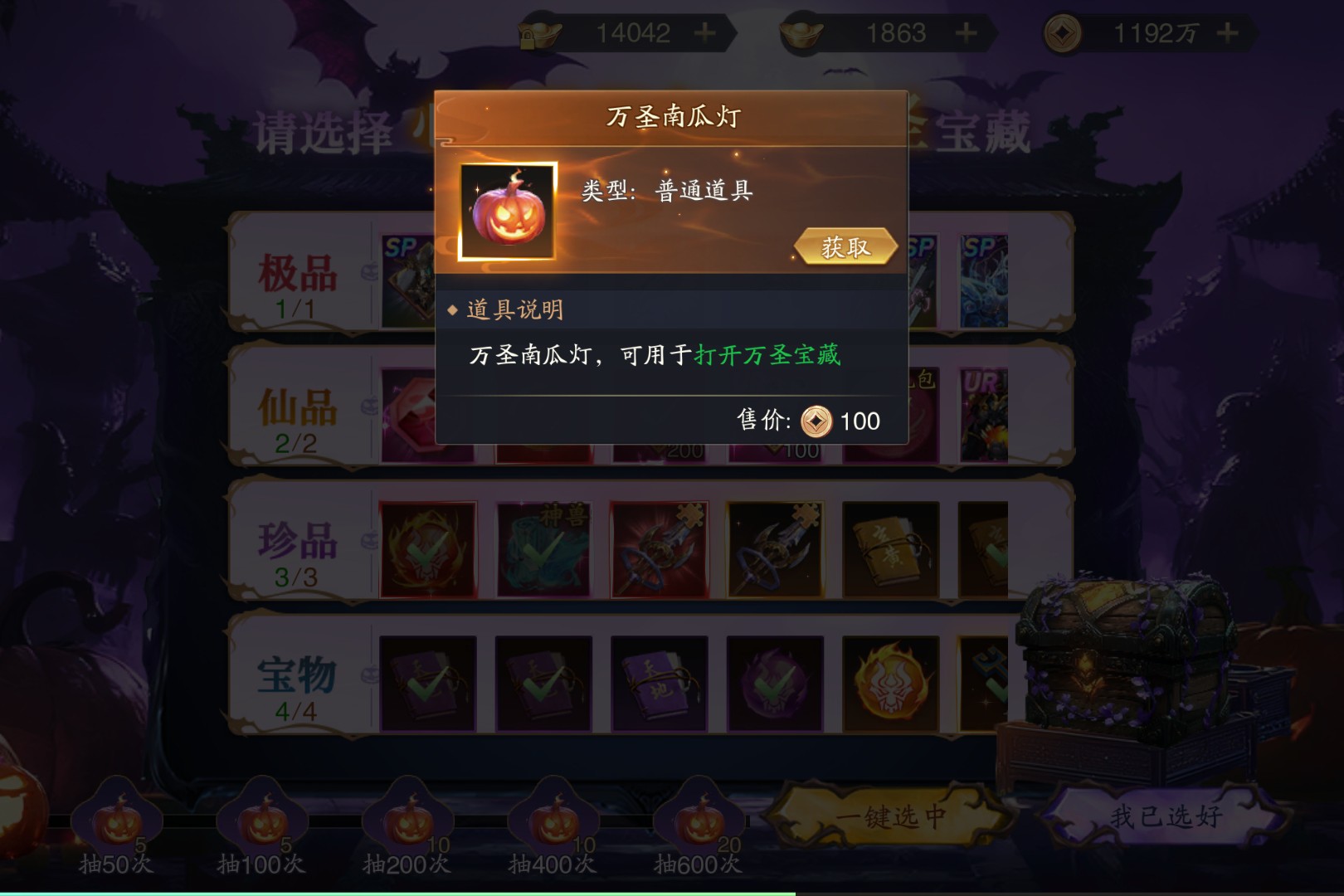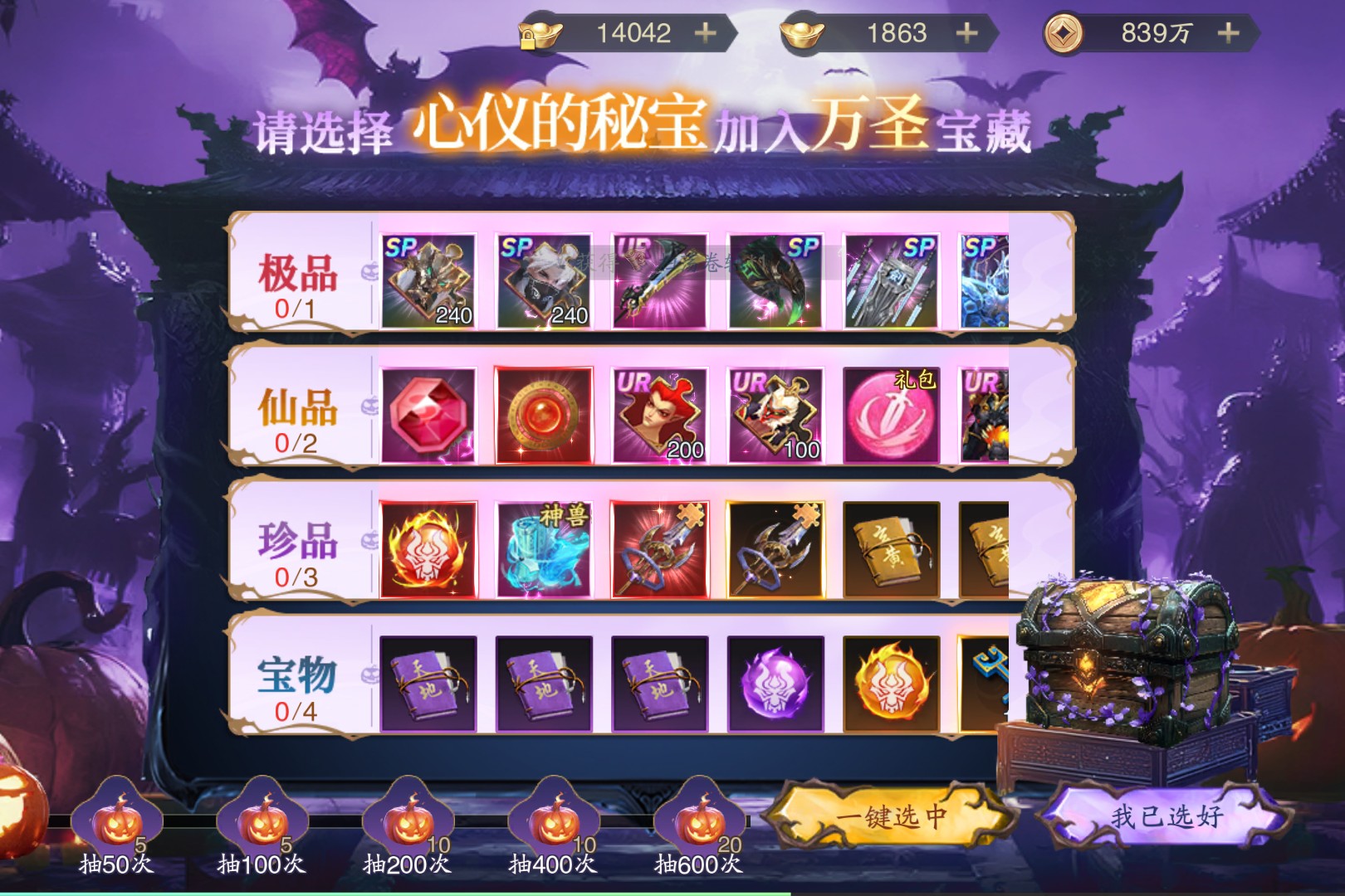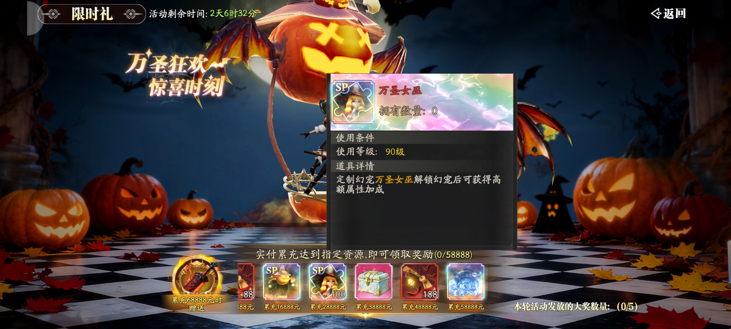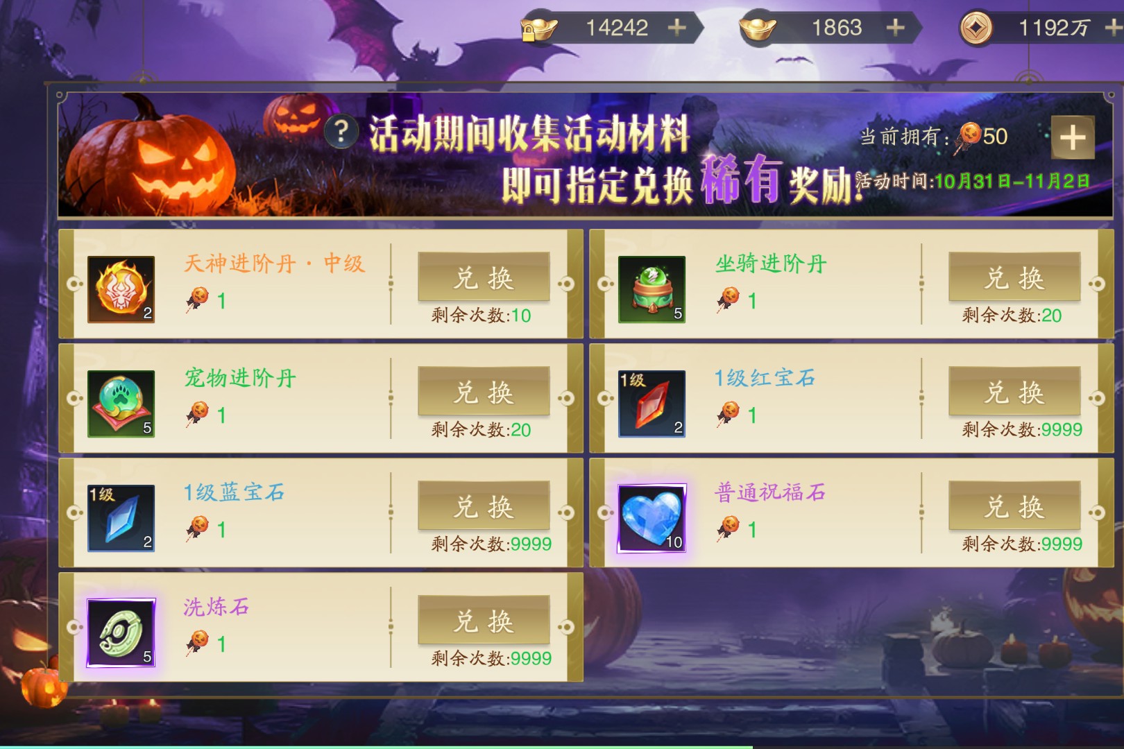 南瓜灯闪烁着诡异又诱人的光芒,蝙蝠在夜空中盘旋,骷髅与古堡为背景更添奇幻氛围,一场稀有奖励兑换活动火热开展。活动材料收集后可指定兑换诸多珍稀好物,既有毒敌大王碎片、真武大帝碎片等强力角色碎片,黑焰灰烬、剧毒蝎刺等极品装备道具,也有真武剑匣、天外古神等特殊物品,还有粉4星神兽装备自选礼包、神幻石等实用资源。同时,也提供天神进阶丹·中级、坐骑进阶丹、宠物进阶丹等养成道具,以及1级红宝石、1级蓝宝石、普通祝福石、洗炼石等基础强化材料。多样奖励覆盖角色、装备、养成、强化等多个维度,满足玩家不同需求,让你在万圣活动中收获满满。