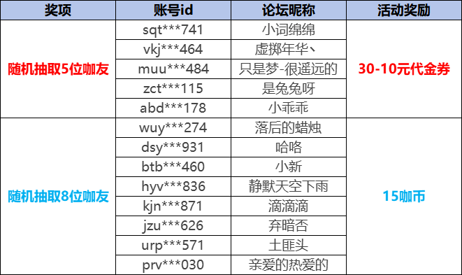 感谢咖友们的积极参与,让我们来看看是谁中奖了~恭喜以上获奖的咖友啦,社区奖励将在7个工作日内发放。——分割线——《风暴之眼》将于9月12日10:00震撼上线,疯狂福利,参与活动赢福利代金券!现在参与预约活动不仅可以第一时间收到上线消息提前体验,参与活动即有机会获得30-10元代金券奖励!只要在本帖下方评论区按要求发送截图,我们将抽取数位咖友送上丰厚代金券和咖币等豪礼!【活动时间】即日起-9月14日【参与方式】在本帖评论区分享预约游戏或首发后体验游戏截图或五星好评截图、评论,即可参与~【活动奖励】精英体验礼:随机抽5位咖友赠送30-10元代金券奖励!精英集结礼:随机抽5位咖友获得15咖币集结奖励!(有效参与人数每增加30人集结礼奖励加3份)【温馨提示】1、活动结束后,3个工作日内在原帖公布获奖名单,7个工作日内发放奖励;2、抄袭复制他人图片,不符合活动要求或者违反社区行为规范的回贴,取消获奖资格;3、活动期间到奖励发放完毕前,请咖友们不要更改昵称或删评论,避免奖励发放失败;4、本次活动解释权归《大咖玩》运营团队所有。点击下方游戏图标预约参与吧!↓↓↓↓↓