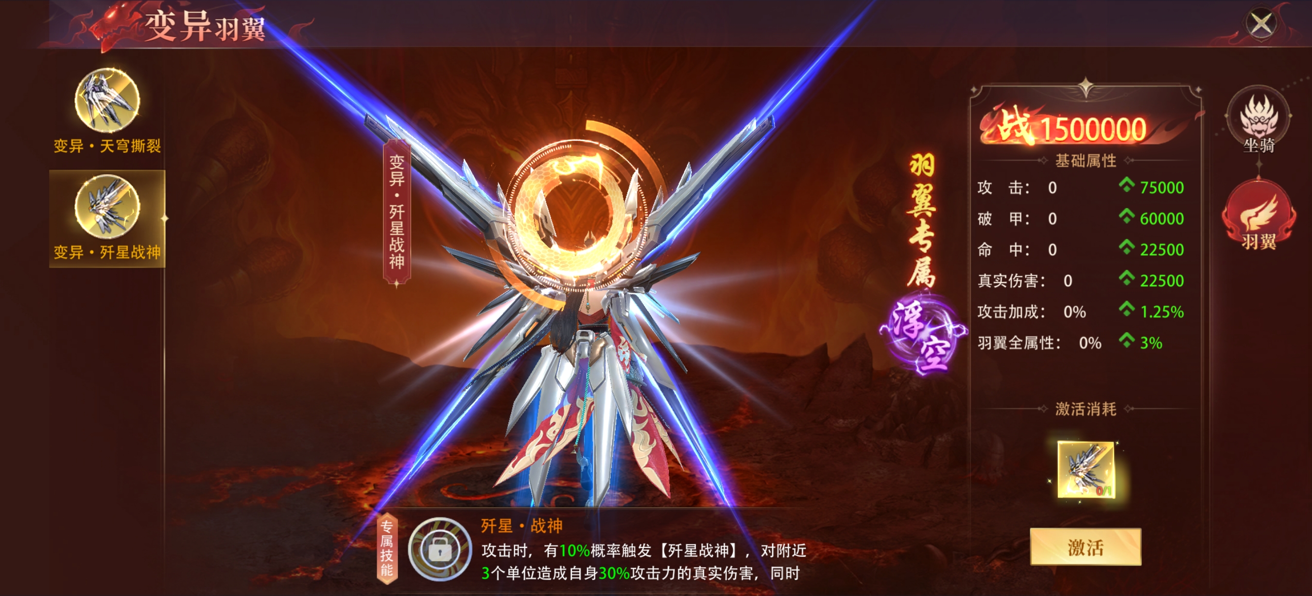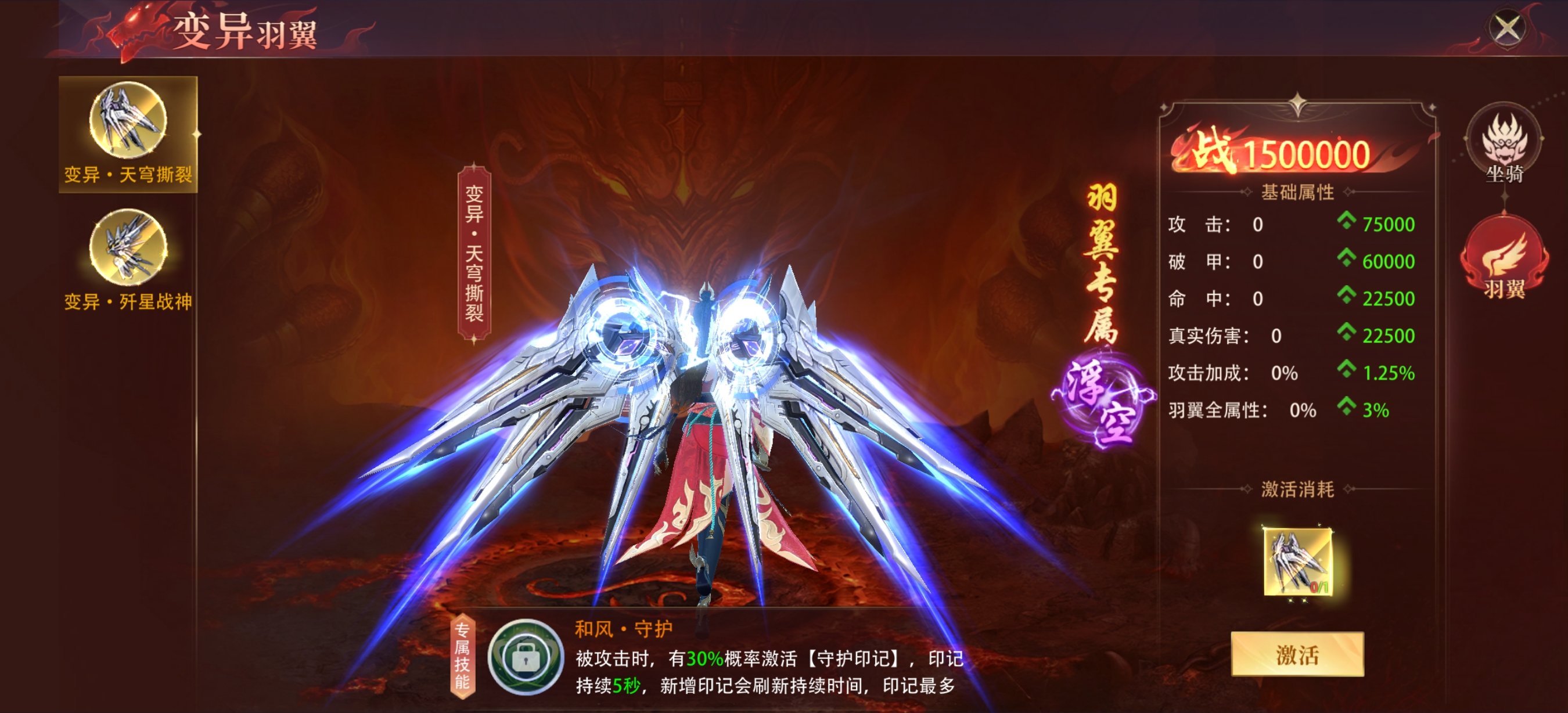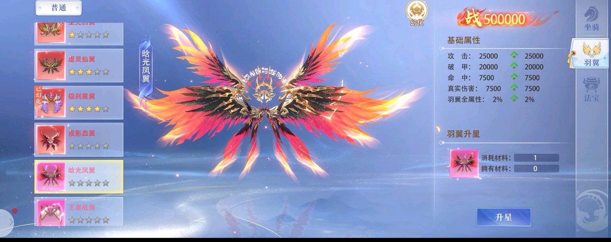 变异羽翼-天穹撕裂基础属性 攻击:+75000,属于高额直接攻击加成,能直接提升角色的输出基础,对依赖普攻、技能伤害的角色增益明显。 破甲:+60000,可有效降低目标的防御减免效果,让角色的攻击能更高效地转化为实际伤害,面对高防御敌人时优势突出。 命中:+22500,能提升技能或普攻的命中率,减少因MISS导致的伤害损失,保障输出的稳定性。 真实伤害:+22500,无视目标的防御、抗性,可直接作用于目标生命值,在面对带有高额抗性、减伤机制的BOSS时,是突破伤害瓶颈的关键属性。 攻击加成:+1.25%,属于百分比攻击加成,会基于角色自身基础攻击进行额外增益,角色基础攻击越高,这部分加成的收益越可观。 羽翼全属性:+3%,可提升羽翼自身的各项属性成长效率,后续升级羽翼时,能获得比其他羽翼更高的属性提升幅度。 该羽翼属性偏向纯输出,各项属性都围绕提升伤害设计,适合追求极限输出的玩家,尤其在挑战高难度副本、BOSS战时,能充分发挥其伤害优势。而且它的属性收益和角色基础属性挂钩,角色自身属性越高,羽翼带来的战力提升越显著,对于已经养成的高面板角色来说,性价比极高。