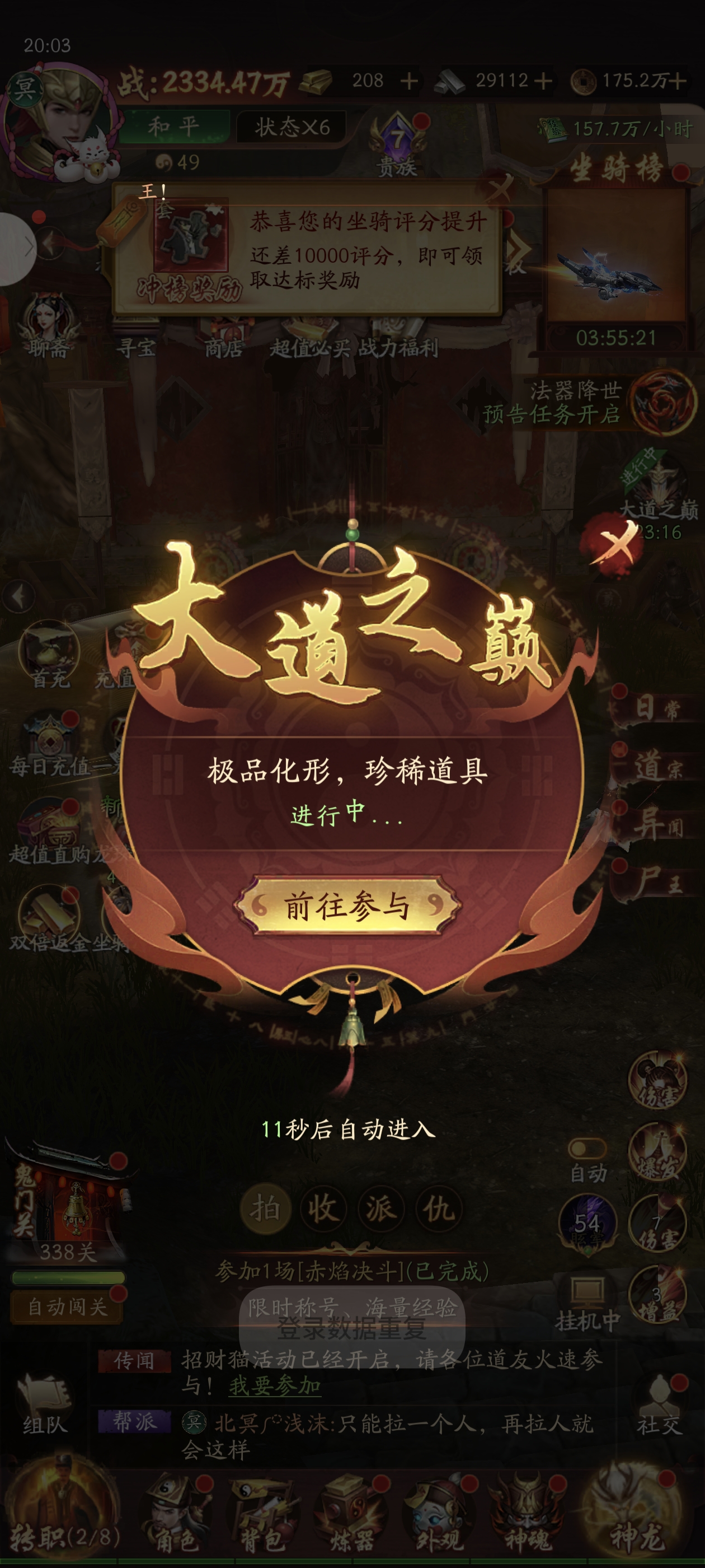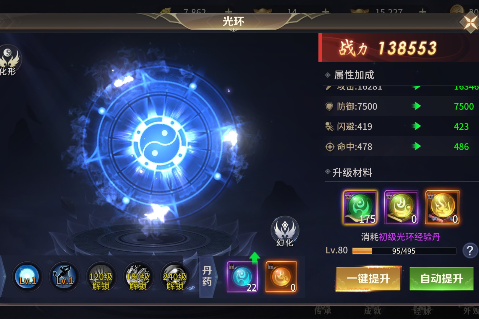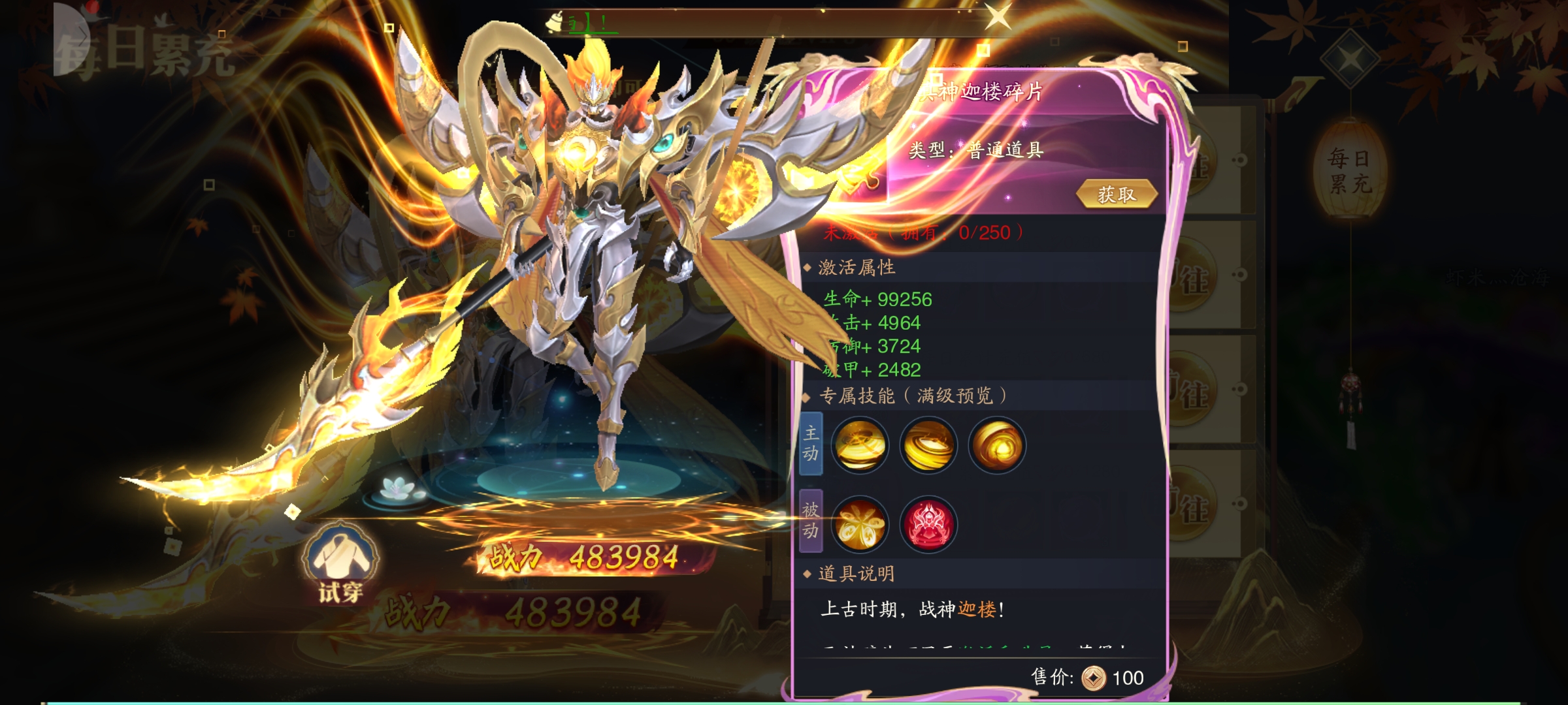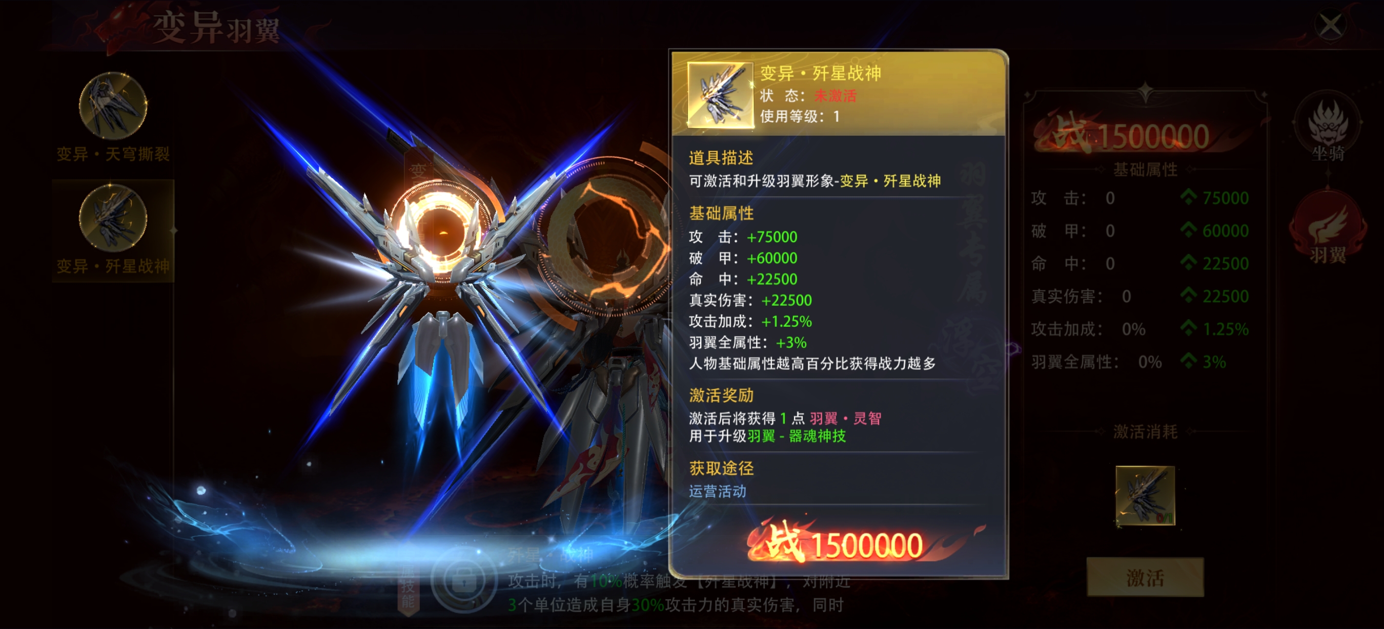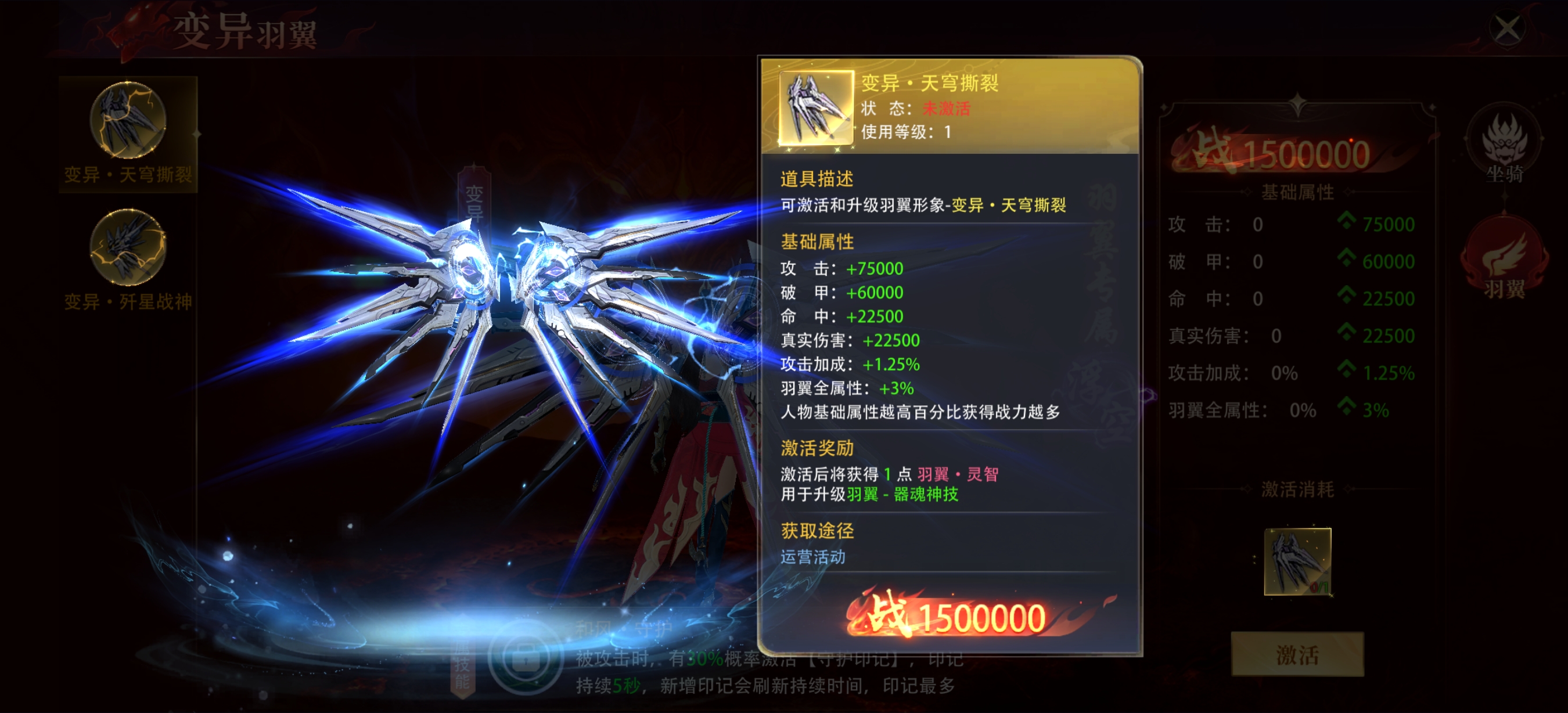 基础属性点评 攻击与破甲:+75000攻击、+60000破甲的组合,能直接提升角色的输出基础,尤其对高防御目标的伤害压制效果显著,是核心输出属性。 命中与真实伤害:+22500命中可有效降低目标闪避率,保障输出稳定性;+22500真实伤害无视目标防御,能对各类怪物造成稳定伤害,打BOSS时优势明显。 百分比加成:1.25%攻击加成、3%羽翼全属性加成,能和角色自身基础属性联动,基础属性越高,额外战力提升越可观,适合后期堆属性的角色。 从属性和技能来看表现会尤为突出,高破甲、真实伤害搭配角色自身高基础属性的话,战力提升会非常显著。
