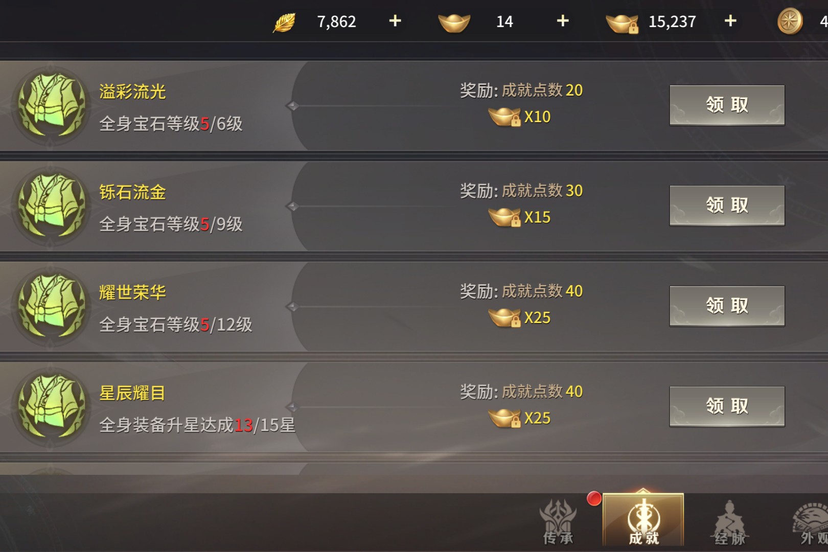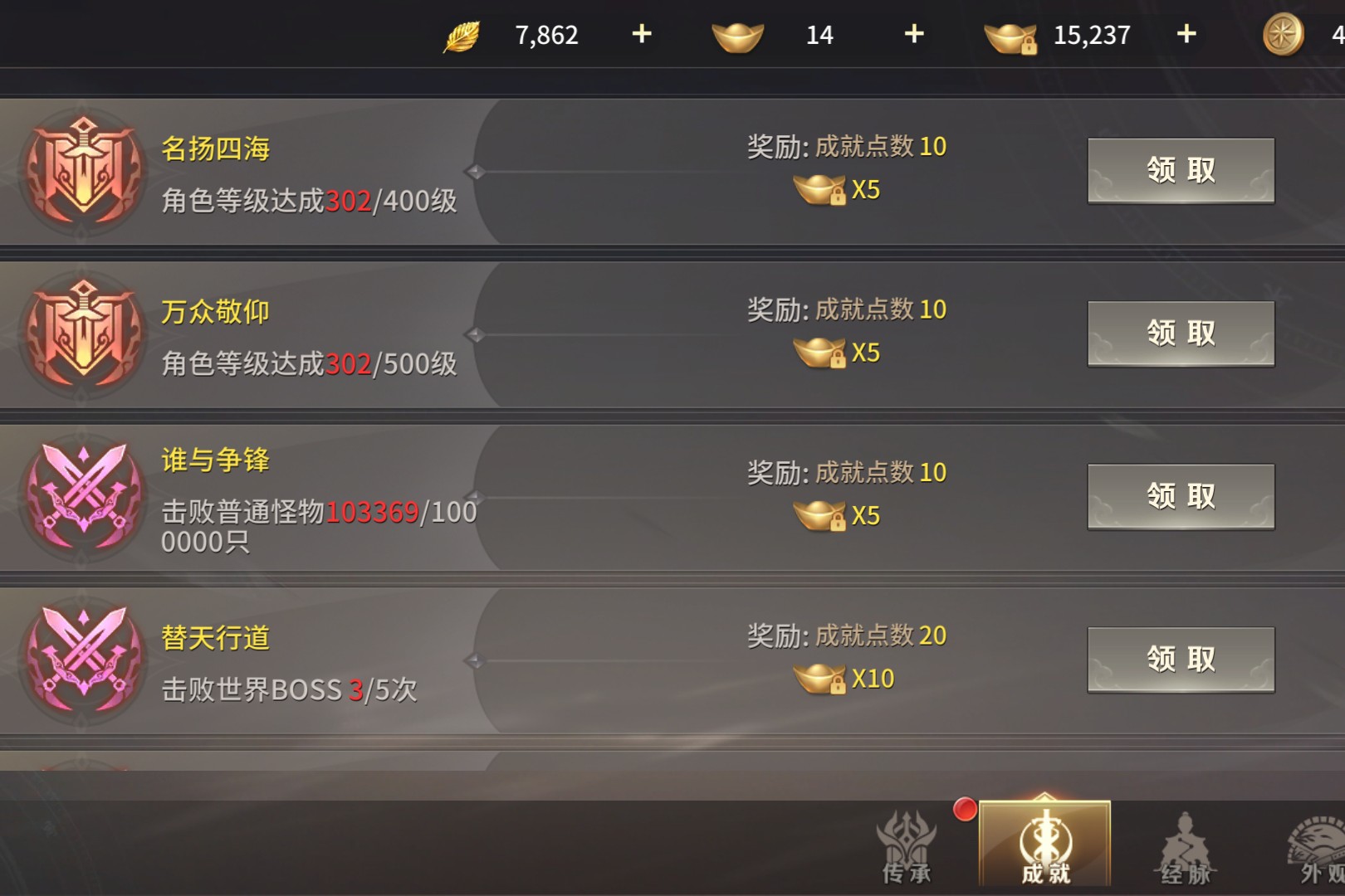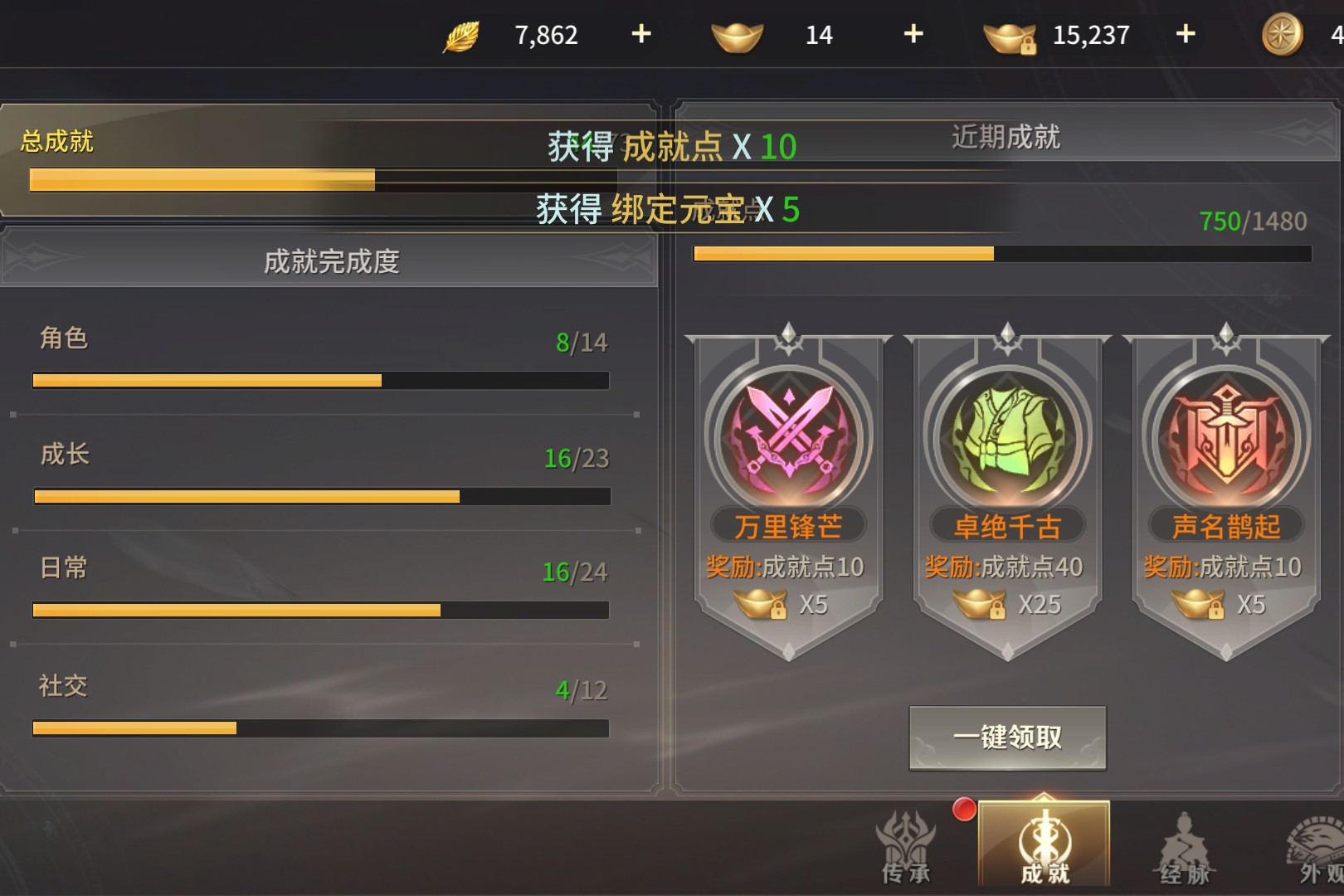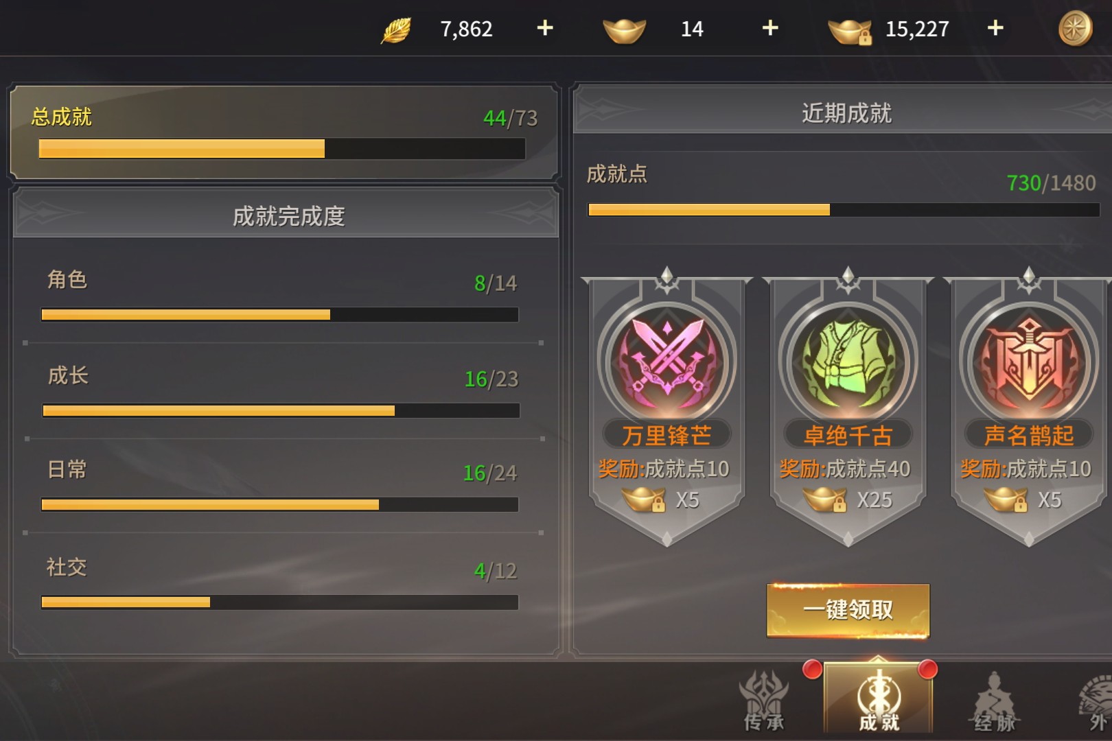 金黄进度条爬过“总成就4/73”的刻度,“万里锋芒”“卓绝千古”的勋章在近期成就栏里闪着光这是江湖路的注脚:角色、成长、日常的进度条里,藏着刷本的深夜、做任务的清晨,每一格进度都是指尖磨出的痕迹。“一键领取”按下的瞬间,成就点从730跳至750,绑定元宝多了5枚,弹窗里的数字是努力的回甘。8/14的角色成就、16/23的成长成就,不是完美的满格,却是步步踏实的证明;社交成就4/12的留白,是等着组队副本、好友互动来填满的期待,成就栏从不是冰冷的数字,是“我来过、我打过、我成长过”的凭证。进度条会慢慢爬满,勋章会越攒越多,那些未完成的成就,都是下一段江湖故事的伏笔。
