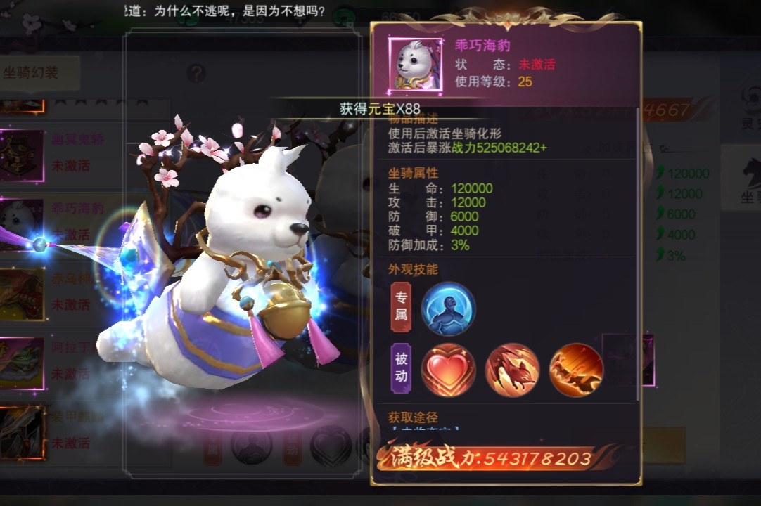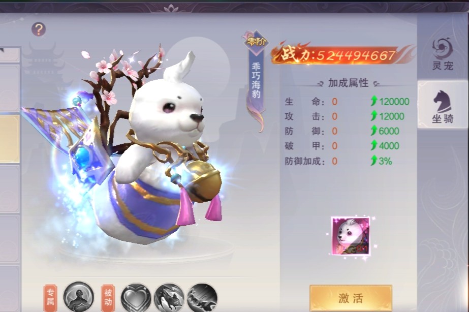 乖巧海豹凭借软萌造型圈粉无数,25级即可解锁,零阶状态就拥有524494667的战力,激活后更是直接暴涨525068242点战力,满级战力达到543178203,萌系外观下藏着惊人的战力潜能。属性加成上也十分亮眼,能带来生命120000、攻击12000、防御6000、破甲4000的基础提升,还附带3%的防御加成,让角色的生存能力再上一个台阶。纯白的海豹搭配粉紫飘带与梅花枝装饰,周身环绕的蓝光特效更添灵动,专属与被动技能还能进一步强化实战效果。这款萌系坐骑的获取途径虽未明确展示,但仅凭颜值与战力的双重优势,就足以让仙友们心动不已,赶紧寻找获取方式将这只可爱海豹收入囊中吧!