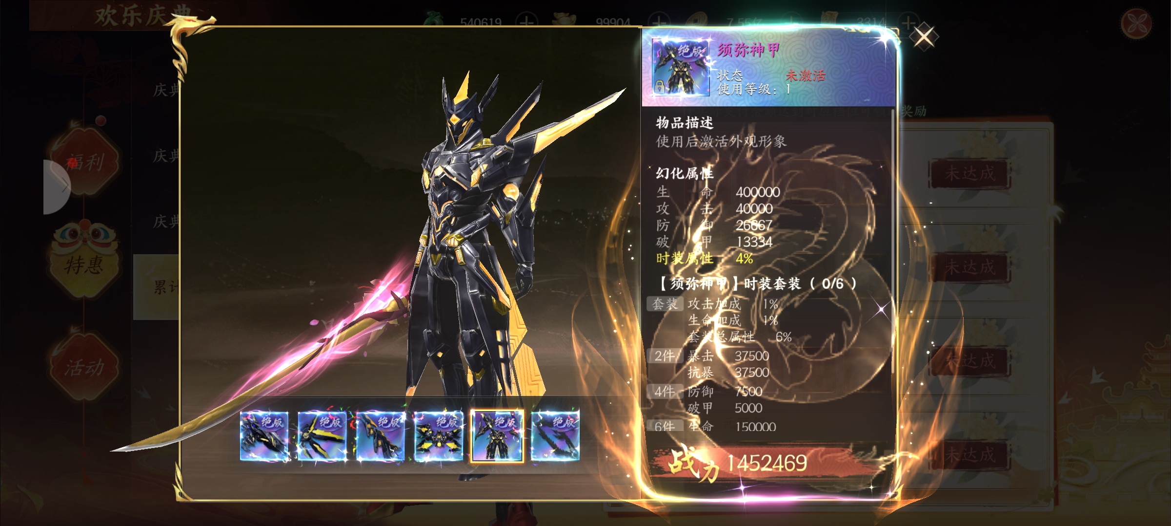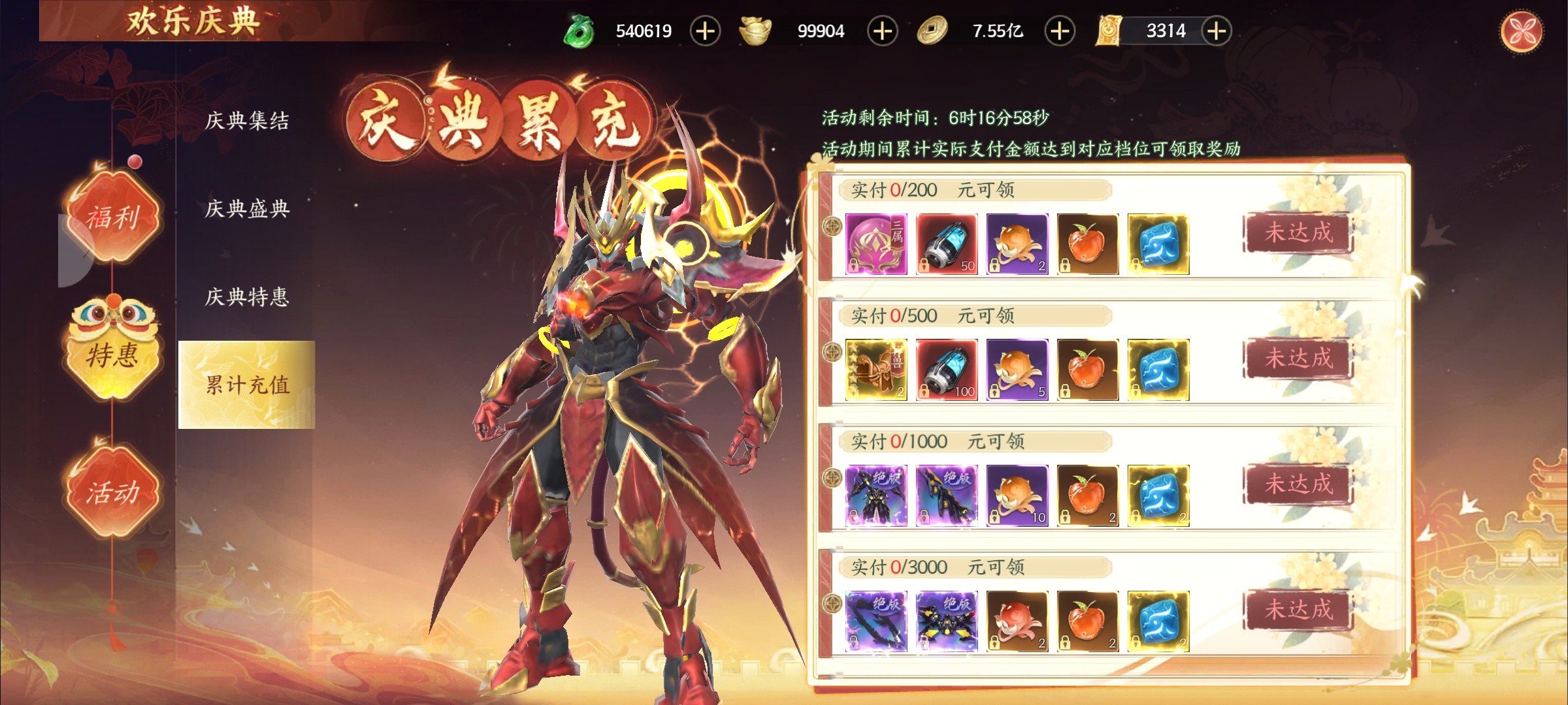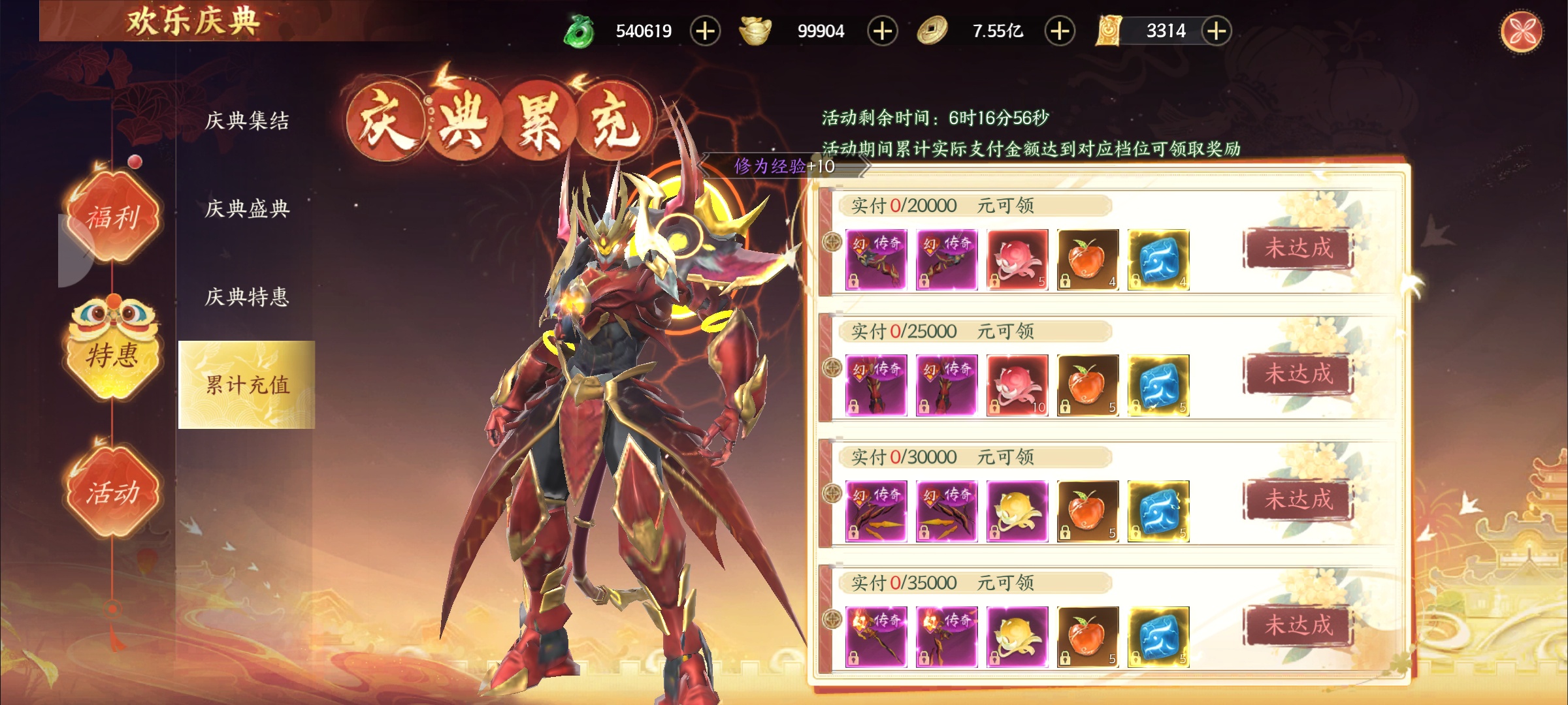 这游戏的欢乐庆典累充活动,直接把氪金的层次感拉满了!从200元到35000元的档位层层递进,奖励更是一个比一个夸张,两千档就能拿到朱雀左臂机甲部件,攻击直接飙到199999,光一个部件战力就破四百万,机甲造型还帅得炸裂;一万档解锁的须弥神甲套装,单件加4万攻击,六件套凑齐更是能叠15万生命,战力直接冲145万。 + 最狠的是3万档的天极丹,不仅加极道攻击和护盾,还能给神兵阁属性提2%,越氪战力加成越离谱。看着这些华丽的机甲和逆天的属性,再瞅瞅自己的钱包,只能感叹这庆典不是欢乐庆典,是“钞能力”庆典啊,零氪玩家只能默默围观大佬们的机甲秀了!