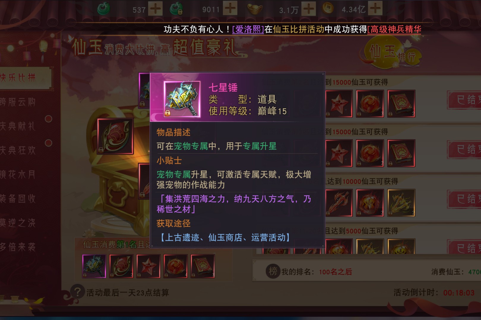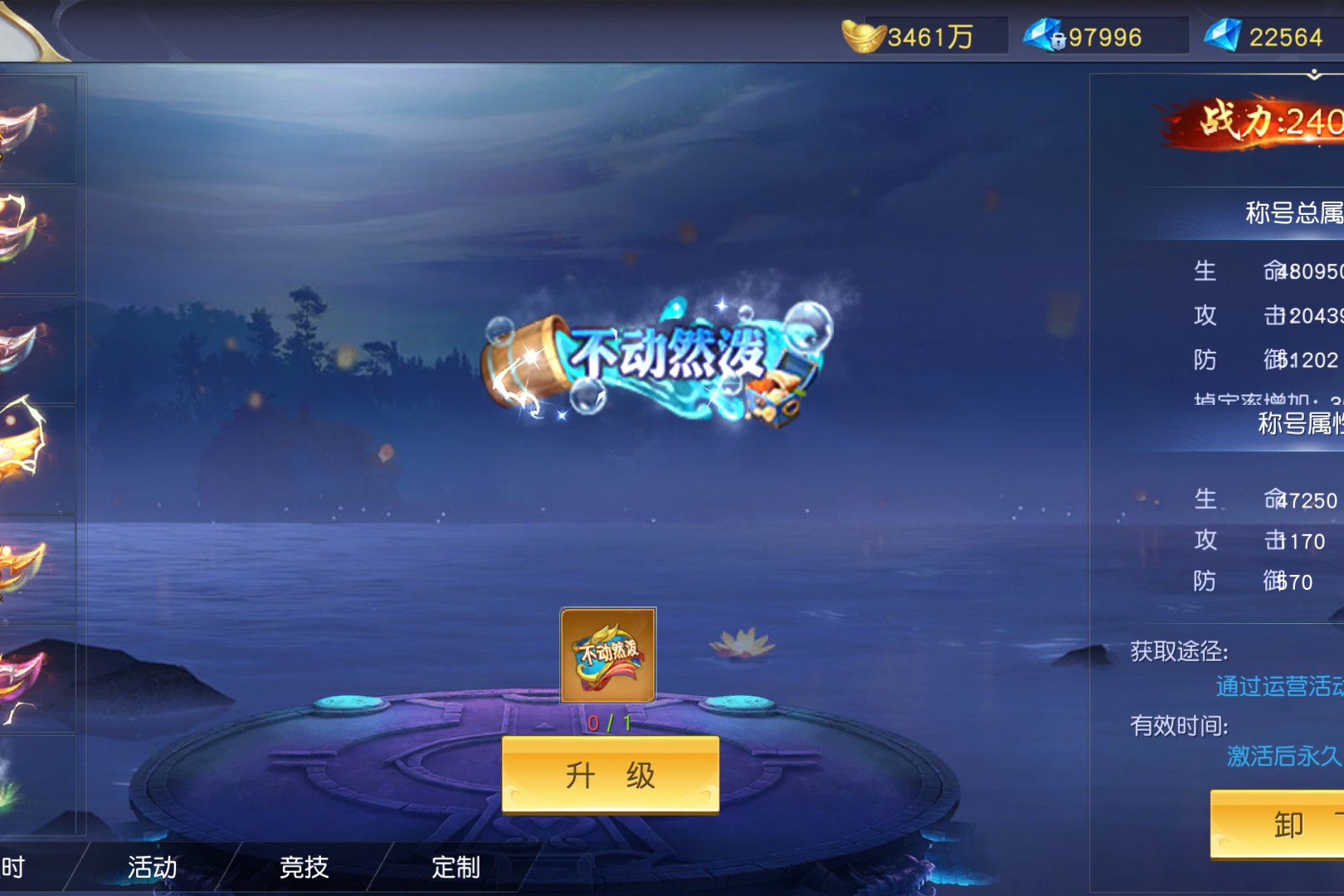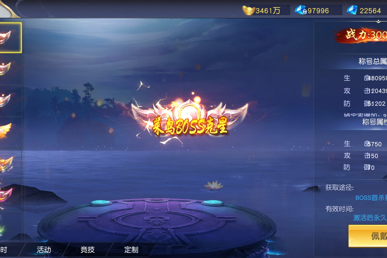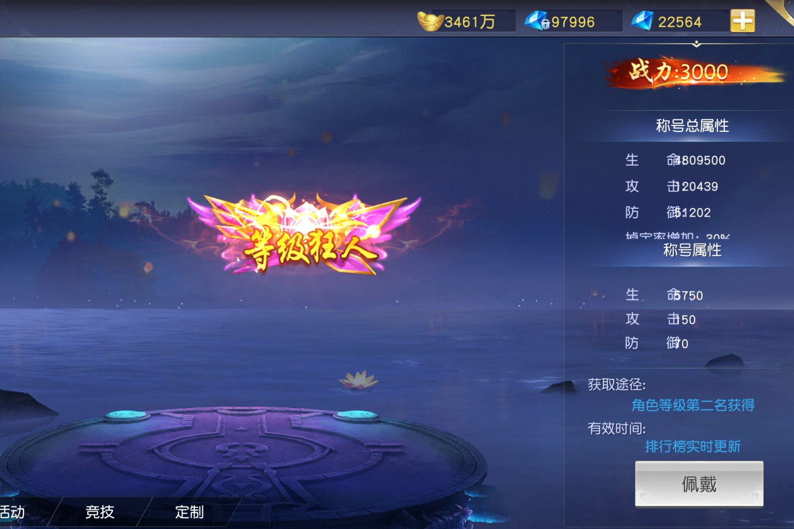 角色的限时称号中“七曜星君”“等级狂人”“冲级先锋”等标识如竞速的旗帜,凝视“七曜星君”,金色光效裹挟着“封神台占领奖励”的荣耀,8500生命、470攻击的加成,是占领仙位的实力证明;切换到“等级狂人”,粉紫羽翼般的特效闪烁,“等级第二名”的获取途径,记录着当初冲级时的争分夺秒;再看“冲级先锋”,翠绿光翼下藏着“等级第四至十名”的印记,是那段疯狂刷级时光的勋章。这些称号不仅是外观的炫彩点缀,更像一本本“冲级日记”:从“冲级先锋”的起步,到“等级狂人”的追赶,再到“七曜星君”的巅峰,每一枚都叠加着生命、攻击属性,让战力在冲级的赛道上越跑越快。