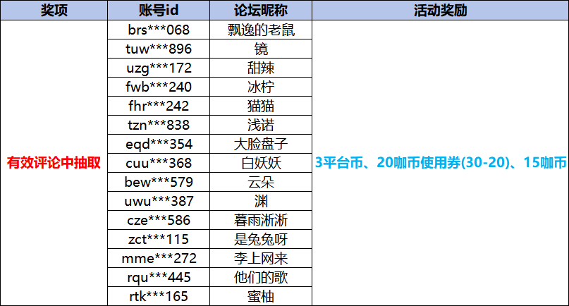 感谢咖友们的积极参与,让我们来看看是谁中奖了~恭喜以上获奖的咖友啦,社区奖励将在7个工作日内发放。——分割线——《千年寻仙》于1月9日开启付费删档测试!测试期间大量咖币限免!为了更好地了解各位咖友的游戏体验,现开启游戏问题&意见反馈收集活动!倘若您在游玩的过程中,遇到任何游戏问题或者有想提供的建议,都可以在本帖告诉小咖哟!小咖定会把咖友们的话放在心上并认真记录!步入寻仙之旅,您提BUG、建议,我发奖! 【活动时间】1月9日-1月16日【参加方式】前往本帖评论区留言游玩《千年寻仙》遇到的游戏问题描述/问题截图、玩法体验等都可!例子:遇到了XXXX,我希望XXXX。 【活动奖励】有效评论选出15名参与反馈并提出优质意见的咖友送出:3平台币、20咖币使用券(30-20)、15咖币!【温馨提示】1、活动结束后,3个工作日内在原帖公布获奖名单,7个工作日内发放奖励;2、不符合活动要求或者违反社区行为规范的活动帖,取消获奖资格;3、活动期间到奖励发放完毕前,请咖友们不要更改昵称或删帖,避免奖励发放失败;4、本次活动解释权归《大咖玩》运营团队所有。