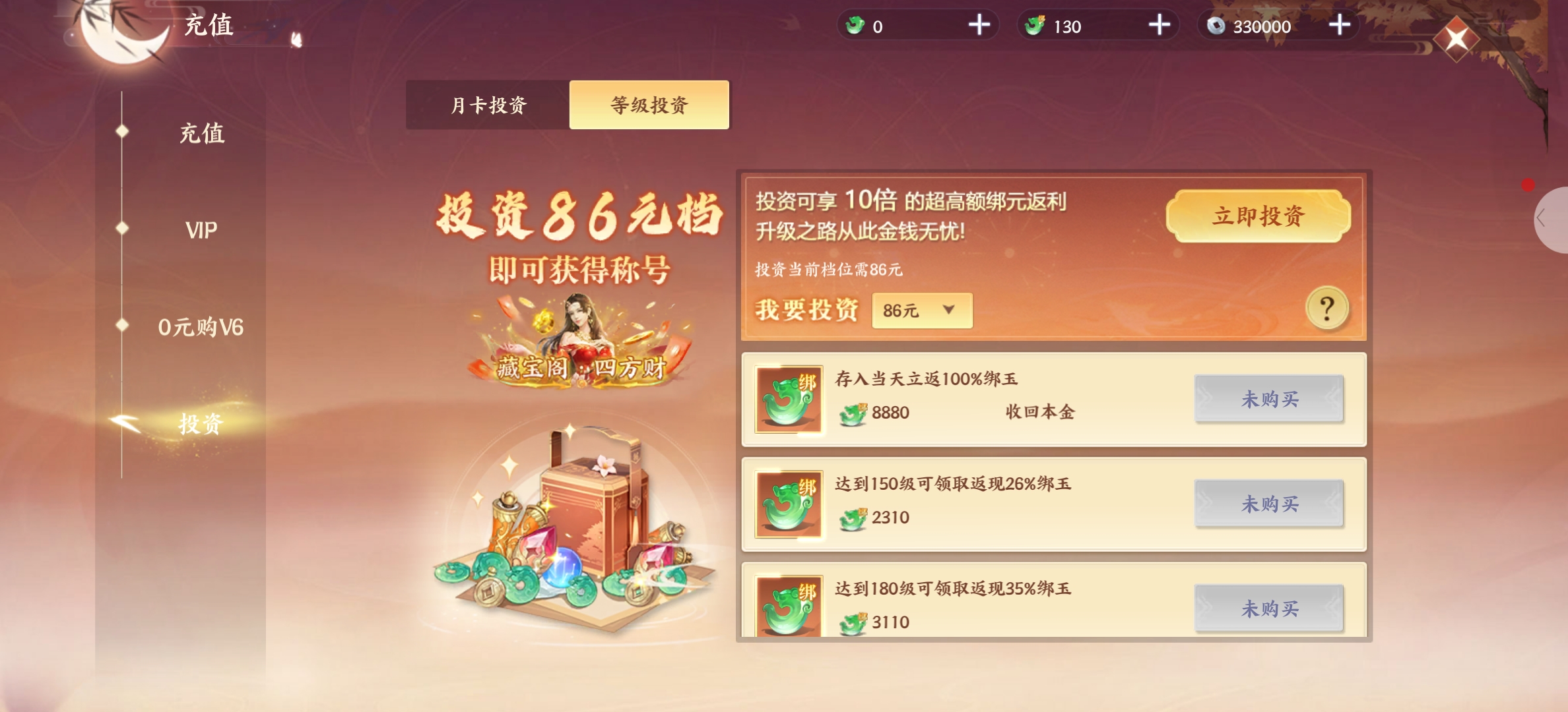 限时0元购,包括璀璨星光幻影,六芒星阵法阵,背饰慕春碧玉,坐骑蓬莱仙萌,时装妙手仁医,宠物百宝金鼠,武饰揽风羌笛,背饰伏羲古琴,三天全额返还
