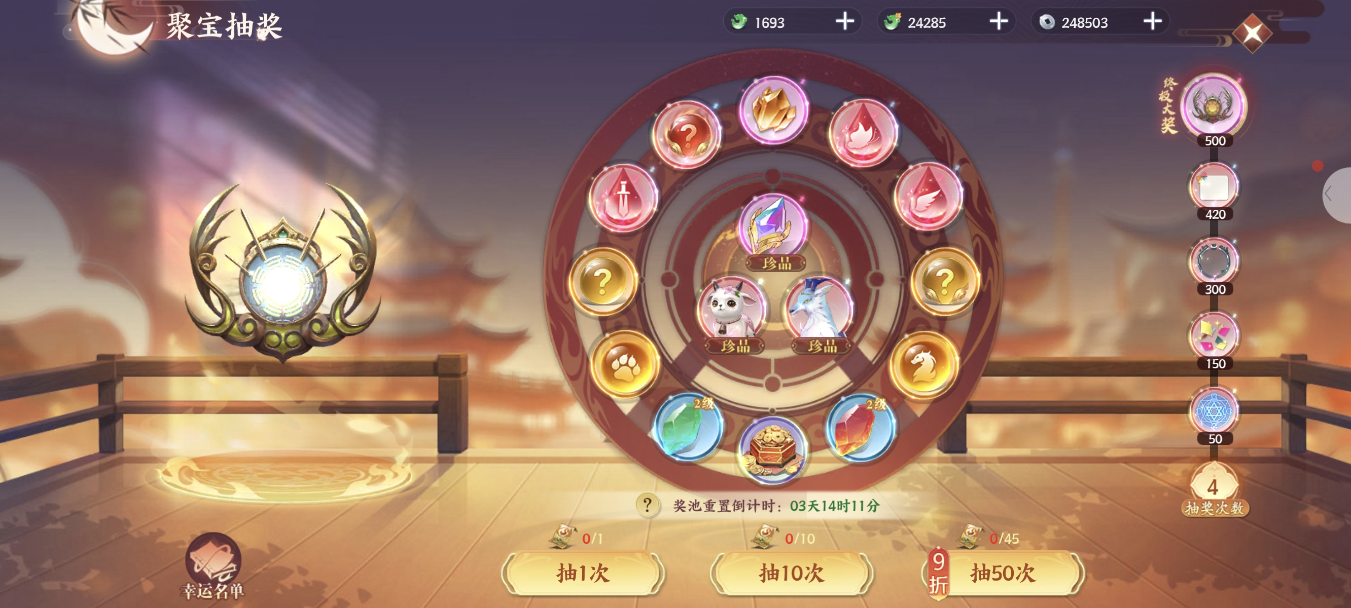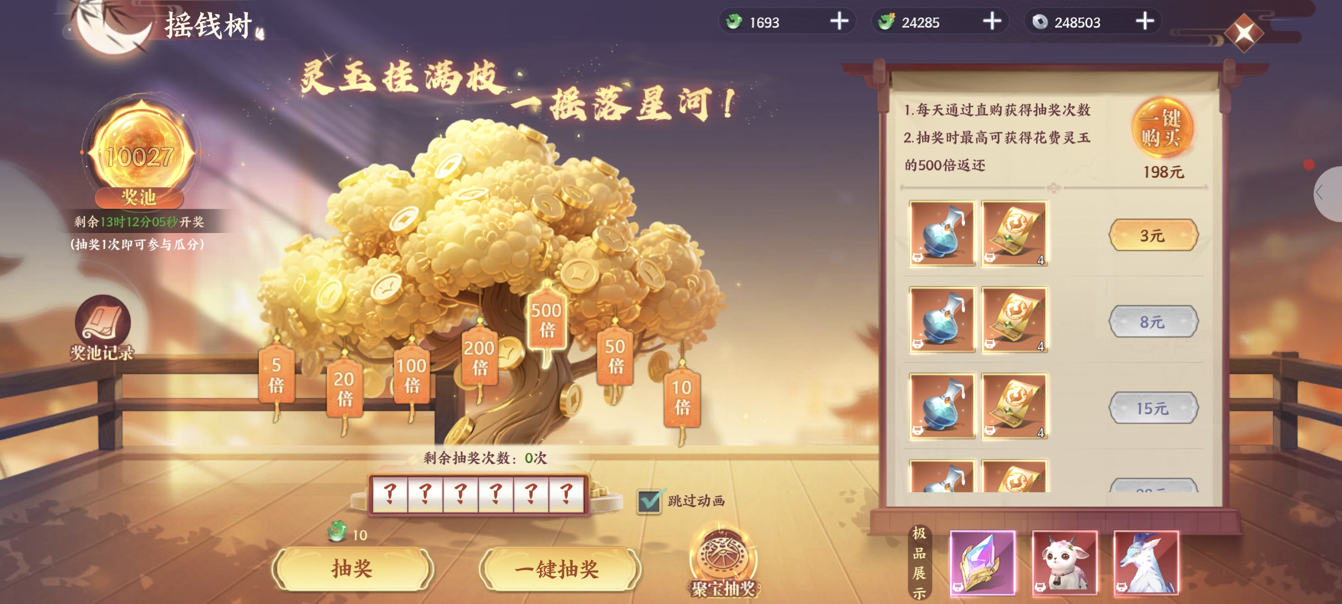 灵玉挂满枝,一摇入星河。每天通过直购获得次数,抽奖时可能会获取花费灵玉的500倍返还,听上去很诱惑人。抽奖一次即可瓜分当前奖池,每日的23点抽取幸运儿,瓜分奖池里的灵玉