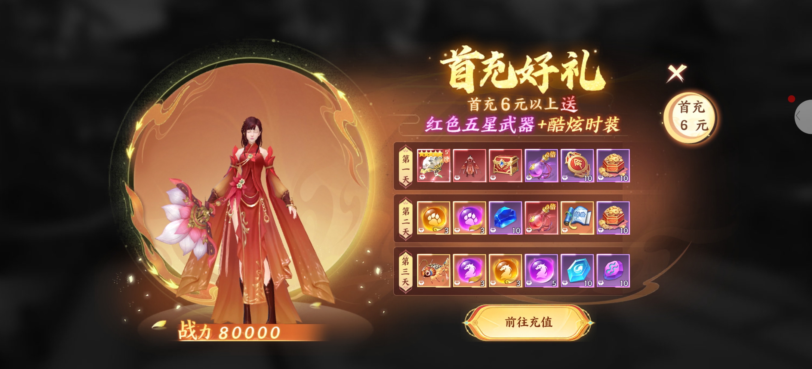 充值68元连续7天领取奖励,价值32888仙玉好礼 第一天可激活击败特效“慢走不送”and时装“侠影剑心” 第二天可领取橙色圣魂自选箱and随机的一个神魄 第三天可领取红色保底石and随机的高级精华 第四天可领取6级红宝石and随机的一个神魄 第五天可领取红色保底石and随机神魄 第六天可领取6级绿宝石and随机神魄 第7天可领取金色闪光and武饰-百战天剑