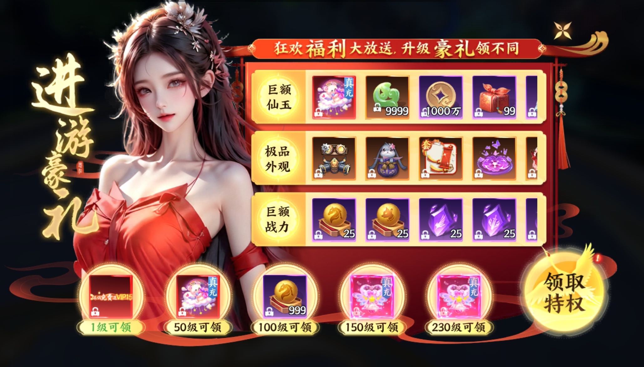 大道争锋,舍我其谁!红颜相随,真充领不停,开启零氪畅爽修仙之旅。 进游即享狂欢福利,升级豪礼层层解锁,1级领特权、50级领真充、100级领海量资源、150级与230级再送珍稀真充,巨额仙玉、极品外观、高额战力道具一键全拿,轻松起步快人一步。 每日累充福利加码,充值达标即领海量材料、珍稀道具,助力战力狂飙;通天教主霸气登场,战力直破75万,尽显仙王风范。 更有红颜赠礼返现福利,比心小熊等道具赠送即可得高额仙玉返现,激活白嫖特权,每日赠礼额度最高提升4500元,真充福利领不停。 从凡人到仙尊,无需氪金,福利拉满,红颜相伴,战力一路飙升,轻松称霸仙侠世界,尽享大道争锋的极致快感!