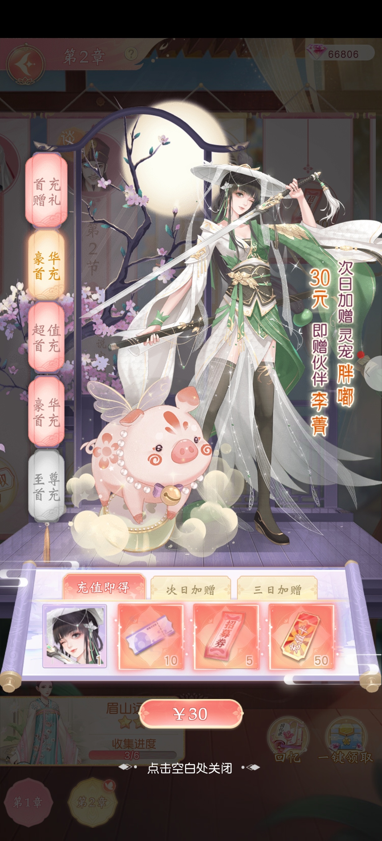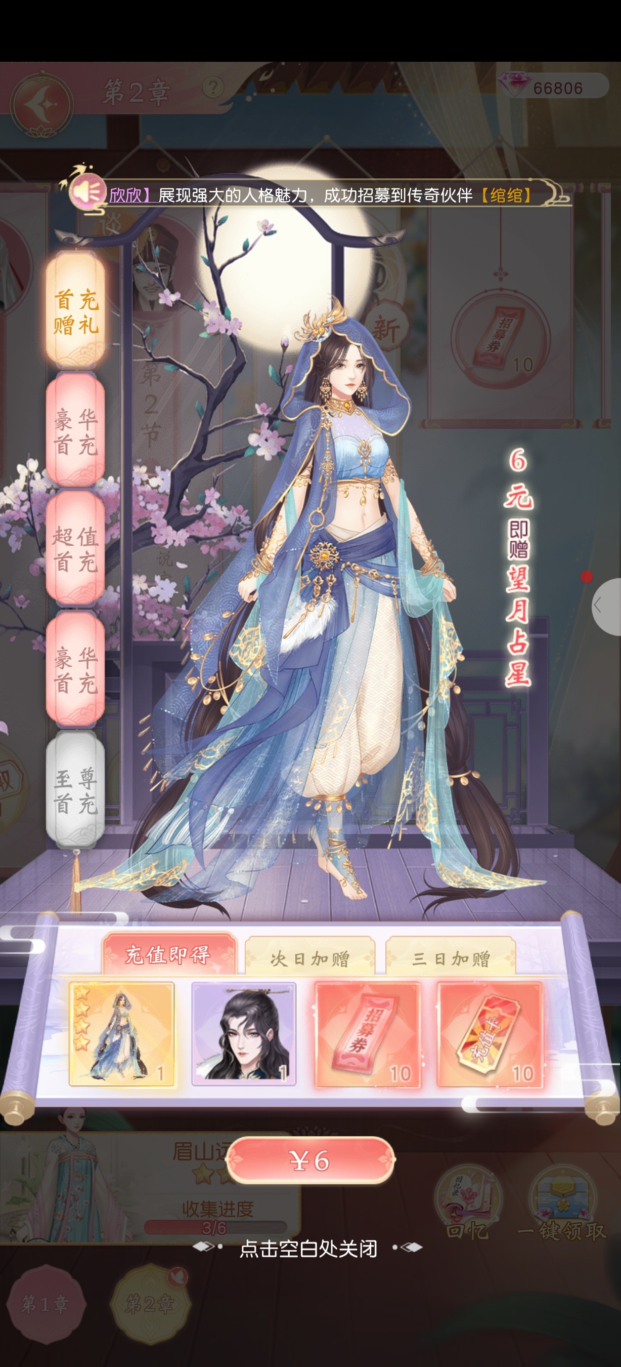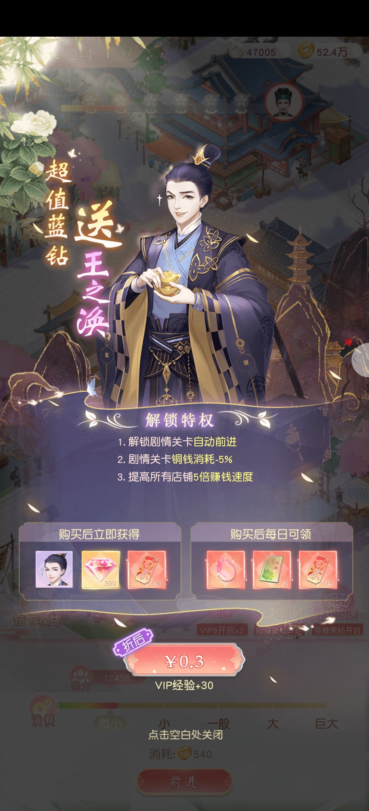 古韵华裳,一眼心动 + 氪金性价比:小额投入,超值回报 + 1.+6元首充档:新手必入,颜值+资源双丰收 + -+核心奖励:望月占星套装+传奇伙伴绾绾+招募券×20,颜值党直接拿下限定外观,前期伙伴助力推图,性价比拉满。 -+优势:价格亲民,外观唯一,资源覆盖前期养成,无压力入手。 + 2.+30元首充档:侠风养成,战力+萌宠双加持 + -+核心奖励:伙伴李菁+灵宠胖嘟+大量招募券/充值卡,侠女角色适配江湖剧情,灵宠提升养成乐趣,资源量翻倍。 -+优势:角色+宠物双解锁,养成线更丰富,适合想深度体验的玩家。 + 3.+0.3元超值蓝钻:性价比之王,特权+资源全解锁 + -+核心奖励:伙伴王之涣+300钻石+每日资源+三大特权(自动前进、铜钱消耗-5%、店铺5倍赚钱),0.3元解锁长期收益,堪称“白嫖级福利”。 -+优势:价格极低,特权覆盖剧情、养成、赚钱全场景,长期玩必冲。 +颜值碾压:每个档位立绘风格迥异,西域、江湖、贵公子全覆盖,满足不同审美偏好。 性价比炸裂:0.3元解锁长期特权,6元拿限定外观,30元解锁双养成,小额投入即可获得高价值回报。 界面逻辑简洁,奖励分层展示,降低氪金决策成本,新手友好度拉满。 +