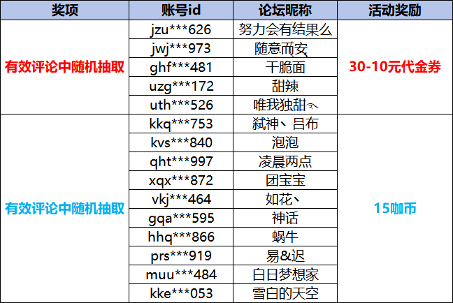 感谢咖友们的积极参与,让我们来看看是谁中奖了~恭喜以上获奖的咖友啦,社区奖励将在7个工作日内发放。——分割线——《吞噬星空:黎明》将于4月29日10:00首发上线,疯狂福利,预约赢福利代金券!现在参与预约活动不仅可以第一时间收到上线消息提前体验,参与预约活动即有机会获得30-10元代金券奖励!只要在本帖下方评论区按要求发送截图,我们将抽取数位咖友送上丰厚代金券和咖币等豪礼!【活动时间】即日起-4月28日【参与方式】在本帖评论区分享预约游戏或首发后体验游戏截图或五星好评截图、评论,即可参与~【活动奖励】精英体验礼:随机抽5位咖友赠送30-10元代金券奖励!精英集结礼:随机抽10位咖友获得15咖币集结奖励!【温馨提示】1、活动结束后,3个工作日内在原帖公布获奖名单,7个工作日内发放奖励;2、抄袭复制他人图片,不符合活动要求或者违反社区行为规范的回帖,取消获奖资格;3、活动期间到奖励发放完毕前,请咖友们不要更改昵称或删评论,避免奖励发放失败;4、本次活动解释权归《大咖玩》运营团队所有。点击下方游戏图标预约参与吧!↓↓↓↓↓