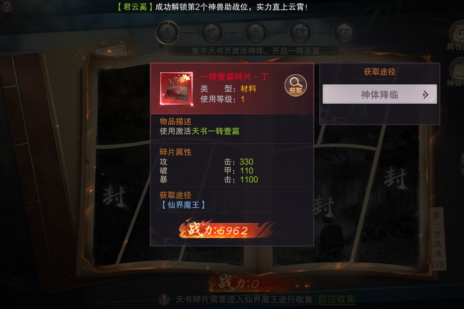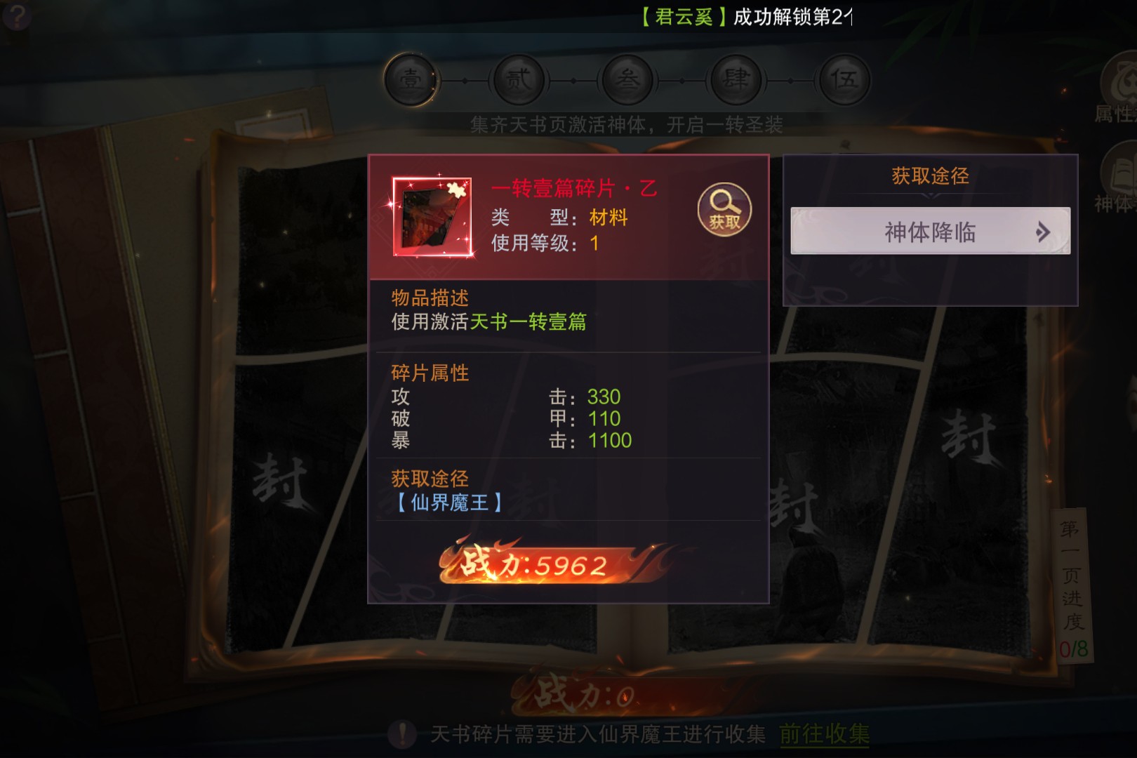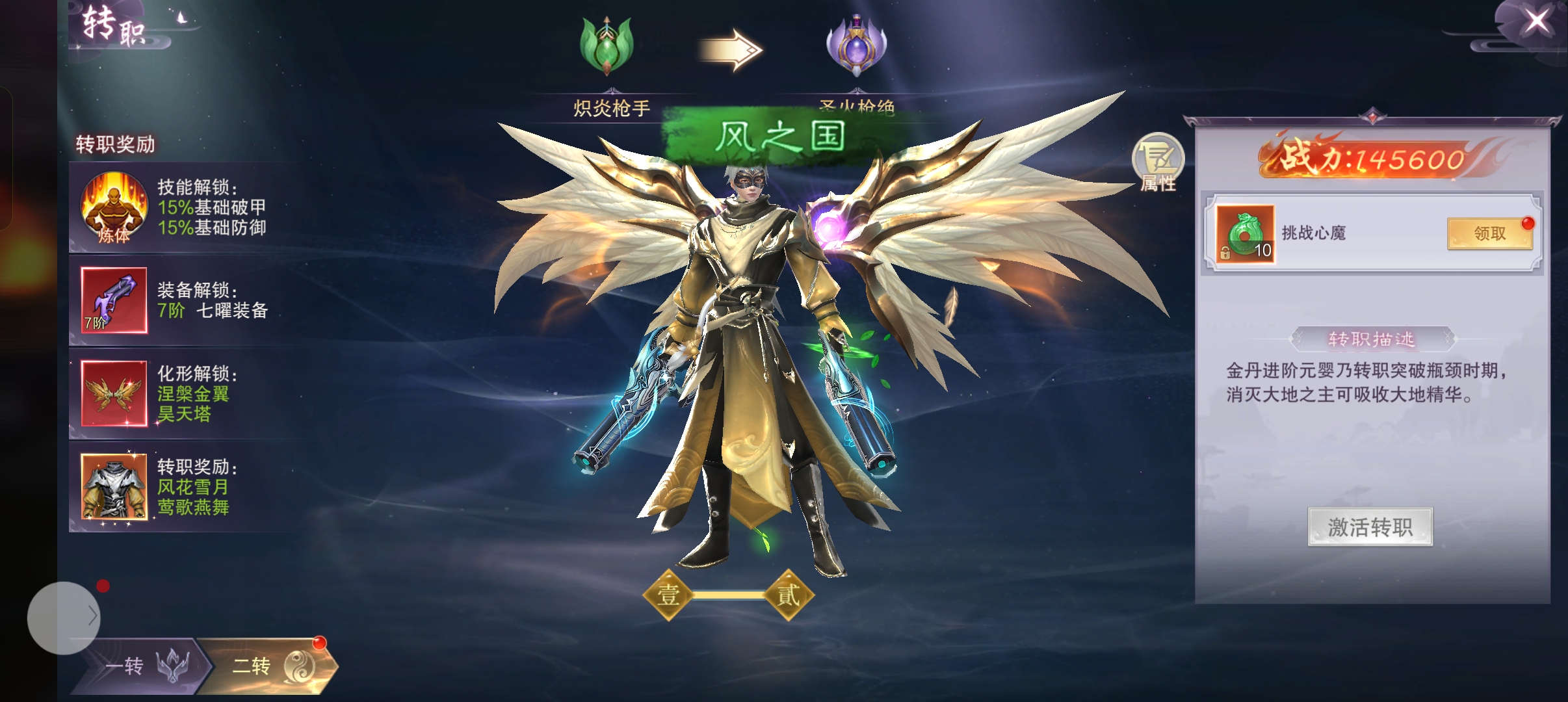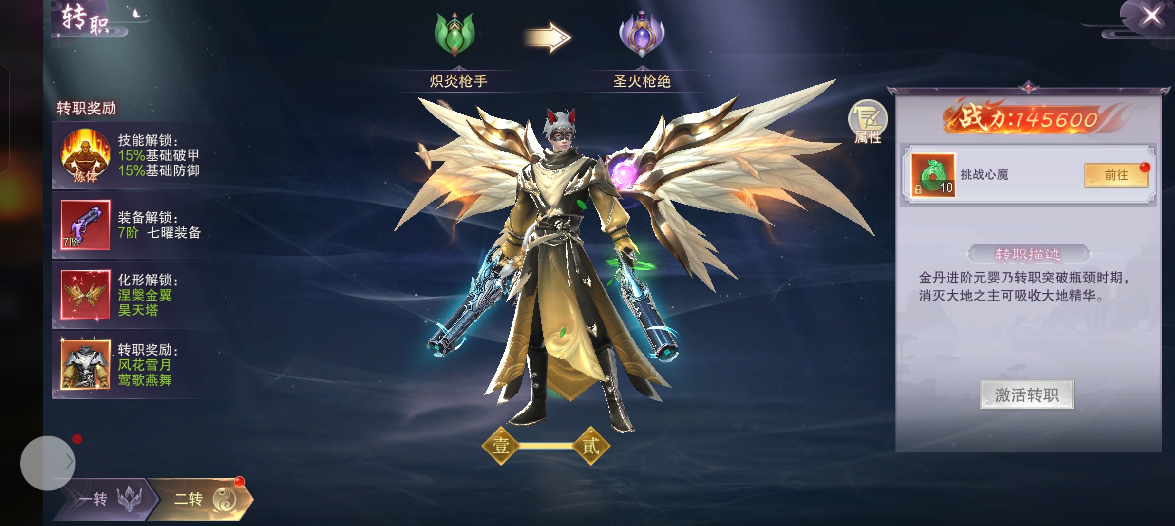 只有挑战心魔成功之后才能激活转职,不仅如此,还能激活转职被动技能归神,通关之后还会奖励一个头像:名扬天下