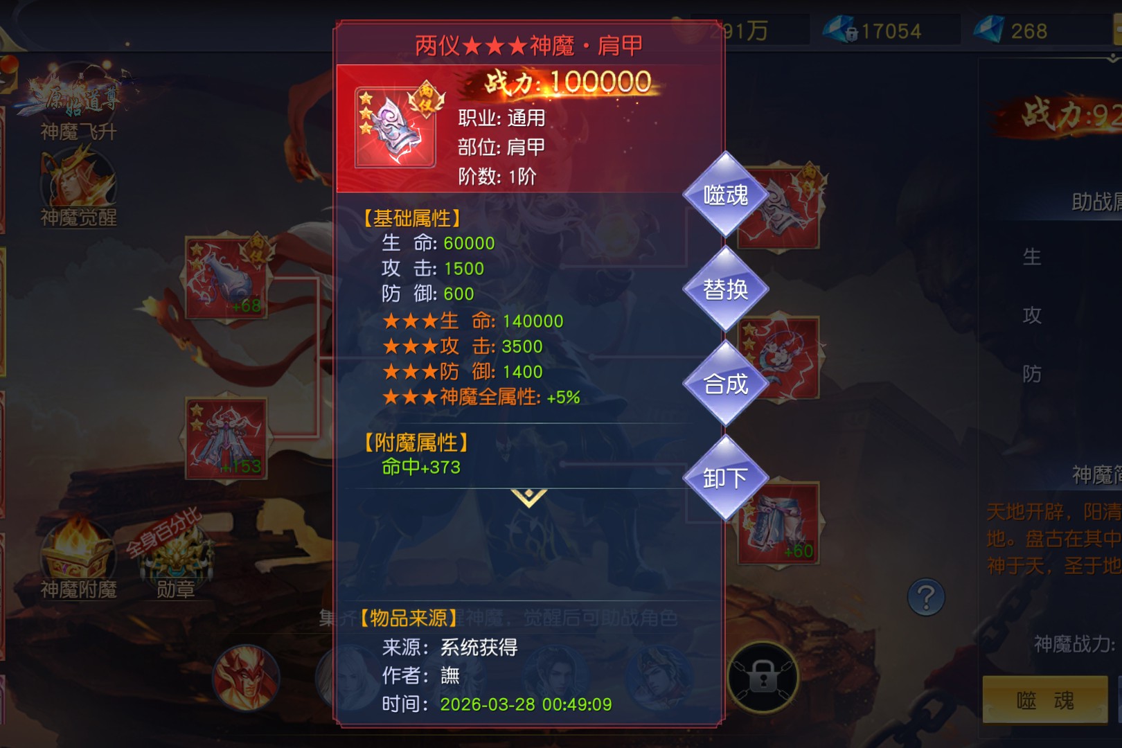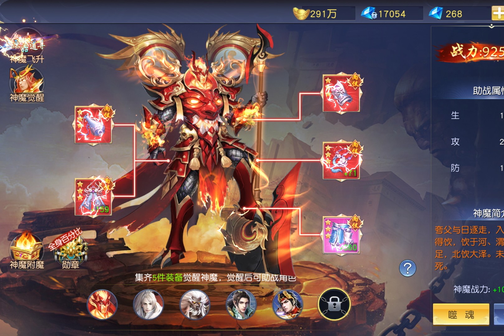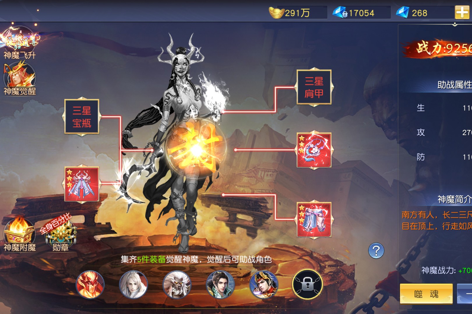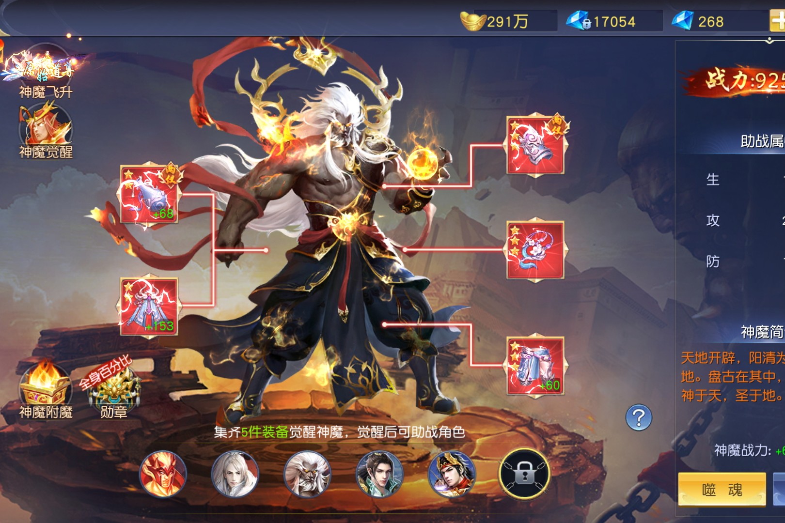在山海经神魔系统中开天盘古绝对是战力天花板级存在!肌肉虬结的创世之神造型霸气无双,掌间烈焰燃尽混沌,气场直接拉满,妥妥的颜值与实力双绝。他的战力加成更是炸裂:神魔战力+676976,助战属性全面爆发生命超1100万、攻击近28万,攻防属性直接拉满总战力飙升至9256621。装备豪华顶配全套红色神魔装备拉满,两仪三星肩甲单装备就提供10万战力,满星解锁神魔全属性+5%,附魔属性再添高额命中加成,战力持续飙升。集齐5件装备即可觉醒,神魔附魔、勋章系统还能解锁全身百分比加成,不管是PVE推图还是PVP竞技,都是绝对的核心助力,冲榜提战必备神级伙伴!