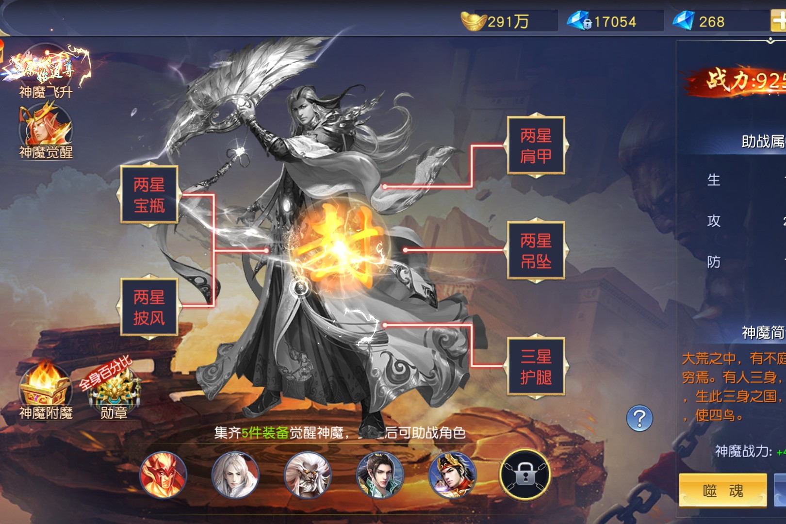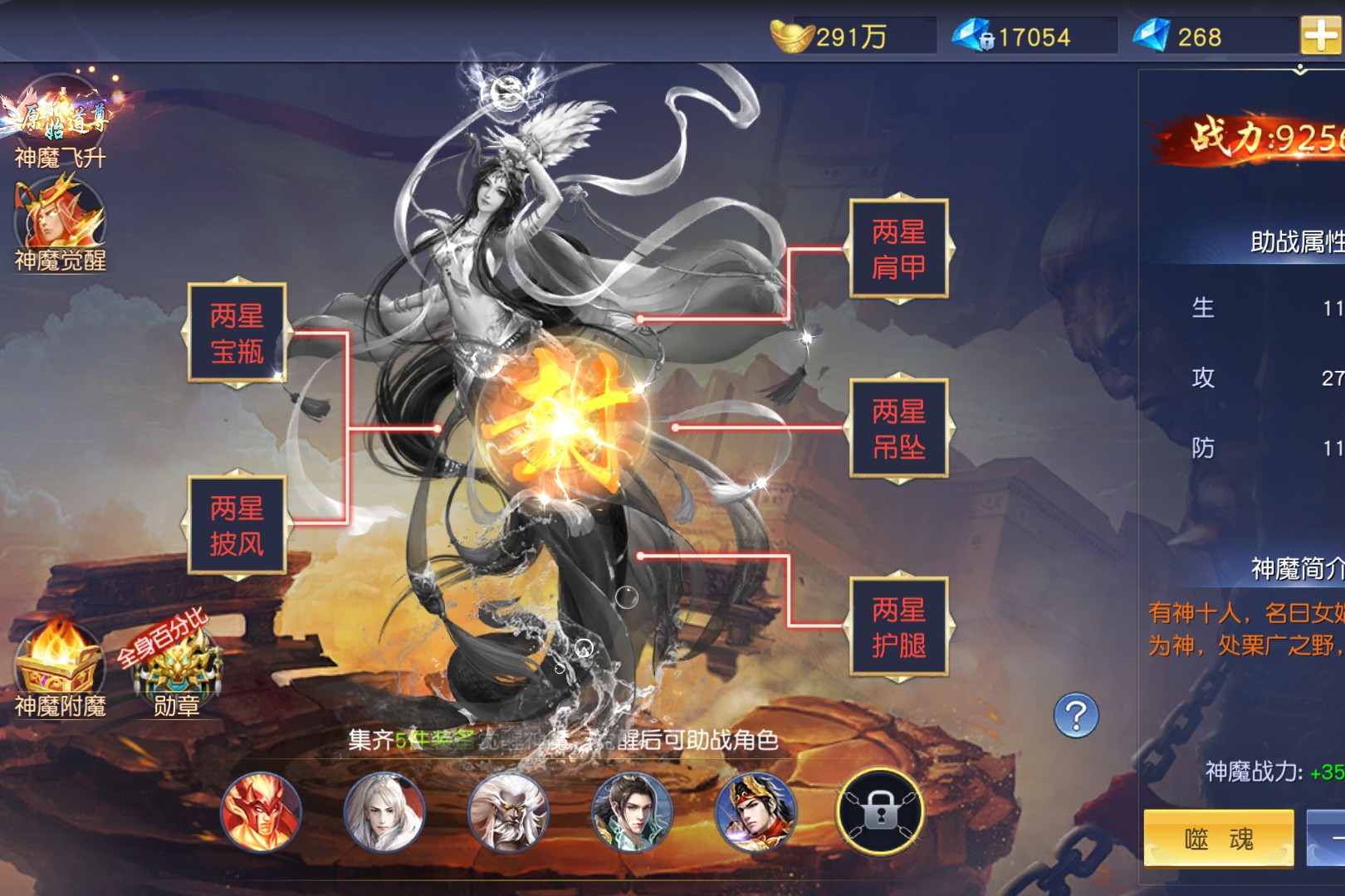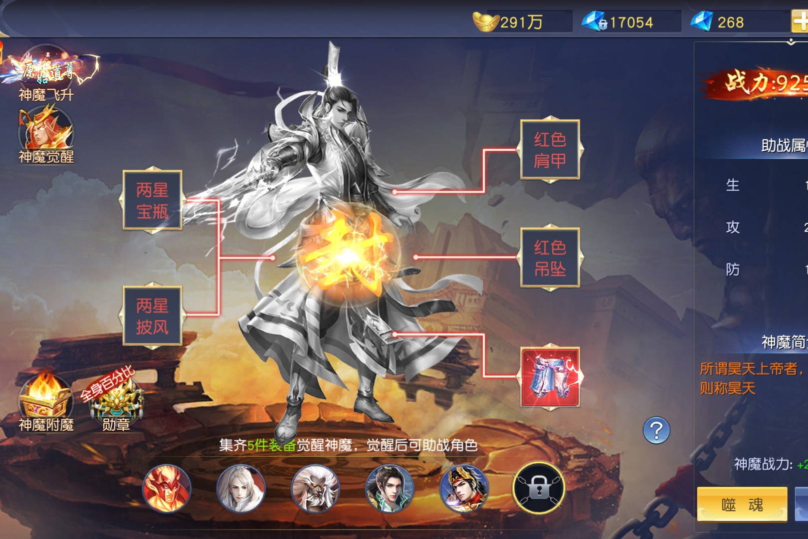 在山海经神魔系统中开天盘古绝对是战力天花板级存在!肌肉虬结的创世之神造型霸气无双,掌间烈焰燃尽混沌,气场直接拉满,妥妥的颜值与实力双绝。他的战力加成更是炸裂:神魔战力+676976,助战属性全面爆发生命超1100万、攻击近28万,攻防属性直接拉满总战力飙升至9256621。装备豪华顶配全套红色神魔装备拉满,两仪三星肩甲单装备就提供10万战力,满星解锁神魔全属性+5%,附魔属性再添高额命中加成,战力持续飙升。集齐5件装备即可觉醒,神魔附魔、勋章系统还能解锁全身百分比加成,不管是PVE推图还是PVP竞技,都是绝对的核心助力,冲榜提战必备神级伙伴!