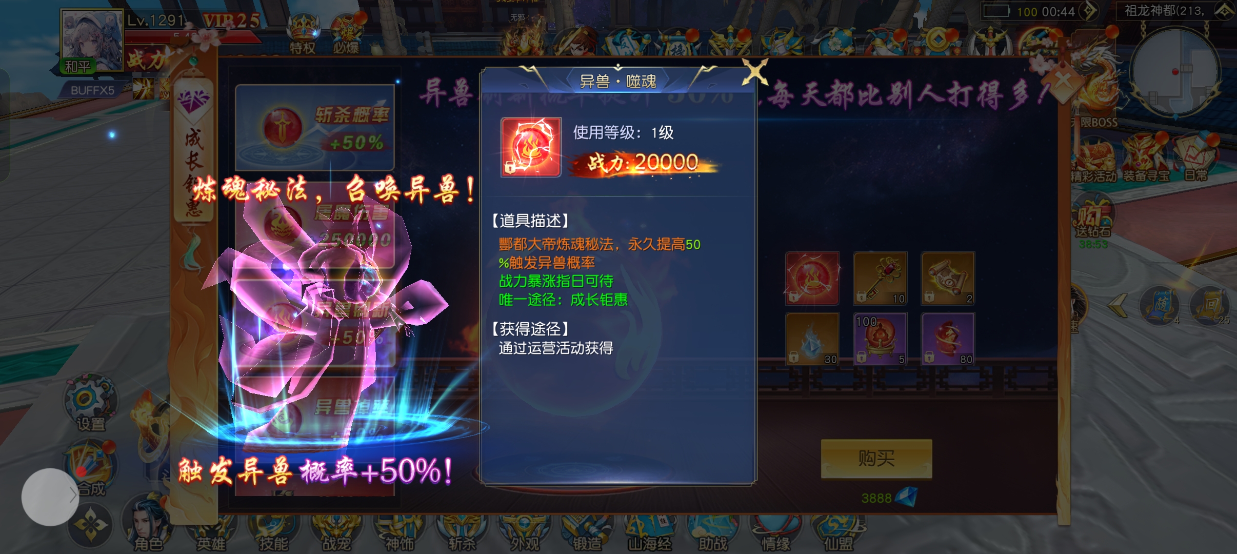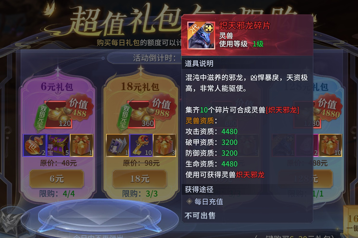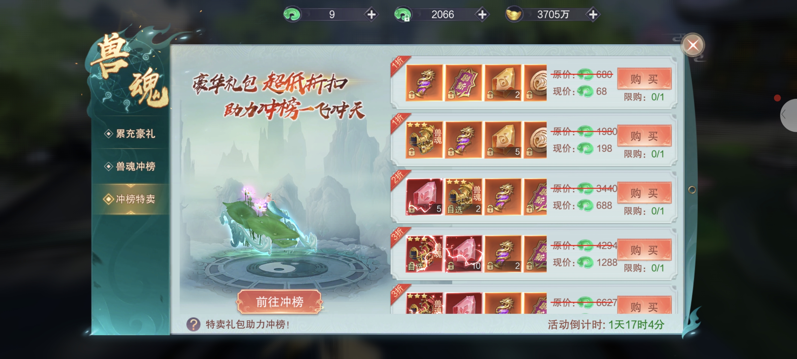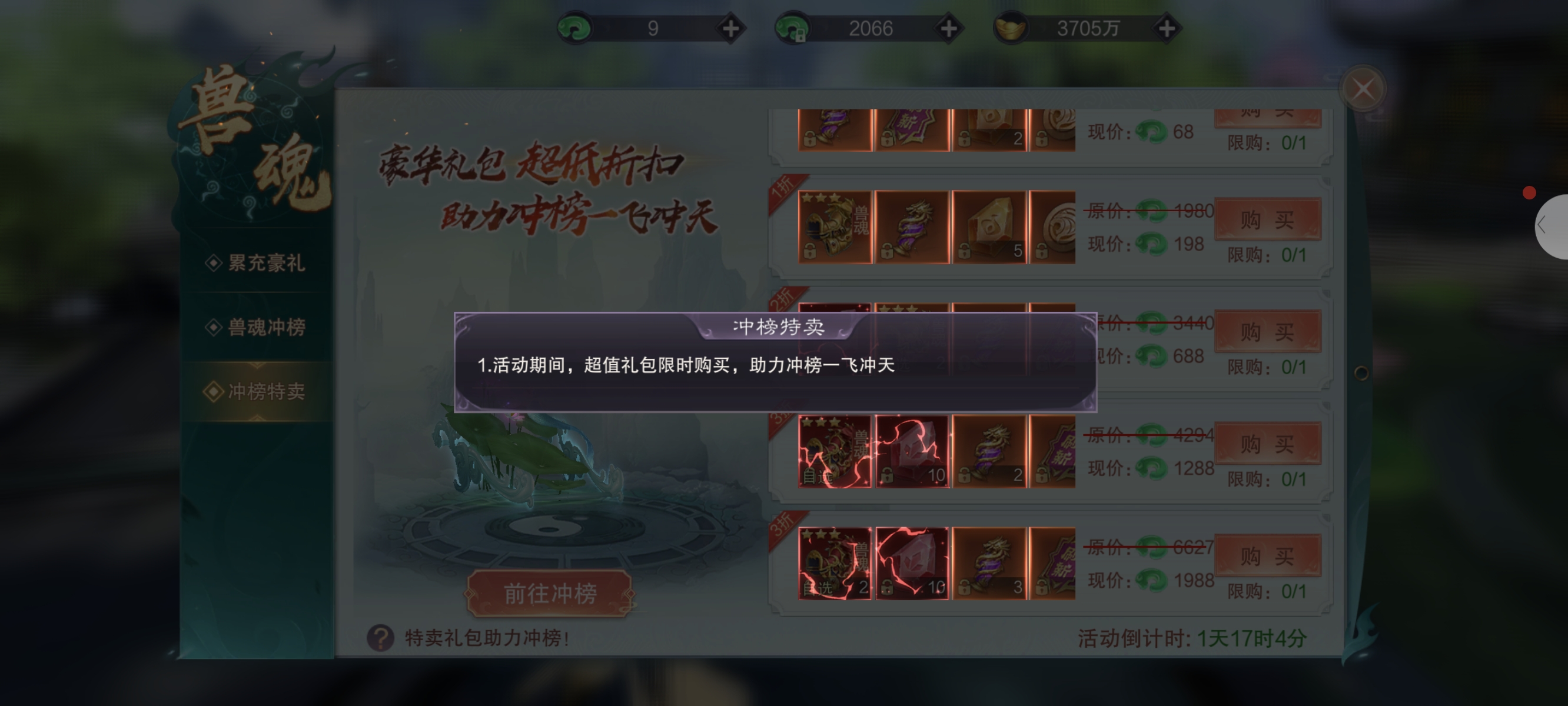 兽魂冲榜专属冲榜特卖活动限时开启,活动倒计时仅1天17小时,超值礼包低至1折,海量兽魂、自选道具、刷新券限时上架,助力轻松冲榜。 每一档都能省超多仙玉: +1. 1折礼包(68仙玉):必买入门款!含兽魂养成材料、刷新券*2等核心道具,用最少仙玉拿下起步材料,快速提升兽魂评分,冲榜无压力。 2. 1折礼包(198仙玉):中氪首选!三星兽魂+自选兽魂+升级材料*5,原价1980仙玉,直降1782仙玉,直接解锁强力兽魂,战力瞬间暴涨,冲榜竞争力翻倍。 3. 2折礼包(688仙玉):补强必备!红色自选兽魂+自选兽魂+升级材料,原价3440仙玉,折扣拉满,优先拿下红色品质兽魂,属性碾压同服玩家,冲榜更稳。 4. 3折及以上礼包(1288/1988仙玉):毕业冲刺款!红色自选*10+全套升级材料,覆盖兽魂从养成到毕业的全流程,一步到位拉满评分,稳拿冲榜排名奖励。 购买建议: 1. 按预算选档位:萌新优先冲1折、2折礼包,低成本拿满核心材料;中氪直接冲3折礼包,红色自选+全套材料助力毕业;大佬可拉满所有档位,稳拿兽魂冲榜前三,拿极品坐骑与限定奖励。 2. 限时提醒:活动剩余时间仅1天17小时,且所有礼包限购1次,错过不仅恢复原价,更会错过冲榜核心材料。 3. 搭配冲榜:购买特卖礼包后,优先集中升级兽魂,快速拉满评分,在兽魂冲榜活动中抢占高位,奖励拿到手软! 兽魂是后期战力核心模块,冲榜特卖是最划算的获取渠道。趁活动还在,按需入手礼包,助力兽魂评分一飞冲天,横扫全服!