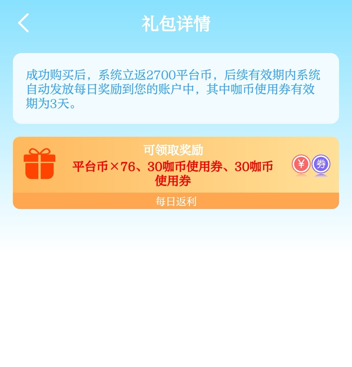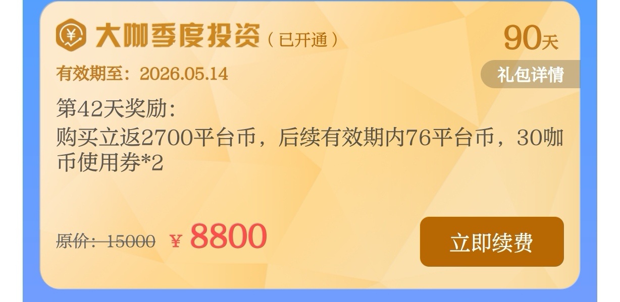 在消费与投资并行的当下,「大咖季度投资」以90天周期的福利模式,为玩家打造了一份兼顾实惠与长期收益的选择。这份已开通的投资礼包,不仅用直观的价格优惠与阶梯式奖励,让每一笔投入都看得见回报,更以贴心的每日返利设计,让福利持续贯穿整个有效期。 + 从价格来看,这份礼包原价15000元,活动价仅8800元,直降6200元的力度,已经为玩家省下一笔可观成本。而购买后的奖励机制更具吸引力:成功购买后立返2700平台币,相当于直接抵扣部分成本;后续有效期内,系统每日自动发放76平台币与两张30咖币使用券,让福利细水长流。 + 平台币可直接用于游戏内消费,而30咖币使用券则为日常消费增添了更多实惠——每张券满30元即可使用,适用于绝大部分游戏,不过需注意券的有效期仅为3天,需要及时使用避免浪费。从「我的卡券」列表中可以看到,多张咖币券已陆续到账,清晰标注着有效期与使用范围,方便玩家规划消费节奏。 + 90天的有效期让这份投资更具长期价值,既满足了玩家对短期立减的需求,又通过每日返利实现了持续收益。无论是追求性价比的普通玩家,还是希望长期深耕游戏的资深用户,这份大咖季度投资礼包都能提供一份稳定的福利保障,让消费变成积累惊喜的过程,在享受游戏乐趣的同时,收获实实在在的优惠与便利。 +