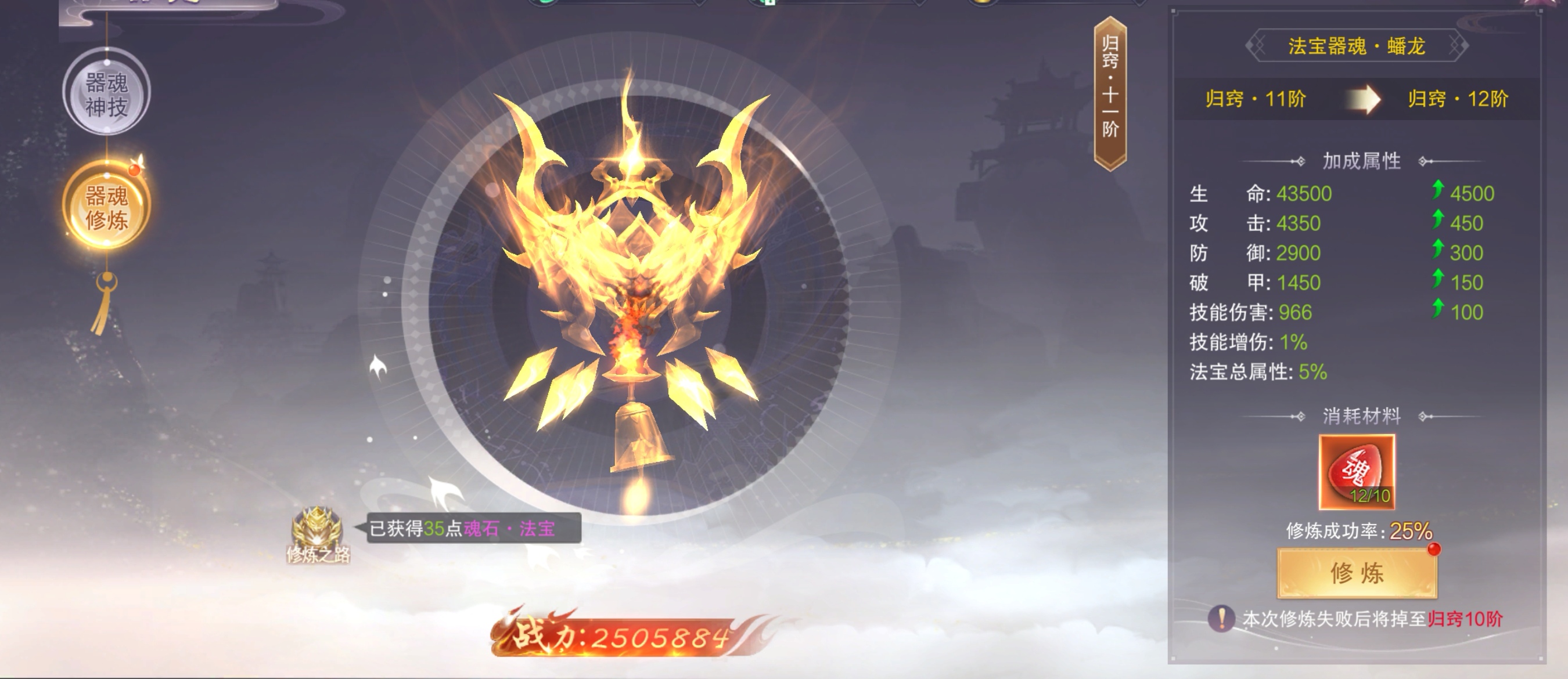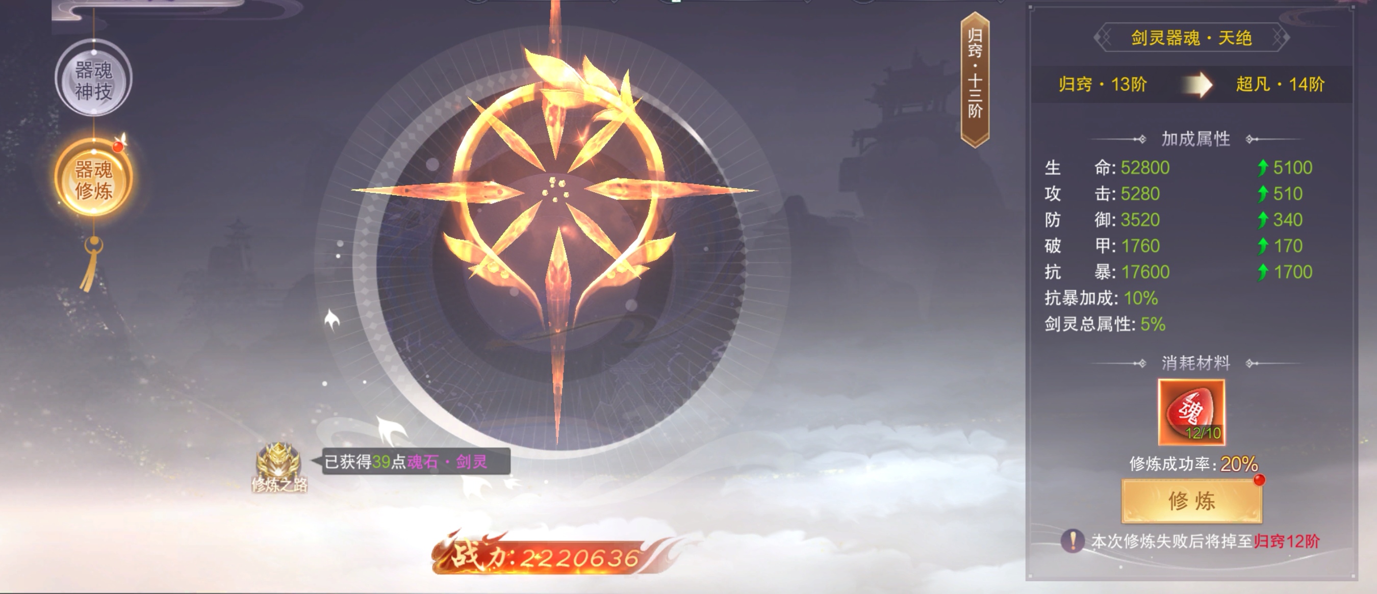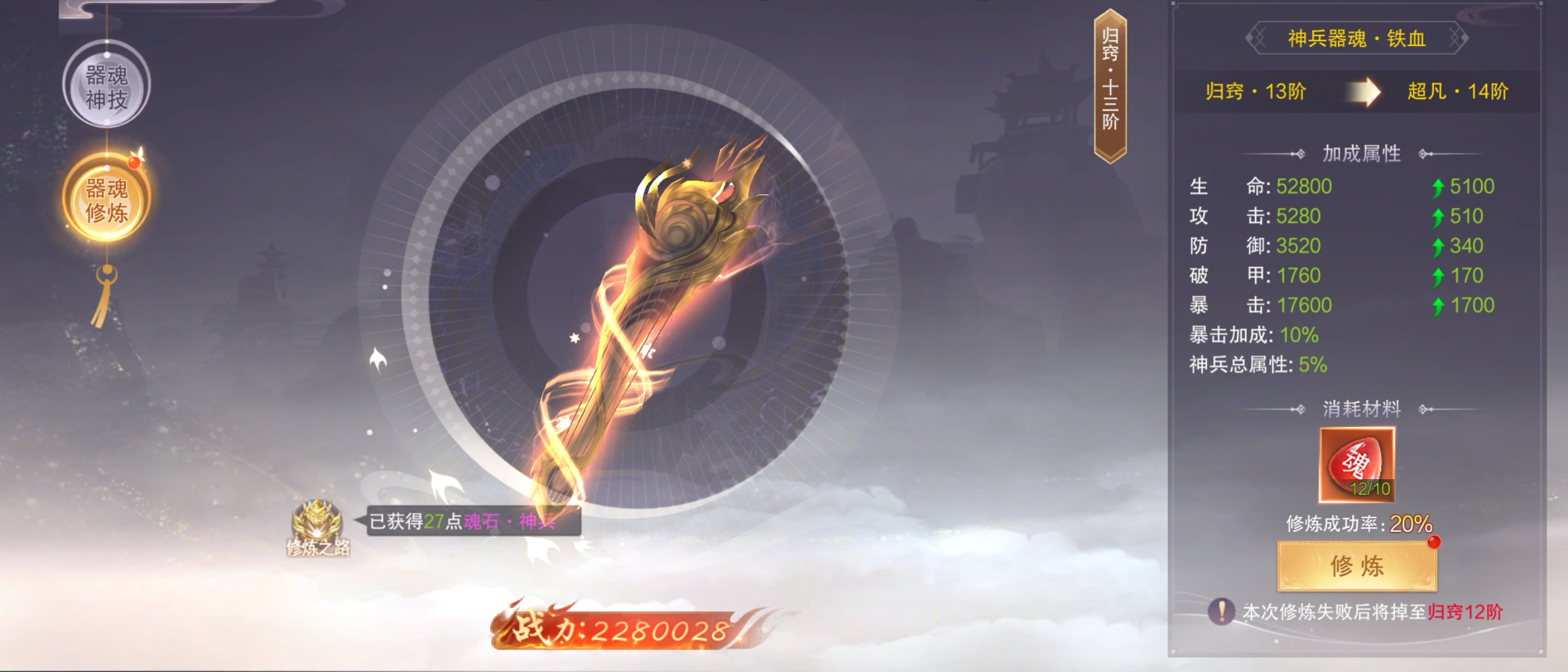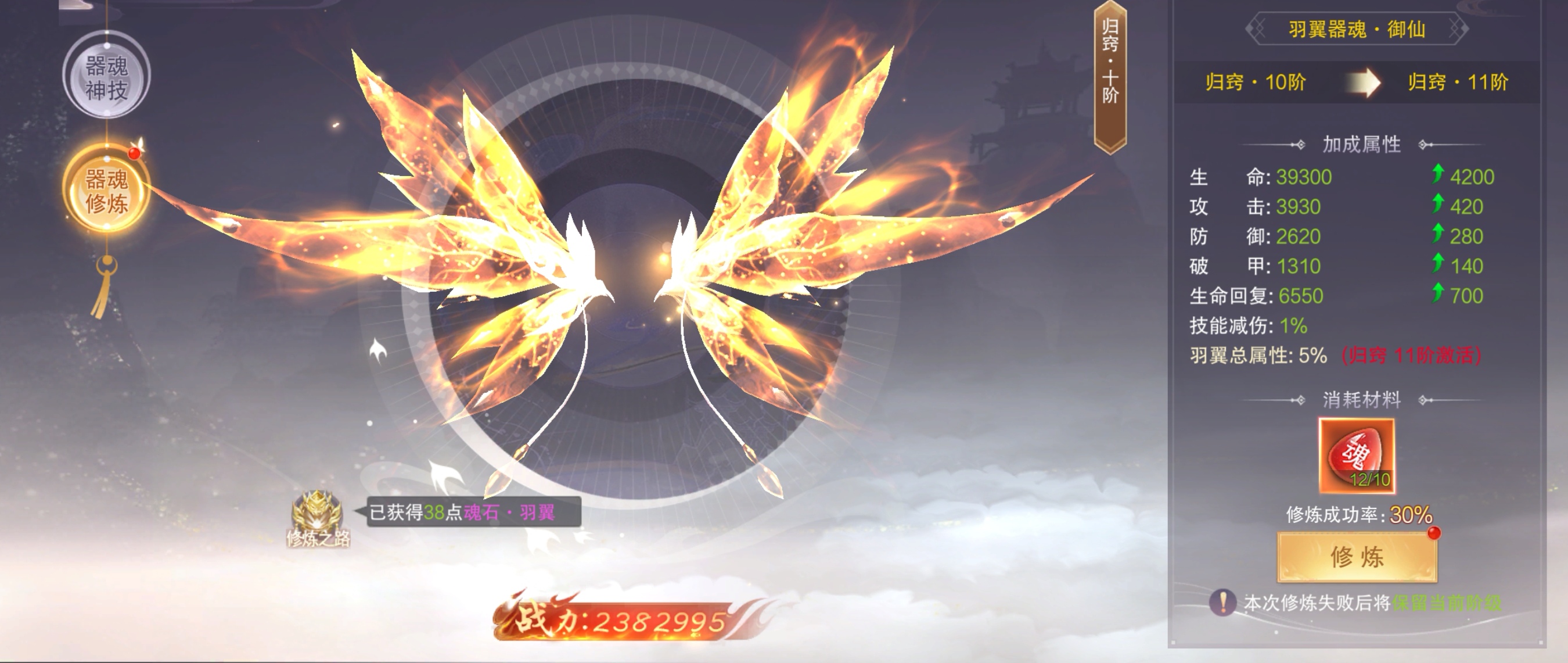 器魂觉醒!四系神装战力飙升,解锁全服巅峰战力! +唯有极致战力,方能踏碎虚空、执掌乾坤!今日,我携四系顶级器魂强势登场,从羽翼、法宝、神兵到剑灵,每一件都是突破境界的终极利器,每一次修炼都是向巅峰的极致冲刺! + 羽翼器魂·御仙,归窍十阶巅峰!金色流光羽翼,自带神圣威压,生命、攻击、防御全面暴涨,技能减伤与总属性加成,让我在战场中如神般屹立,每一次修炼都是向更强的蜕变! + 法宝器魂·蟠龙,归窍十一阶进阶!蟠龙虚影,霸气侧漏,技能伤害与增伤拉满,防御与破甲全面提升,法宝之力,足以撼动天地! + 神兵器魂·铁血,归窍十三阶巅峰!金色战刃,锋芒毕露,暴击与暴击加成拉满,生命、攻击、防御全面碾压,神兵之威,所向披靡! + 剑灵器魂·天绝,归窍十三阶巅峰!金色剑影,灵动飘逸,抗暴与抗暴加成拉满,生命、攻击、防御全面提升,剑灵之力,守护四方! + 四系器魂,四系巅峰!羽翼御仙、法宝蟠龙、神兵铁血、剑灵天绝,每一件都凝聚着极致战力,每一次修炼都在突破极限!从30%到20%的成功率,从十阶到十三阶的境界,我以魂石为基,以修炼为梯,向着全服第一战力发起冲锋!