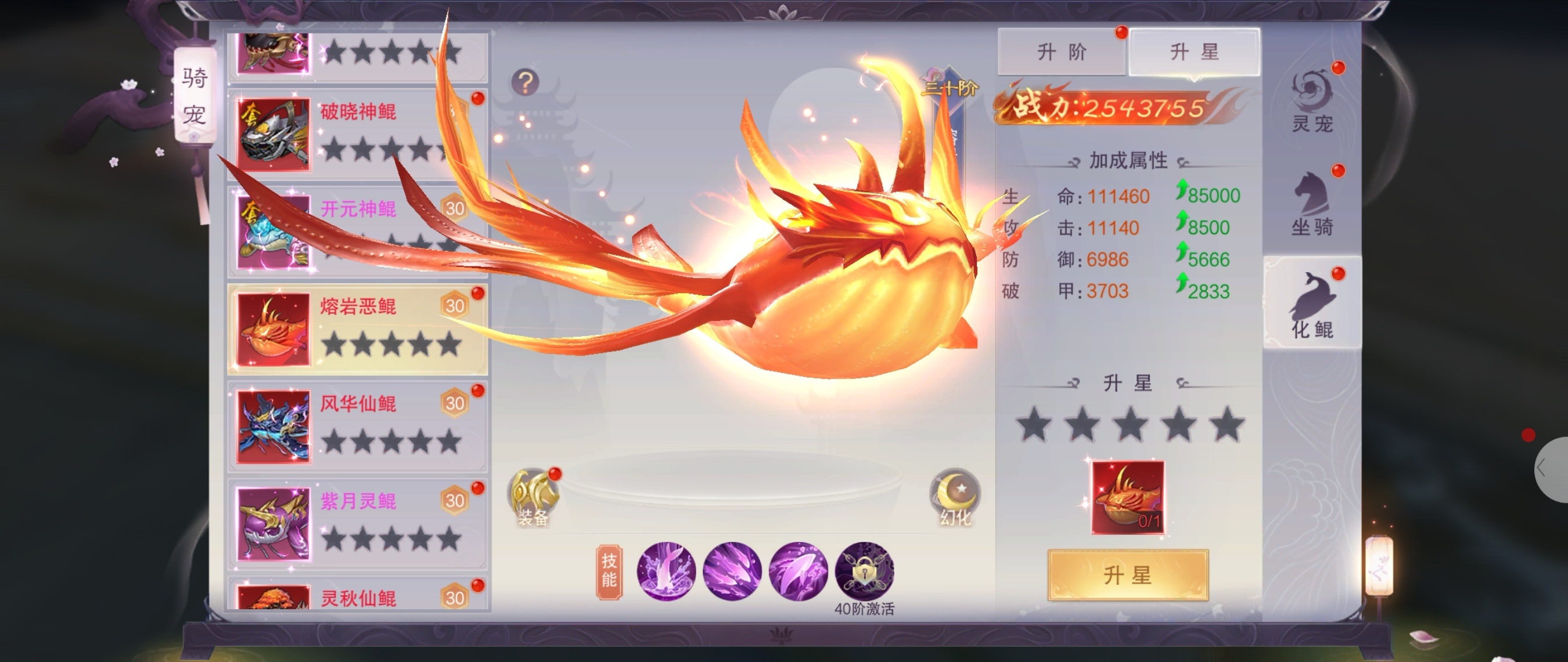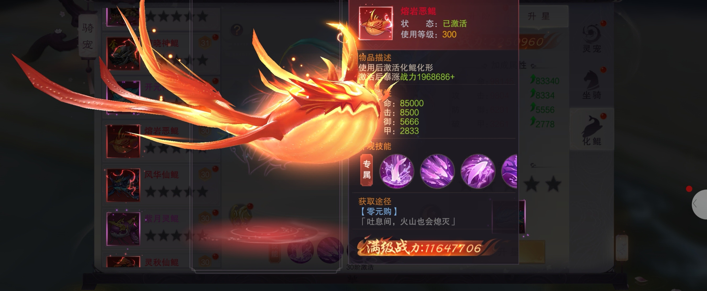 当熔岩恶鲲拖着焰尾划破屏幕时,仿佛将整片仙侠大陆都拖入了炽热的炼狱。这只通体赤红的神鲲,是火焰与力量的化身,每一片鳍翼都燃烧着不灭的烈焰,光是伫立在眼前,便足以让对手心生畏惧。 + 它当前战力已突破254万+,而满级后更是能飙升至1.16亿+,生命属性高达8.5万,攻击与破甲属性同样亮眼,在战场中既能扛住成吨伤害,又能打出毁天灭地的输出,是当之无愧的“战场推土机”。 + 专属技能栏里,三个紫色技能蓄势待发,每一个都蕴藏着火焰的力量,既能造成范围伤害,又能附加灼烧效果,让敌人在持续燃烧中失去战斗力。而“零元购”的获取途径,更是让不少平民玩家也能拥有这只顶级神鲲,实现战力逆袭。