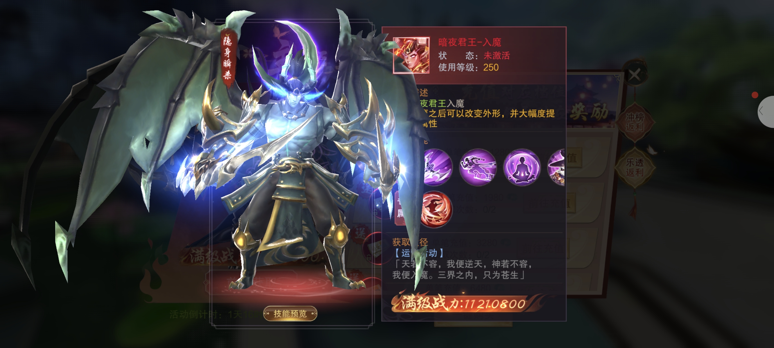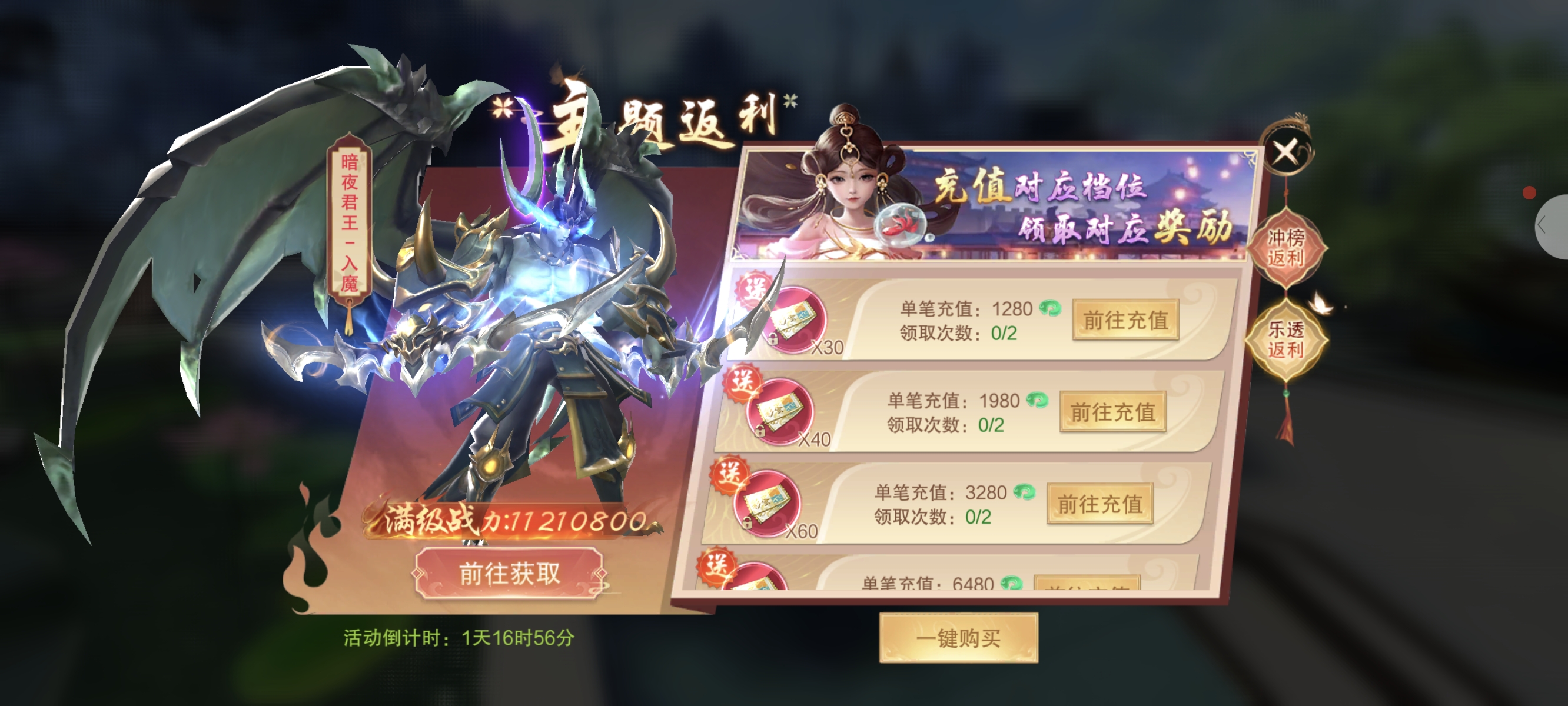 顶级变身「暗夜君王-入魔」限时主题返利活动正式开启!这波不仅能拿下满级1121万战力的超强变身,还能享充值返利福利。 「暗夜君王-入魔」是当前版本天花板级变身形态,满级直接提供11210800的巨额战力加成,解锁专属「隐身瞬杀」机制,不仅能改变角色外形,更能大幅提升全属性,在PVE推图、PVP竞技中都是碾压级存在。其技能自带隐身、爆发、免控多重效果,无论是秒人还是保命,都能让你在战场中掌控全局,是冲榜、跨服战的必备神器。 本次主题返利活动,更是入手的最佳时机!活动设置多档充值档位,单笔充值1280/1980/3280/6480,即可领取对应档位的海量返利道具,每档可领取2次,返利力度拉满。充值金额1:10计入累充活动,相当于花一份钱,同时拿下顶级变身+累充进度+返利道具,微氪、中氪玩家都能找到适合自己的档位,性价比直接拉满。 入手与养成技巧: +1. 档位选择:中氪玩家优先冲3280档位,返利道具最丰厚,能快速拉满变身等级;微氪玩家可选择1280档位,先解锁变身形态,后续慢慢养成。 2. 养成优先级:解锁变身后,优先升级核心技能「隐身瞬杀」,其次点满被动增伤属性,最大化实战收益。 3. 限时提醒:活动倒计时仅1天16小时,且为限时返场,后续获取难度极高,务必在活动期内完成充值与领取,避免错过。 「暗夜君王-入魔」变身,早入手早享受,直接拉开与同服玩家的战力差距。趁活动还在,抓紧入手,解锁入魔形态,横扫全服,登顶战力榜!