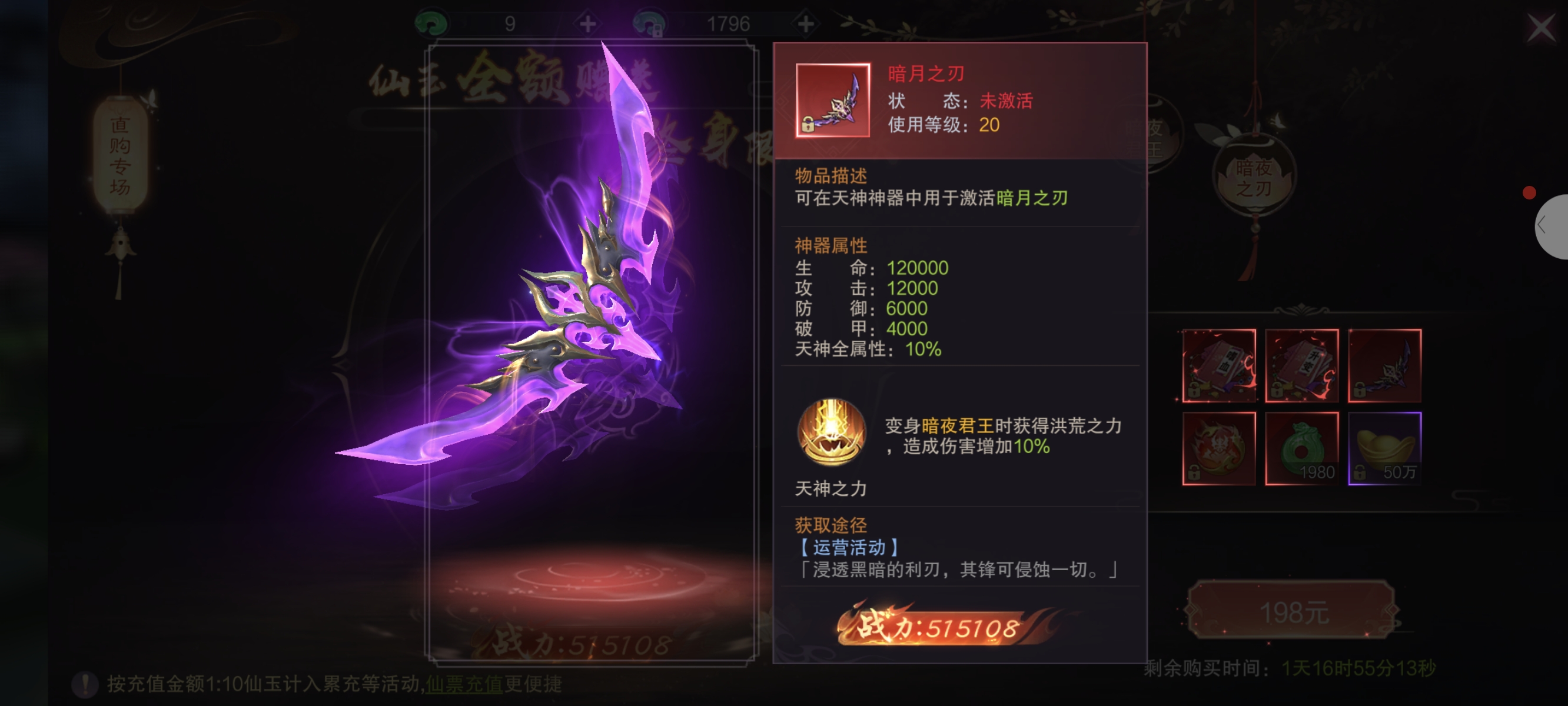 暗夜君王专属天神神器「暗月之刃」限时仙玉返利活动开启,终身限购一次,这波是零成本拉满变身战力的绝佳机会。 暗月之刃是变身「暗夜君王」的专属毕业神器,20级即可激活,直接提供515108的巨额战力加成。基础属性拉满:120000生命、12000攻击、6000防御、4000破甲,更有10%天神全属性的永久加成,全方位提升天神体系战力。最核心的是,变身暗夜君王时会触发「洪荒之力」,造成伤害额外增加10%,直接让你的变身输出再上一个台阶,PVE推图、PVP竞技双开花,是跨服战、冲榜的必备神器! +本次活动性价比直接拉满!198元购买礼包,全额返还仙玉,还能1:10计入累充活动,相当于白拿神器+全套养成材料+累充进度,微氪党闭眼入不亏!礼包内含暗月之刃激活道具、神器升级书、升变丹、1980绑玉、50万金币,直接覆盖神器从激活到养成的全流程,一步到位拉满属性,不用再蹲日常攒材料。 本次活动仅可购买一次,后续返场周期极长,错过再无如此划算的入手渠道。活动倒计时仅1天16小时,务必在到期前完成购买,避免错过神器与返利。 暗月之刃是暗夜君王的毕业专属神器,直接拉开与同服玩家的战力差距。解锁暗月之刃,让你的暗夜君王输出拉满,横扫全服!战力狂飙,登顶排行榜!
