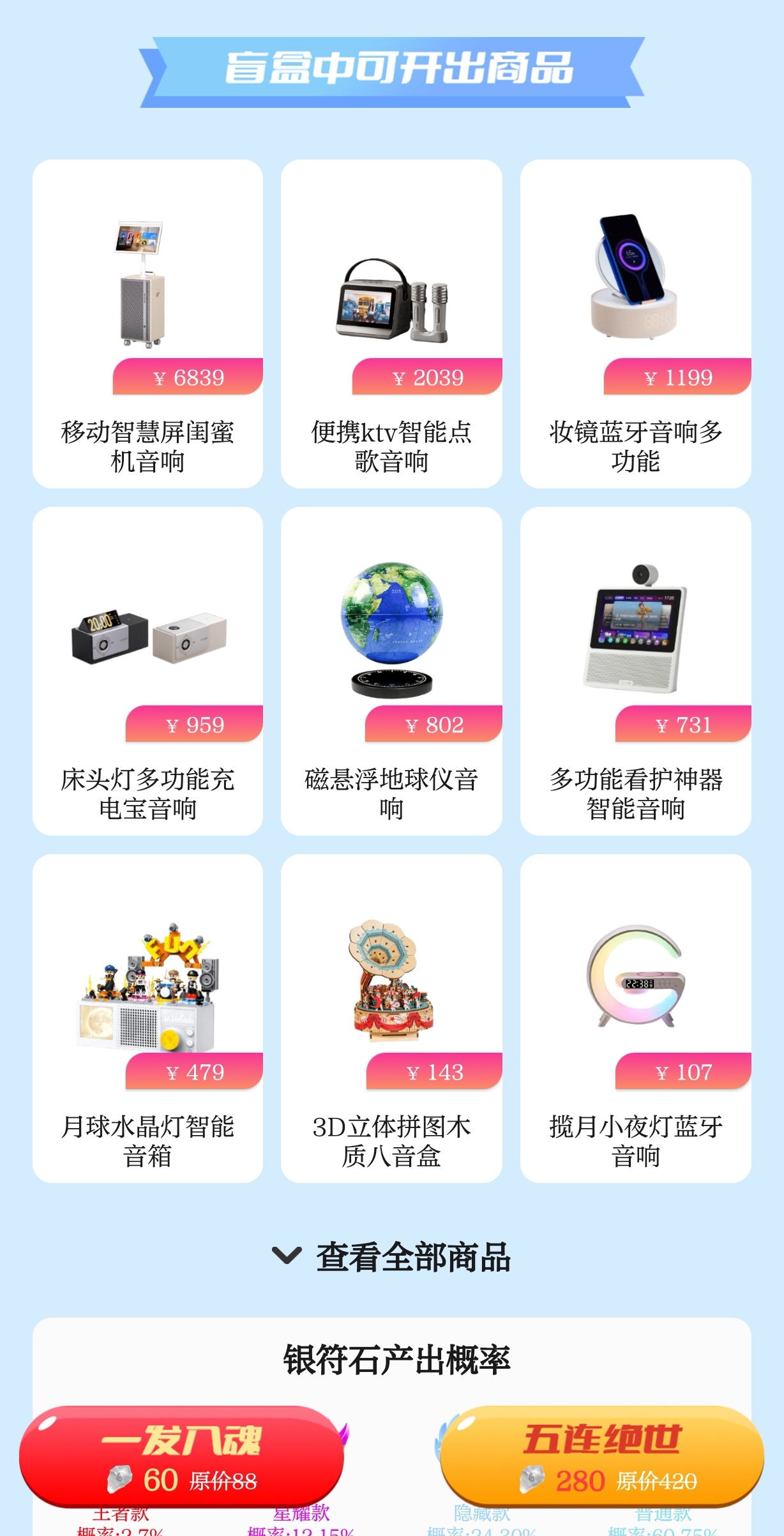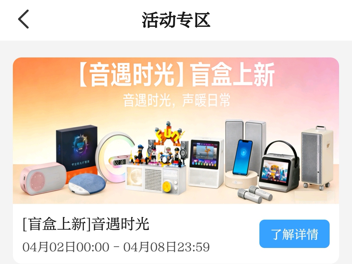 当科技与浪漫撞个满怀,一场关于声音与惊喜的盛宴就此开启!「音遇时光」盲盒全新上线,用满格诚意承包你的声暖日常,活动时间从4月2日00:00持续至4月8日23:59,每一次开盒都藏着不期而遇的小确幸。 + 走进这场惊喜派对,你会发现盲盒里藏着一个有声有色的小世界。从价值6839元的移动智慧屏闺蜜机音响,到2039元的便携KTV智能点歌音响,无论是家庭K歌的欢乐时刻,还是户外聚会的氛围担当,都能一键满足;妆镜蓝牙音响、床头灯多功能充电宝音响,把实用与颜值拉满,让日常起居都充满悦耳旋律;更有磁悬浮地球仪音响这样的宝藏好物,将地理启蒙、科技感与好音质完美融合,悬浮的地球仪搭配AR智能技术,既是孩子的知识启蒙玩具,也是桌面吸睛的艺术摆件,让学习与听歌双向奔赴。 + 月球水晶灯智能音箱、揽月小夜灯蓝牙音响,用光影与旋律打造治愈氛围,3D立体拼图木质八音盒则藏着手工的温度与复古的浪漫。从千元级的智能好物,到百元内的精致小物,每一款都精准戳中生活的美好瞬间。 + 更有“一发入魂”的抽卡快乐,不同档位的银符石解锁不同惊喜,王者款、星耀款、隐藏款、普通款各有惊喜,无论是自用提升生活质感,还是送给亲友传递心意,都是绝佳选择。 + 音遇时光,声暖日常。这场盲盒盛宴,用声音治愈生活,用惊喜点亮日常,快来开启属于你的专属好物吧! +