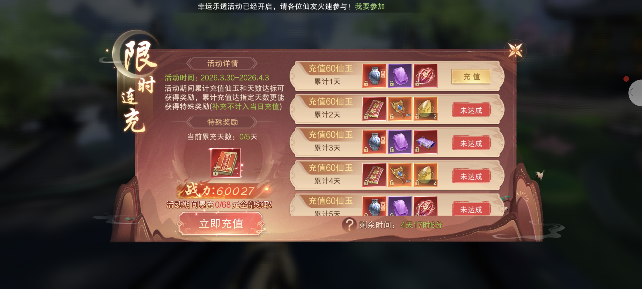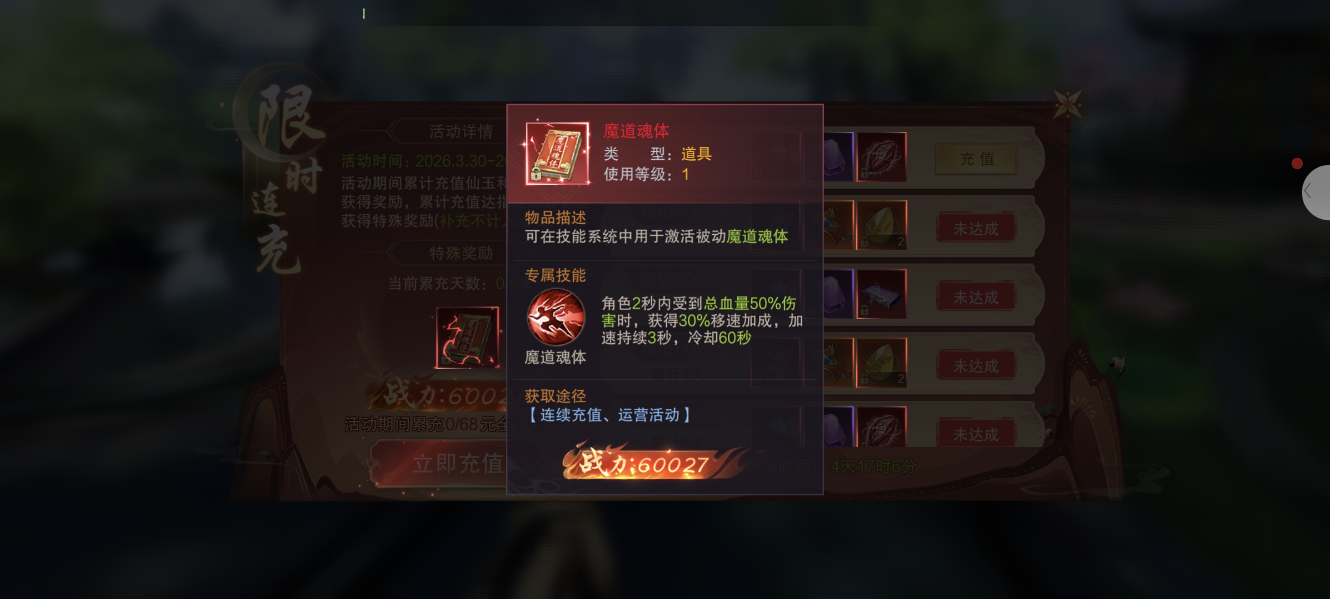 限时连充活动正式开启,累计5天每日仅需充值60仙玉,总花费68元,就能拿下魔道魂体神技+海量养成材料,性价比直接拉满,微氪党闭眼入! 本次活动的终极奖励是魔道魂体被动技能,激活直接提供60027战力加成,技能效果堪称PVP神技:角色2秒内受到总血量50%伤害时,立刻获得30%移速加成,持续3秒,冷却仅60秒!无论是被集火时逃生,还是残血反打拉扯,都能直接改变战局,是跨服战、竞技场的保命神技,早激活早享受! 活动规则超简单:活动时间为2026.3.30-2026.4.3,共5天,每日充值60仙玉即可领取当日奖励,累计5天总花费68元,就能领满所有档位+终极神技。每日奖励包含古壶、仙玉材料、刷新券、装备道具等,覆盖日常养成全需求,相当于花小钱拿神技,还能白嫖海量材料,一举两得! 关键提醒: +1. 补充不计入当日充值:必须每日单独充值60仙玉,补签、补充都不算,记得每日按时充值,避免断档拿不到终极奖励。 2. 限时提醒:活动剩余时间仅4天17小时,错过本次,后续获取难度极高,务必把握机会。 魔道魂体是永久被动技能,属性加成永久生效,PVE、PVP双用,68元的价格直接封神。每日充值,拿下神技,战力狂飙,轻松碾压同服玩家!
