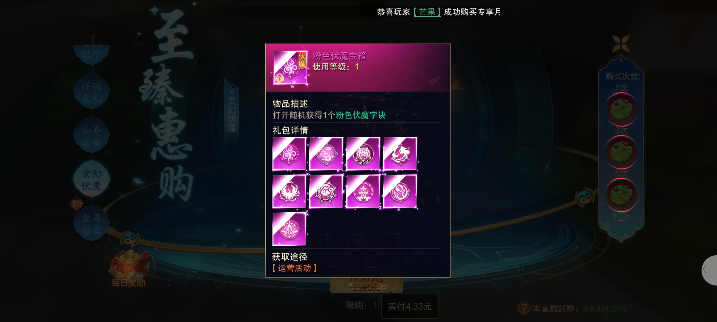 活动期间每消费一元宝即可获得一积分(不含市场消费,且积分仅在活动期间消费元宝才可获得),达到一定积分可兑换珍稀物品,会显示剩余积分和消费积分,根据自己需求进行兑换,理性充值合理消费,活动结束前兑换完毕!