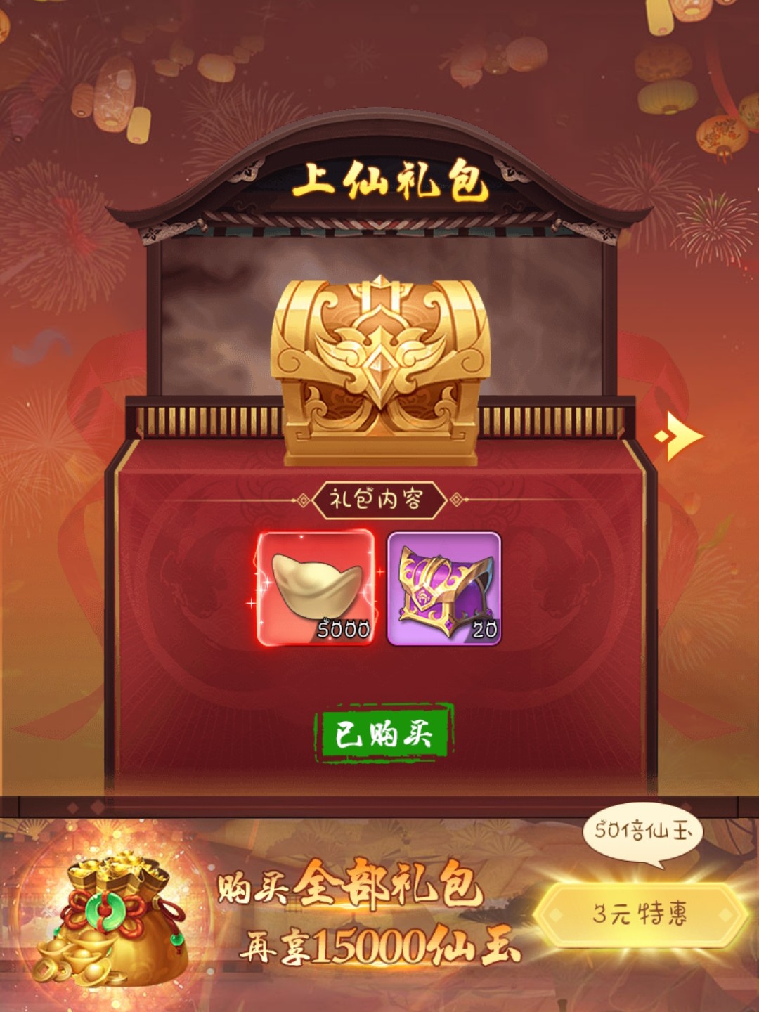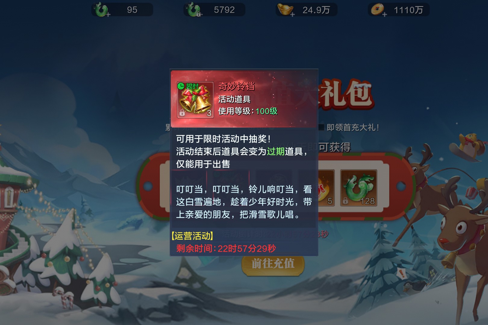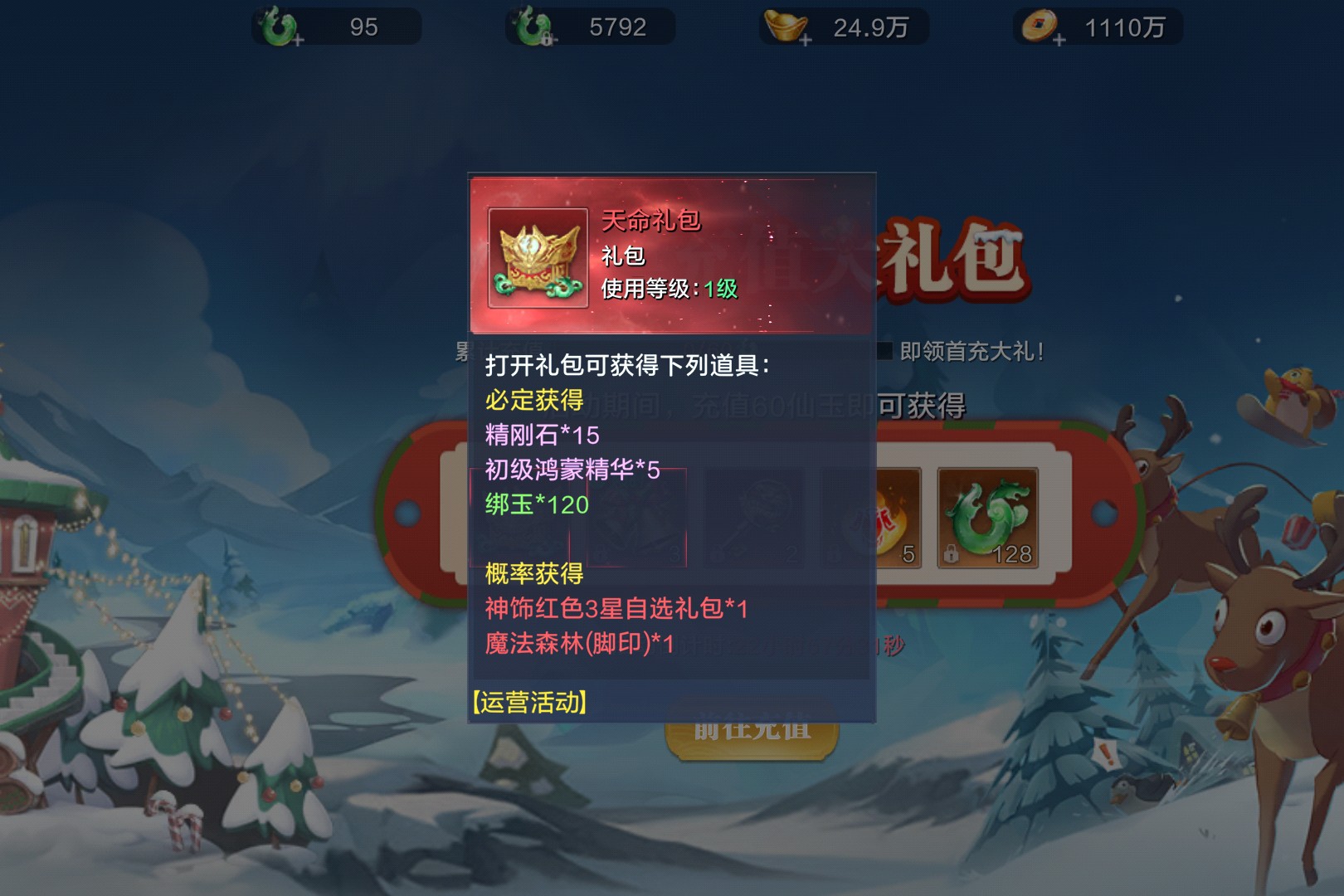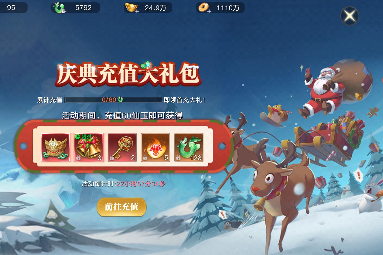 圣诞庆典充值大礼包界面格外吸睛,累计充值60仙玉就能解锁首充奖励,天命礼包、奇妙铃铛等道具整整齐齐排列,每一个都带着节日活动的专属标签。点开天命礼包,能稳拿精刚石、初级鸿蒙精华,还能概率开出红色3星神饰自选包,堪称战力提升的福利;奇妙铃铛作为限时道具,不仅能参与活动抽奖,描述里的圣诞歌词还藏着满满的节日氛围感。可活动倒计时只剩22小时,铃铛过期后只能出售,这份福利稍纵即逝。首充的门槛不高,可后续的累充、连充福利还在左侧栏闪烁,小额首充只是开胃菜,更大的诱惑还在后面。仙侠游戏的节日首充永远是纠结的开端,是花60仙玉拿基础福利,还是继续充值冲更高档位?圣诞的铃铛声里,每一个选择都关乎资源的取舍,也考验着玩家对活动福利的把控度。