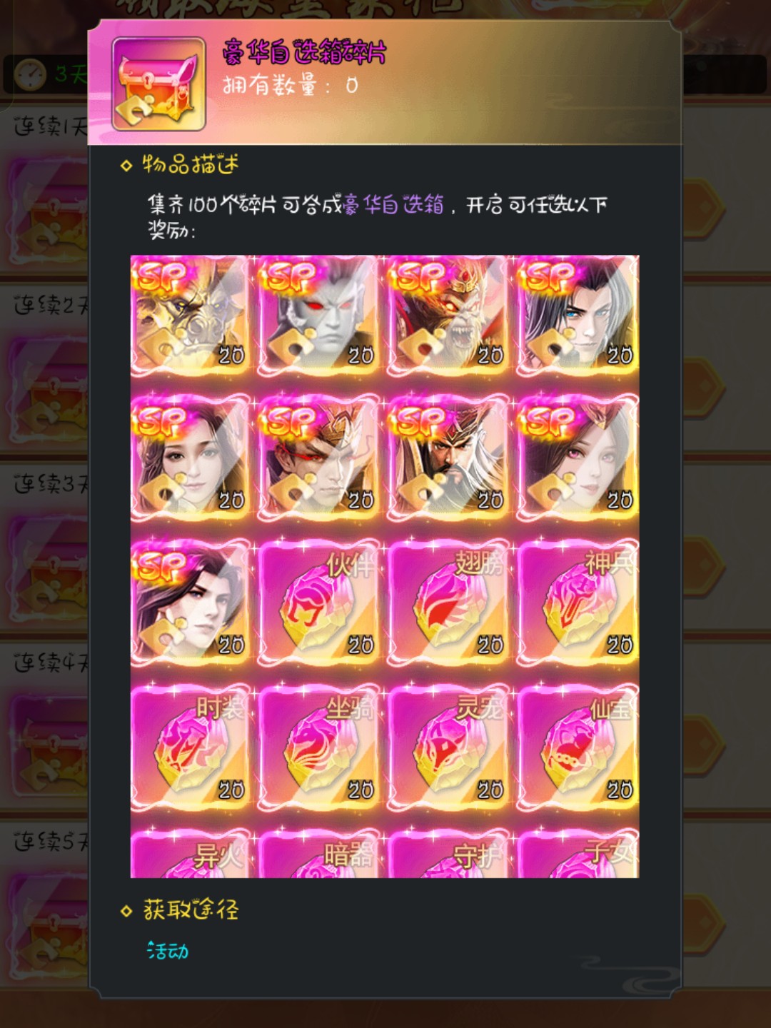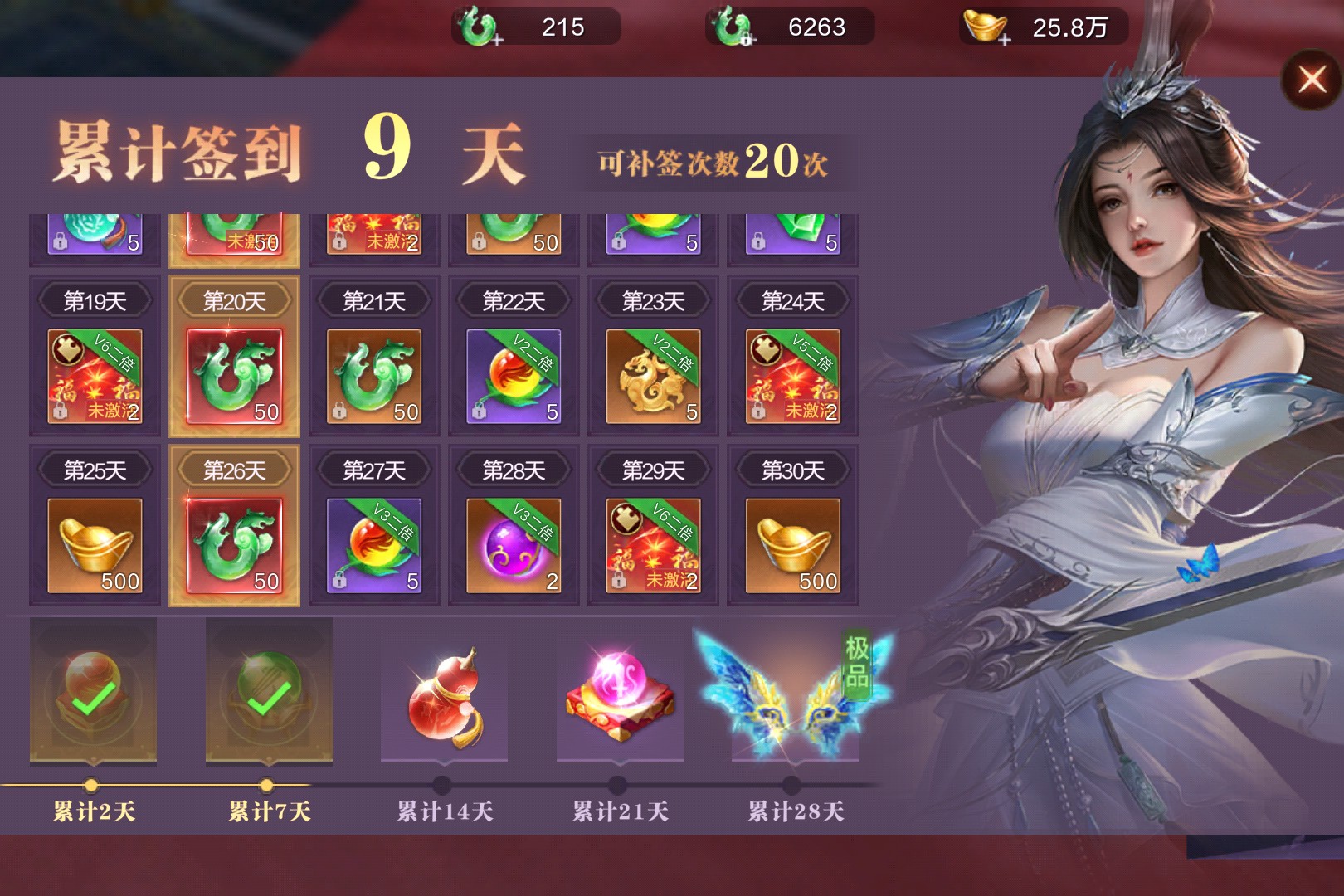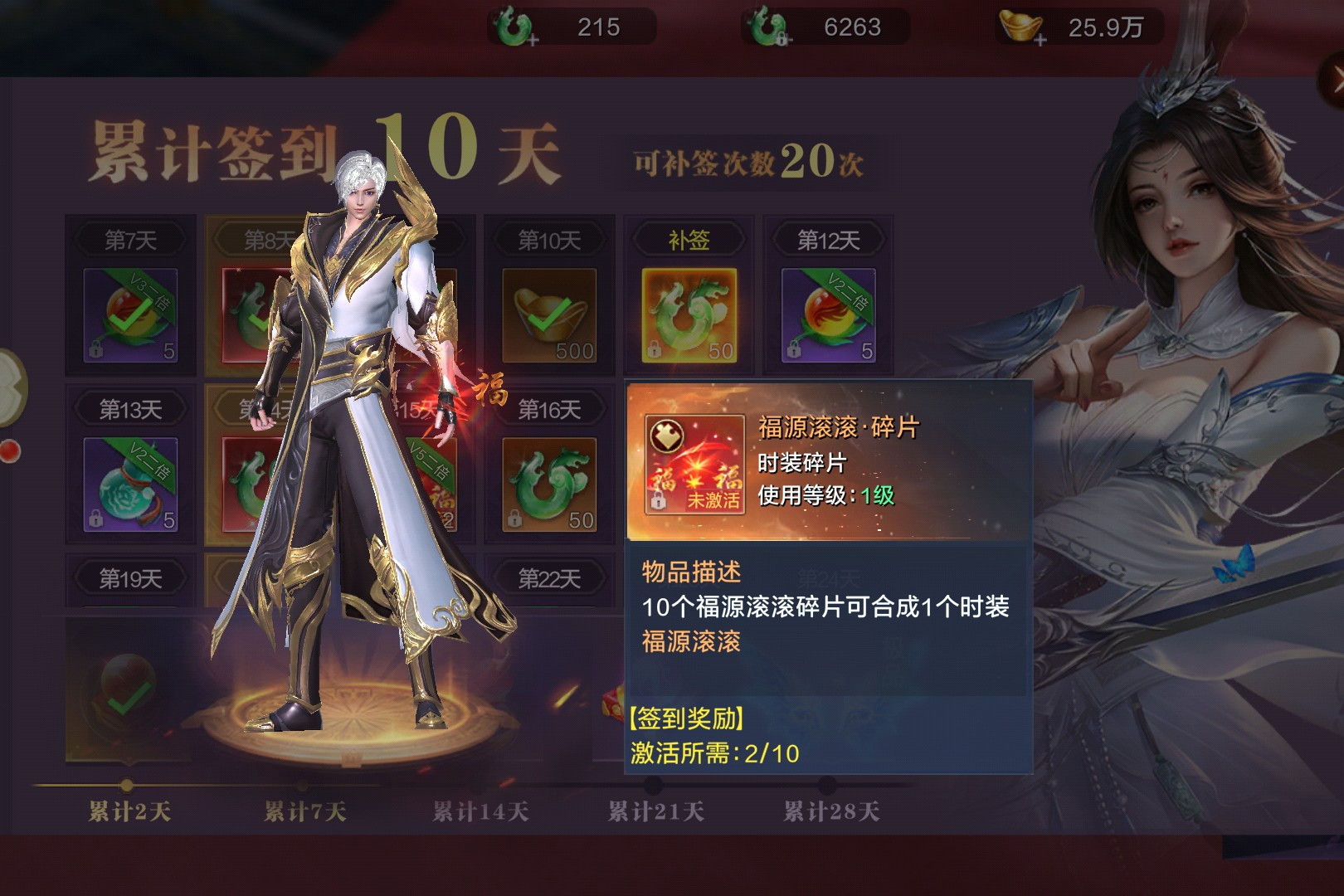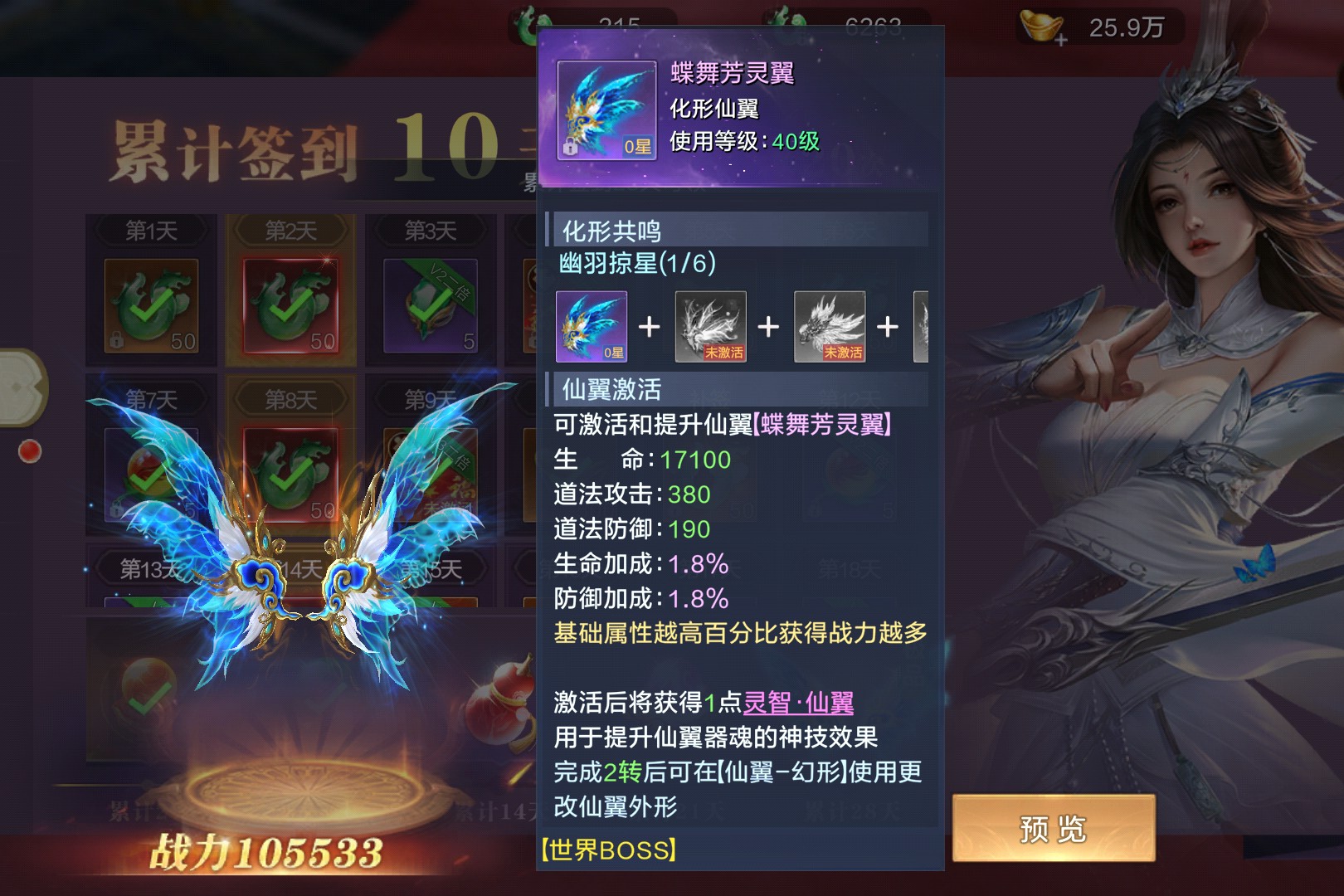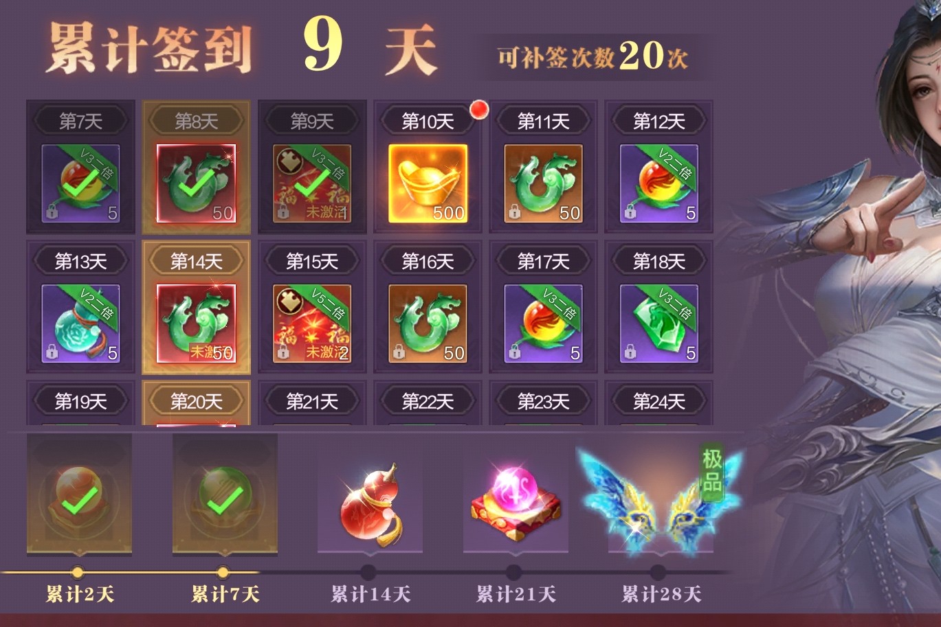 每日签到向来是白嫖党的福音,这个累计签到活动直接把奖励拉到天花板!目前累计签到9天,补签次数还有20次,完全不怕漏签。每日奖励里仙玉道具、元宝轮番送,第10天直接给500元宝,更有“福源滚滚”时装碎片,10个碎片就能合成整套时装,现在已经攒了2个,离解锁新外观又近一步。累计签到的奖励更诱人,28天就能拿到极品仙翼“蝶舞芳灵翼”,40级就能激活,能加17100生命、380道法攻击,还有属性加成和战力提升,激活后还能获得仙翼灵智,解锁器魂神技效果。签到越久奖励越珍稀,从日常资源到绝版外观、强力仙翼,零氪玩家也能靠坚持攒出高价值道具,这波签到福利属实诚意满满!