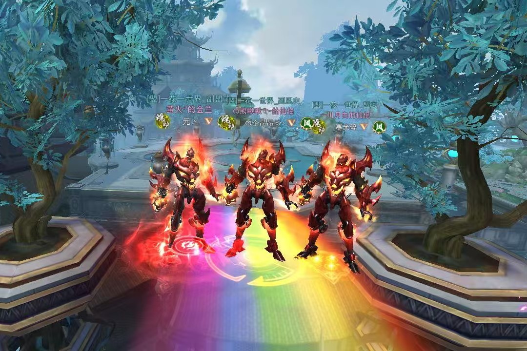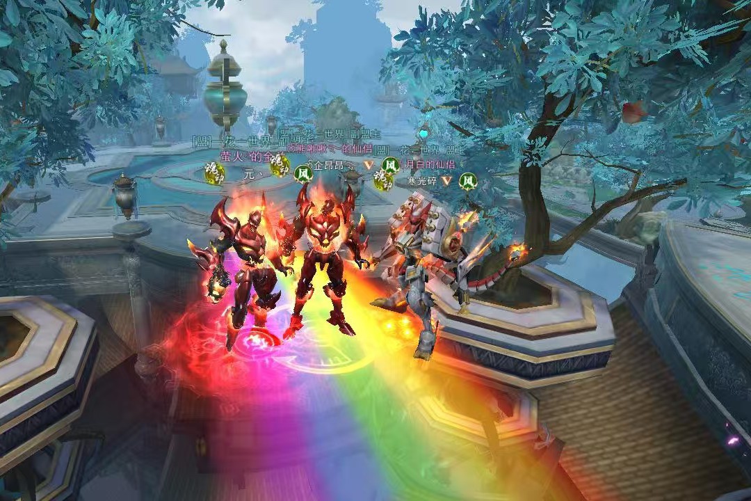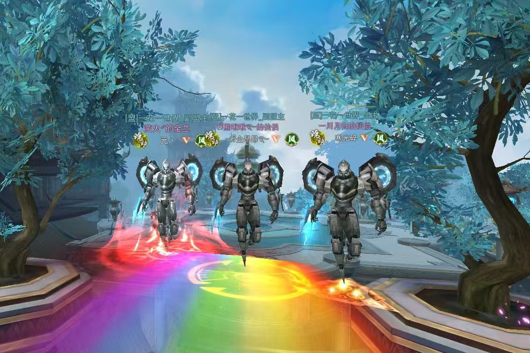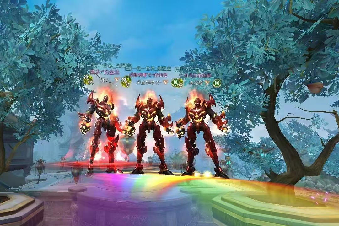 年末几个兄弟突发奇想齐刷刷换上了机甲外观,在仙气飘飘的主城彩虹道上排排站,红金机甲配着青蓝仙树,赛博朋克撞上古风仙侠的画面,违和又魔性。一开始只是一人起哄换机甲,没想到大家纷纷响应,从红机甲换到银机甲,还特意调整站位摆造型,路过的路人玩家都停下来围观,世界频道里还飘着“这是仙侠服还是机甲服”的调侃。我们就这么在主城逛了半个多小时,一会儿排成一队走彩虹道,一会儿凑在一起放技能,机甲的金属特效和仙侠的法术光效搅在一起,成了服务器年末独一份的风景。现在回看这些截图,还是觉得又傻又欢乐,或许网游的乐趣,从来都不是单一的打怪升级,而是和这群有趣的人,一起制造这些无厘头的年度趣事啊。