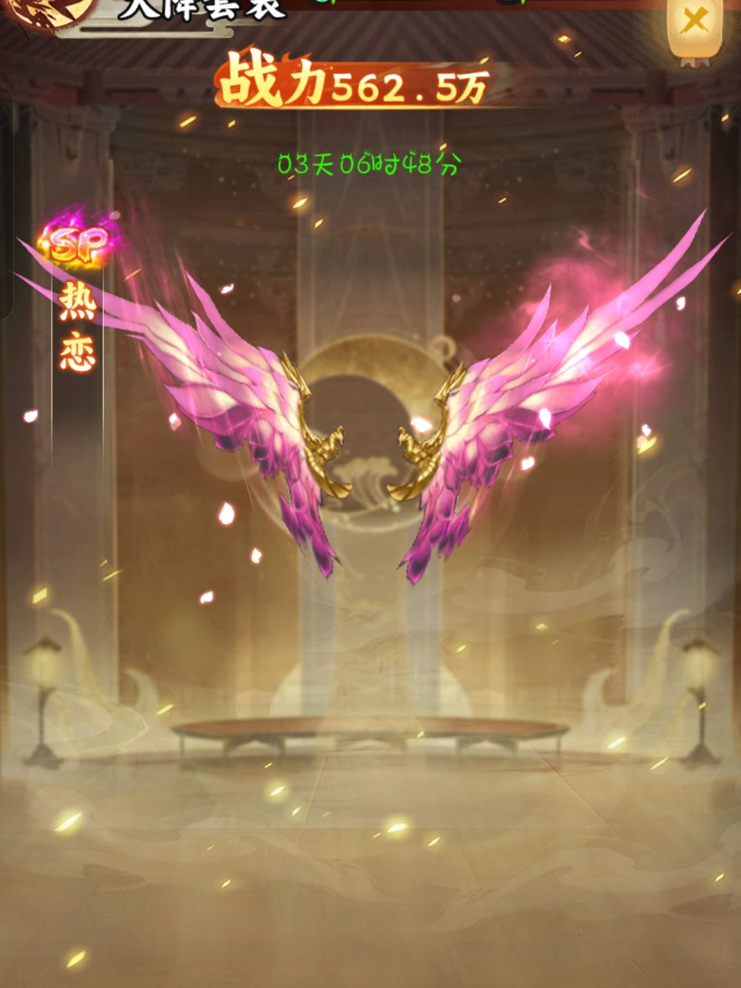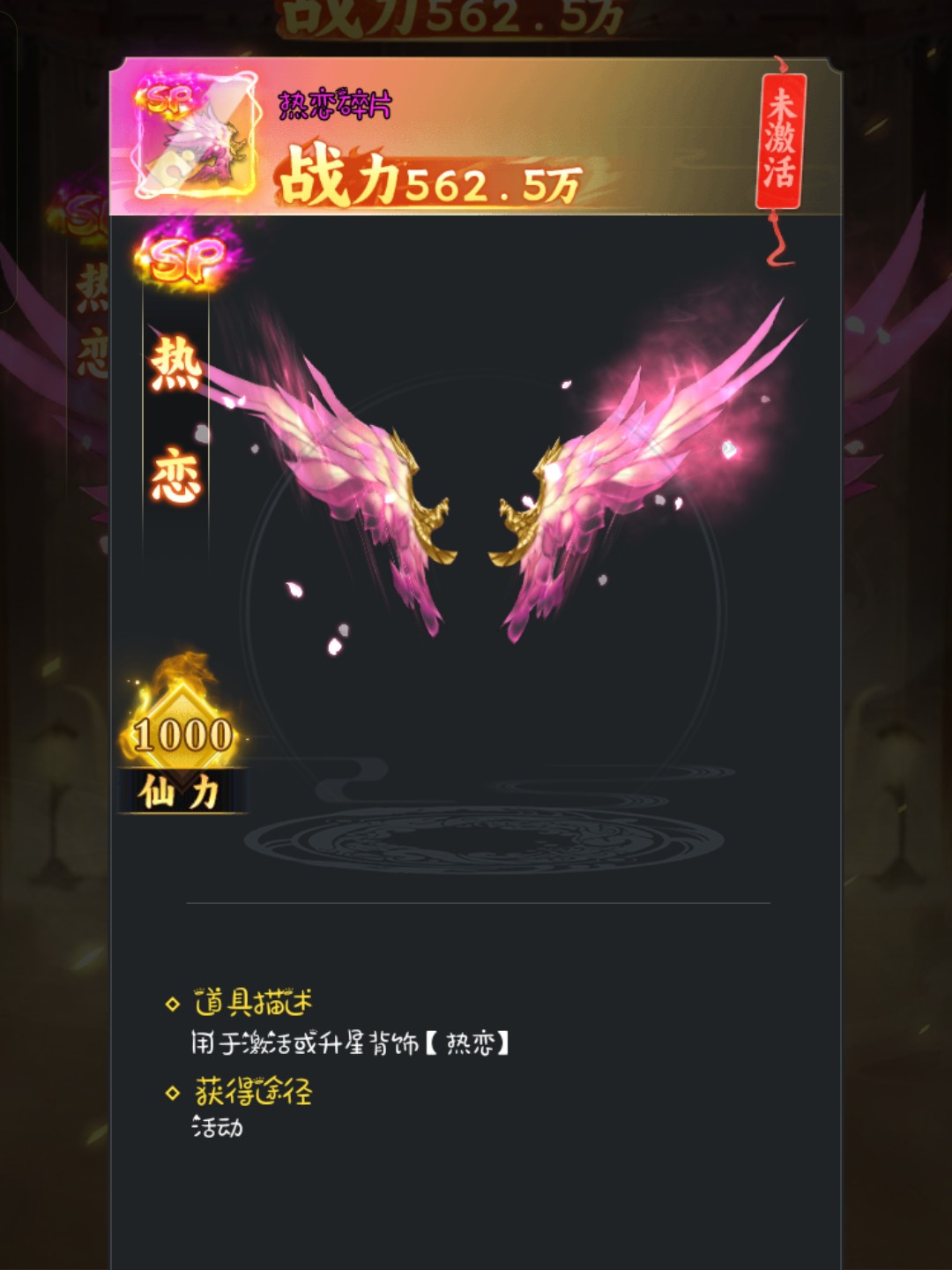 解锁SP级热恋天降背饰,直接斩获562.5万战力加持,成为仙侠养成中颜值与战力双绝的顶级选择!这对粉紫羽翼造型绝美,翎羽层叠且流光萦绕,振翅时粉光漫天,将仙侠世界的浪漫与仙气完美融合,视觉上堪称背饰颜值天花板。激活与升星需使用热恋碎片,该道具仅能通过活动获取,还能为角色增加1000仙力,是后期提升战力的稀缺资源。背饰所在的“天降套装”系统倒计时仅剩3天6小时,错过活动期可能就错失获取碎片的最佳时机,收藏与养成价值拉满。即便尚未激活,仅从战力面板就能看出这对背饰的含金量,562.5万的战力加成能让角色实力实现跨越式提升。赶紧抓住活动窗口期攒碎片,解锁「热恋」背饰,既能收获绝美羽翼,又能登顶战力榜,振翅翱翔仙侠天地!