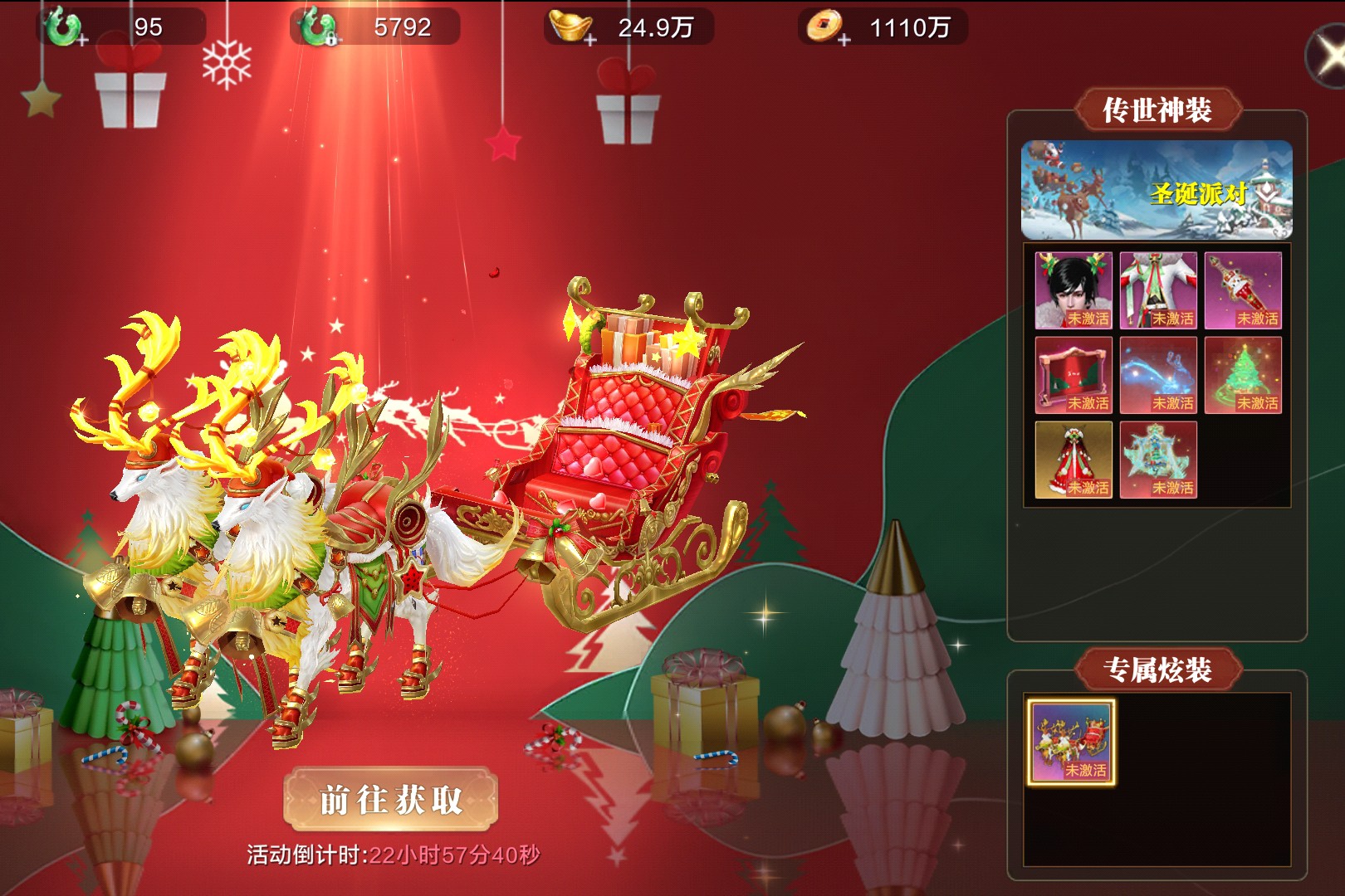 圣诞主题的炫装上新界面满是节日气息,红白色调的时装搭配麋鹿角装饰,把仙侠角色的清冷感揉进了圣诞的温馨里,手持的圣诞杖特效闪着冰晶光效,细节拉满。右侧的传世神装栏里,圣诞派对系列的外观全都标着“未激活”,每一款都是限定的节日美学。切换到坐骑界面,“与鹿伴行”的圣诞雪橇坐骑更是惊艳——鎏金麋鹿拉着红绒雪橇,金铃与彩带点缀其间,仙侠的缥缈与圣诞的浪漫完美融合。活动倒计时只剩22小时,这些限定外观和坐骑都成了限时的诱惑。仙侠游戏的节日炫装向来是收藏党心头好,这款圣诞派对系列不仅颜值在线,还带着专属的节日特效,可解锁的门槛让这份浪漫暂时只能远观。是趁活动冲资源解锁,还是看着倒计时遗憾错过?圣诞的福利争夺战,从来都这么让人纠结。