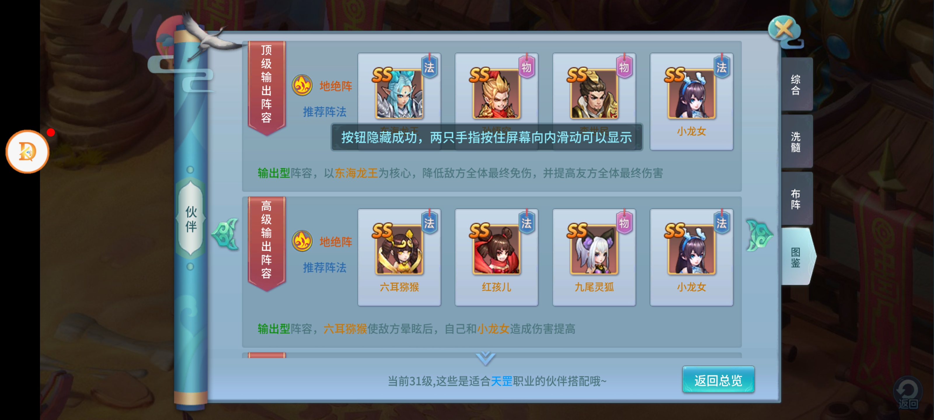 1.阵容方面在55前其实比较随意。55之前培养龙女即可。猪八戒和其他抽到的SS用用就行了,不必花精力培养。推荐55后的阵容。 2.推荐下阵容和伙伴技能 龙女:法连>挑衅>敏捷>加伤害的随便(法连加点伤害吧,龙女到后面也没什么伤害。挑衅很好用,谁用谁知道。至于敏捷是因为龙女第一回合是群体减别人控抗。所以除了主角当然最好优先出手。如果你速度够那不要敏捷换个别的也没问题) 3.猪和牛:连击>谋略>罗衣>防御向的随便(连击的目的不是增加伤害,是增加嘲讽的几率。谋略也是增加嘲讽的几率。最后的罗衣是因为是个人是个怪都有连击。所以带个罗衣相当于百分之18减伤 4.金角和沙僧:连击>必杀>爆追>吸血 各种奶妈:固本>净化>必杀>随便。+++龙女金角银角牛(重点培养金角)。金角是最强输出!银角只是被动给金角攻击力打打酱油。牛可以换成猪。