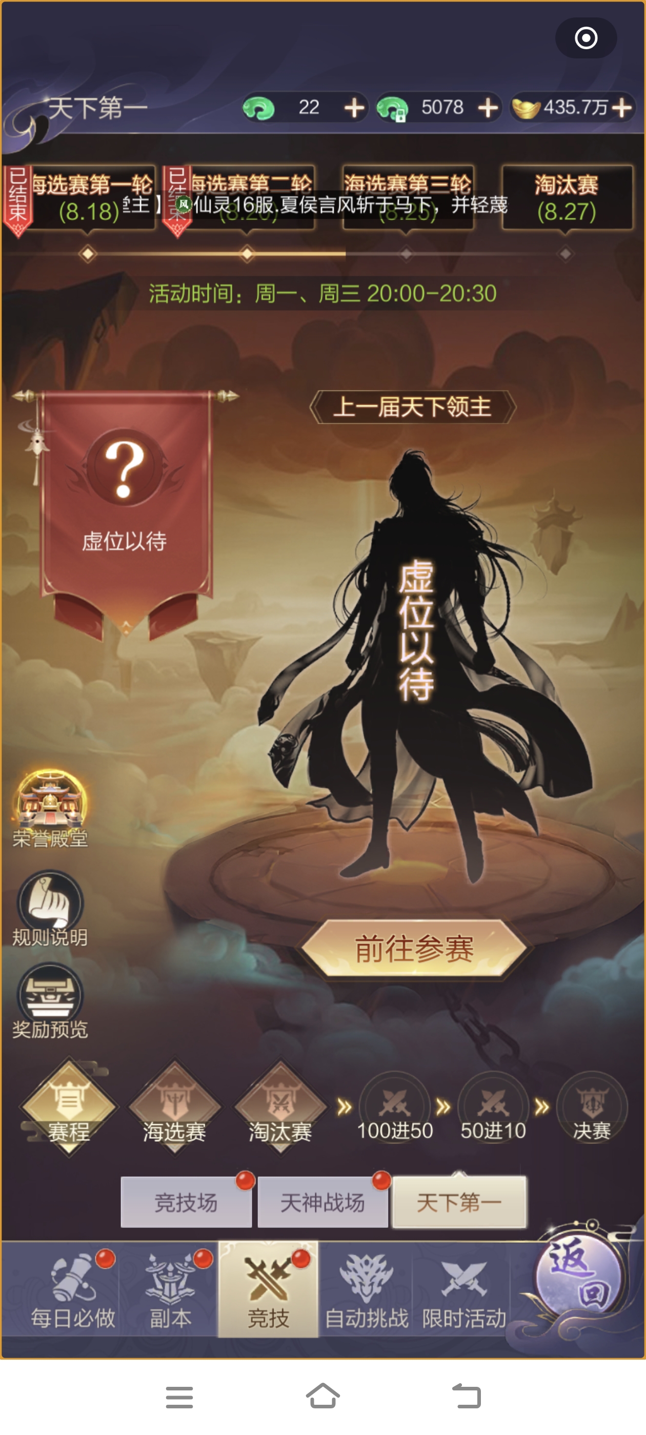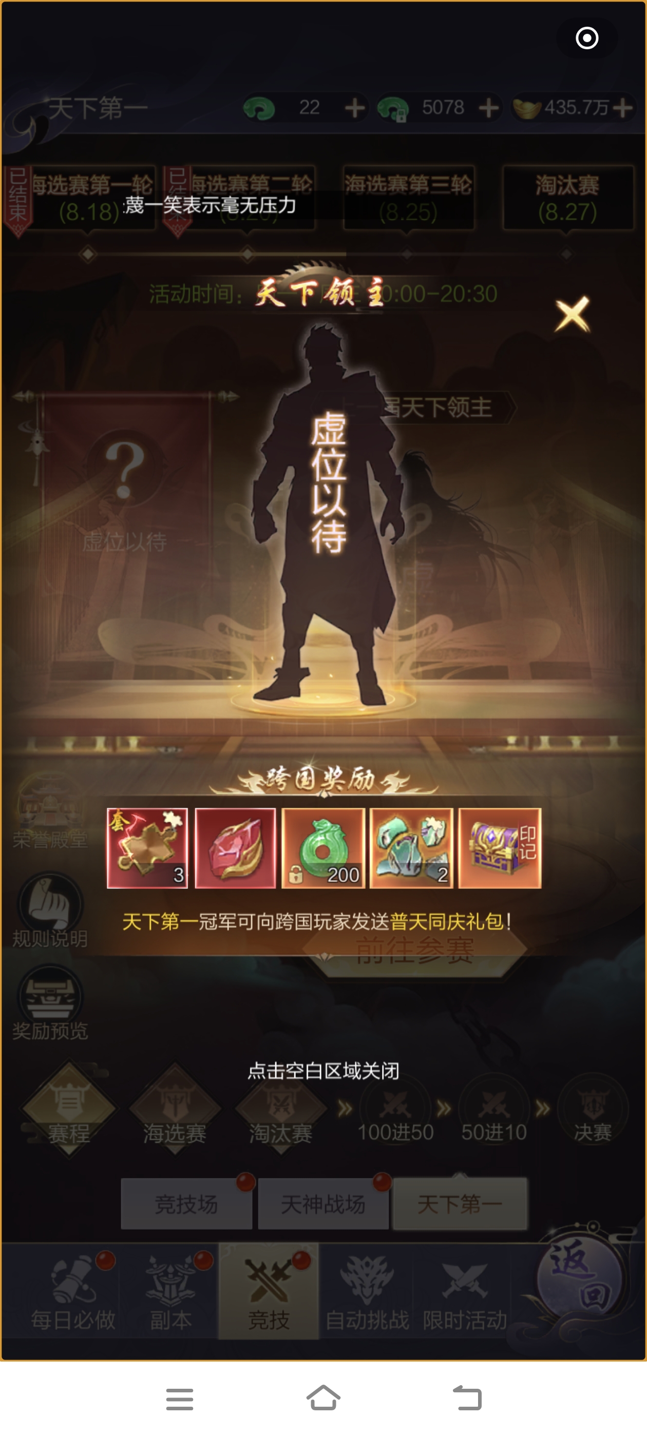“天下第一”是跨服顶尖竞技活动,汇聚两跨区、八国高手,打破国别阵营界限,上演1对N的热血对决。活动分三轮海选赛与一轮淘汰赛,海选以战斗积分为核心,排名前10者晋级决赛。 + 低战力玩家可借兜圈战术规避淘汰,高战力玩家能通过击杀累积复活次数。决赛排名决定奖励层级,不仅有珍稀道具,更能彰显全服顶尖实力,是检验策略与战力的终极舞台。