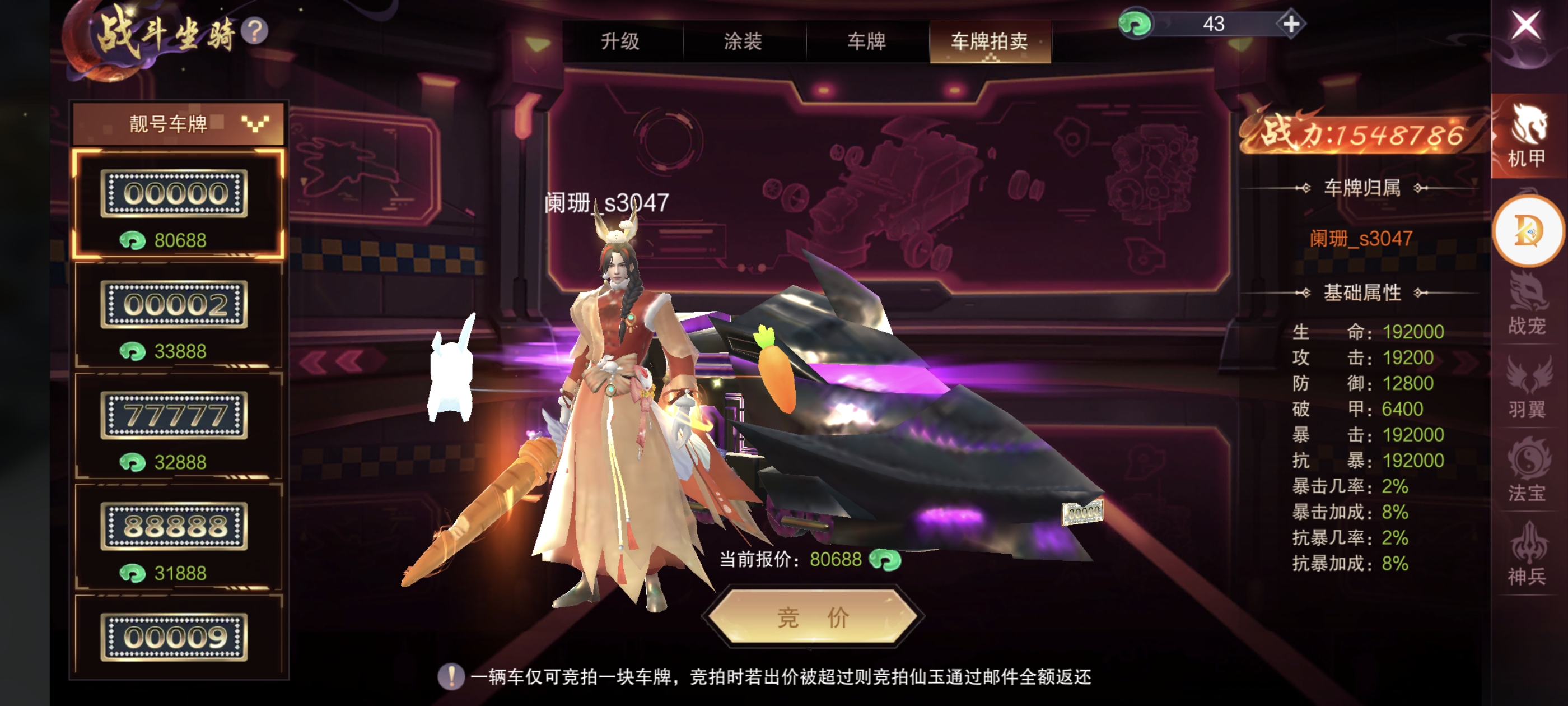 车牌是彰显身份的珍稀装饰,与坐骑、机甲等系统关联,佩戴后可直观展现玩家实力与格调,是社交与炫耀的核心标识之一。 车牌获取以“车牌拍卖”为核心途径,通过夺宝机制随机生成唯一号码牌,抢到对应号码即可获得大奖车牌,号码越少时夺宝中大奖概率越高。部分稀有车牌不仅外观独特,更能附加战力加成,成为高战力玩家追捧的顶级装扮。
