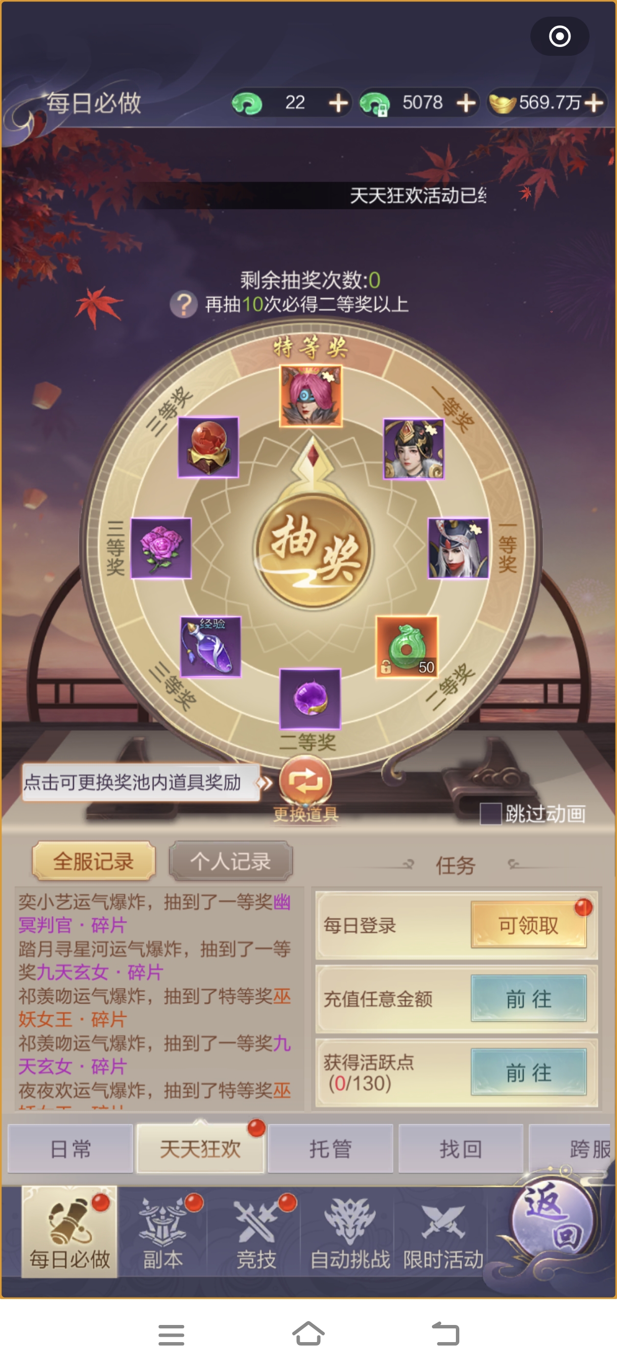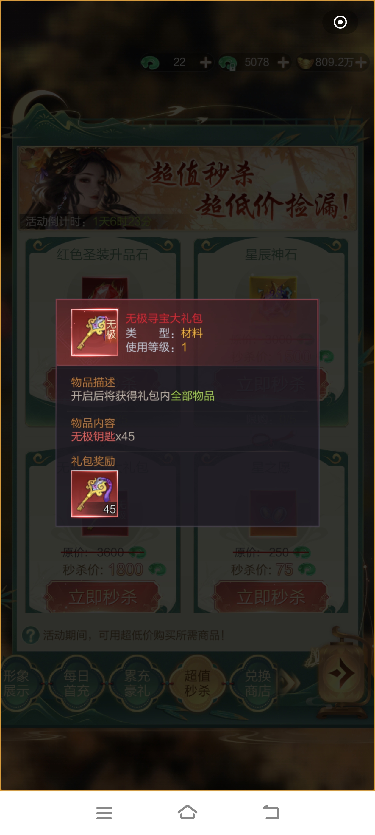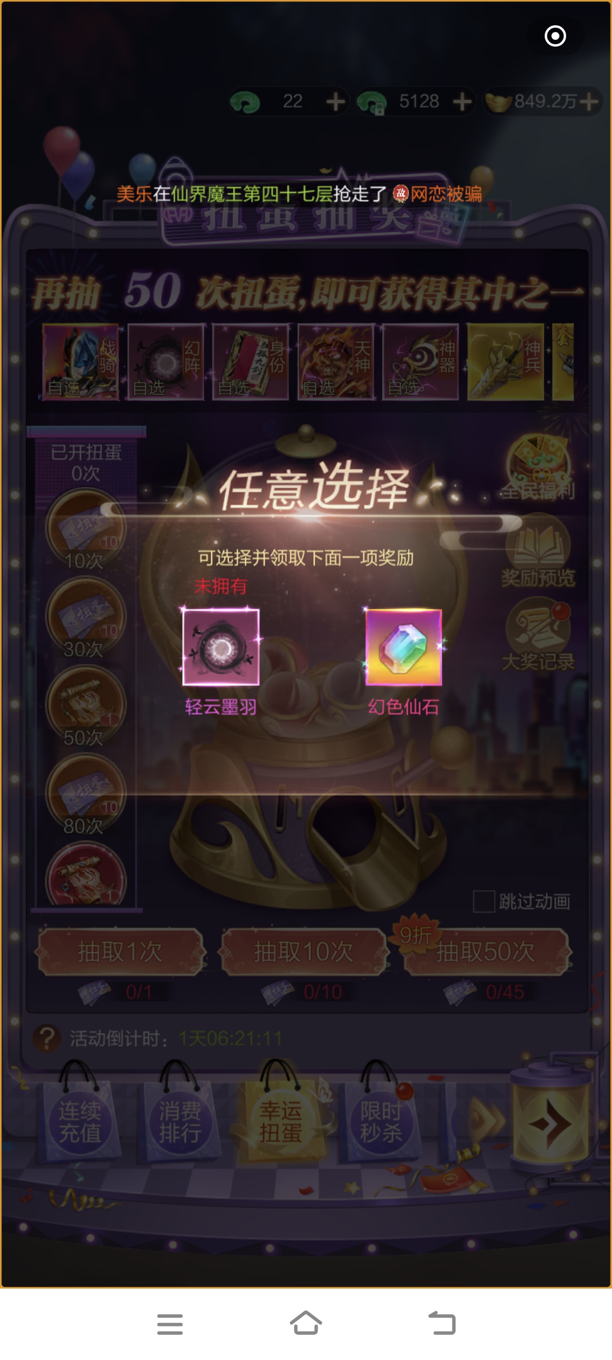 全民夺宝活动开启仙途狂欢,玩家消耗指定道具即可购买宝物份额,争夺珍稀奖励。奖池涵盖高阶装备材料、稀有坐骑碎片等重磅好物,更有幻彩级道具暗藏其中。 + 当宝物份额满额便进入开奖倒计时,系统随机抽取幸运者发放大奖,未中奖者也能获对应参与奖励。每日固定时段还会对未填满份额的宝物补全开奖,神秘人兜底让获奖机会不落空,全民皆可参与这场寻宝盛宴。