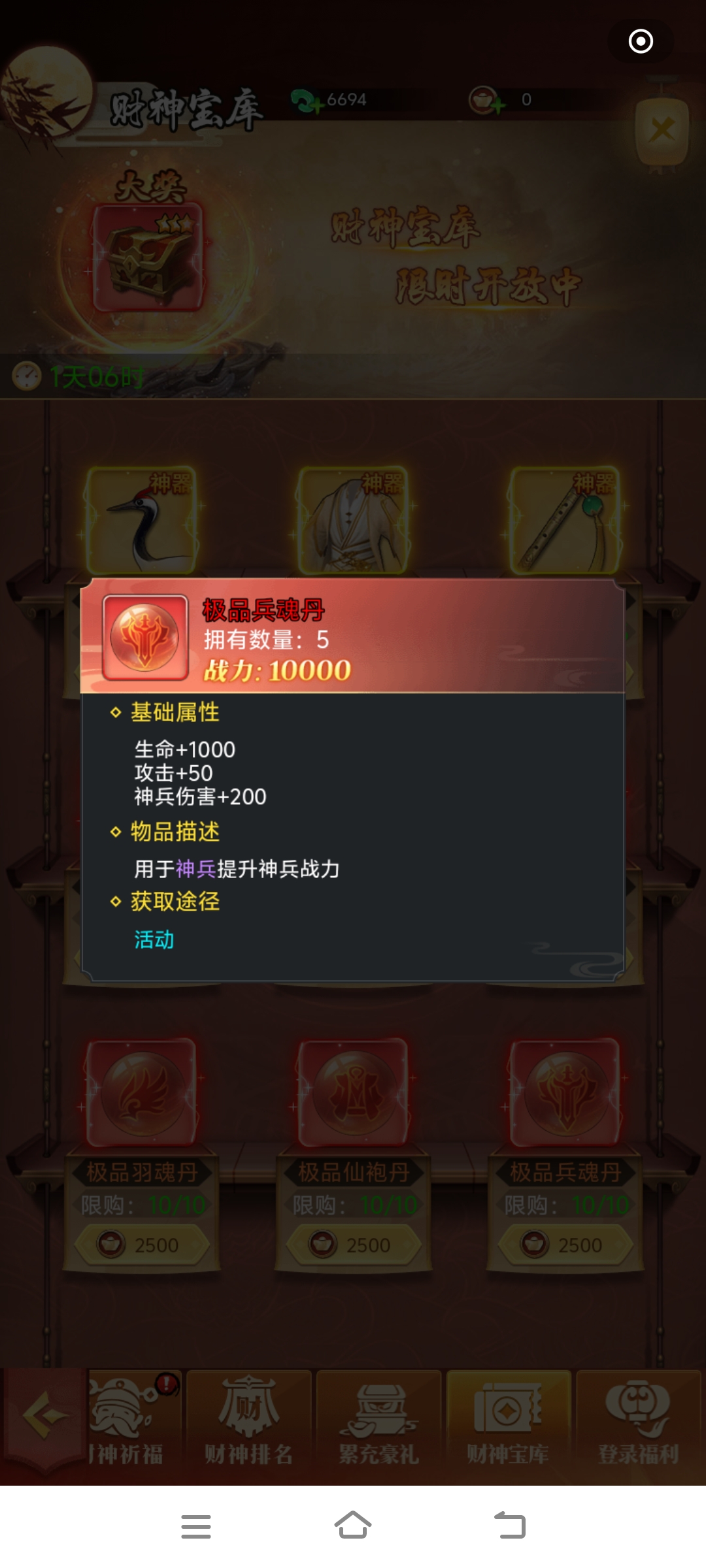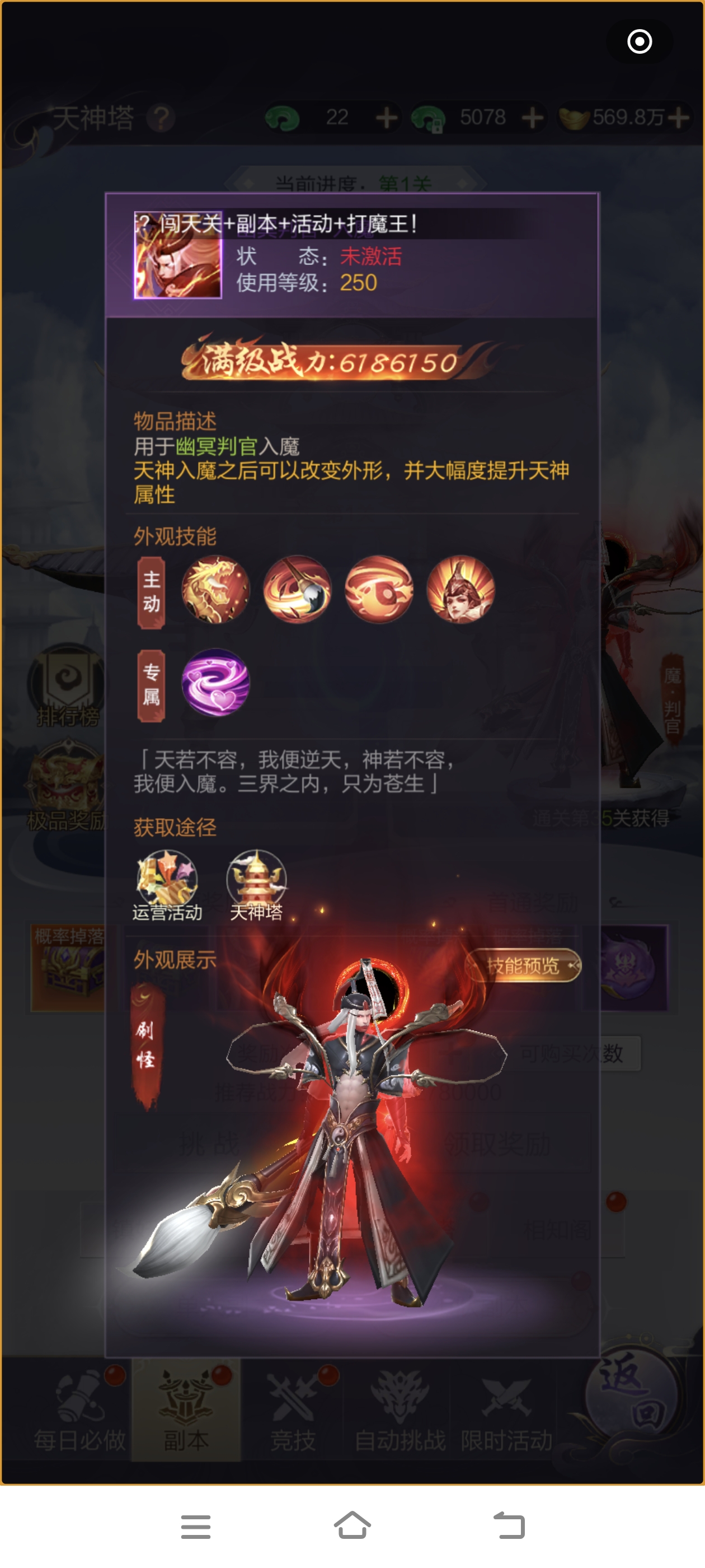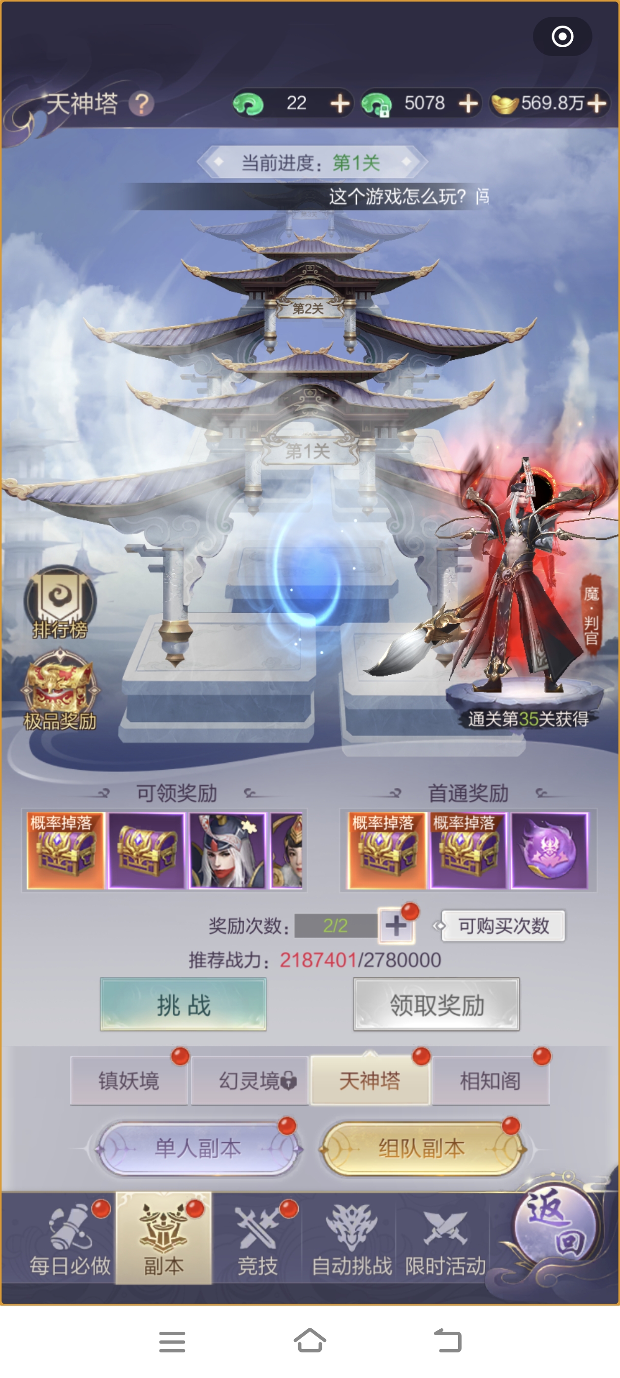 天神塔奖励随层数递增愈发丰厚,每日可不限次挑战,通关后支持扫荡,VIP等级提升可增加扫荡次数。基础奖励含天神元魄、神通书与天神碎片,助力提升天神等级、合成新天神。通关固定层数可解锁极品奖励,如判官、杨戬等稀有天神,更有天神神器、入魔石等道具,能激活天神魔神形态,实现外观蜕变与战力飞跃。