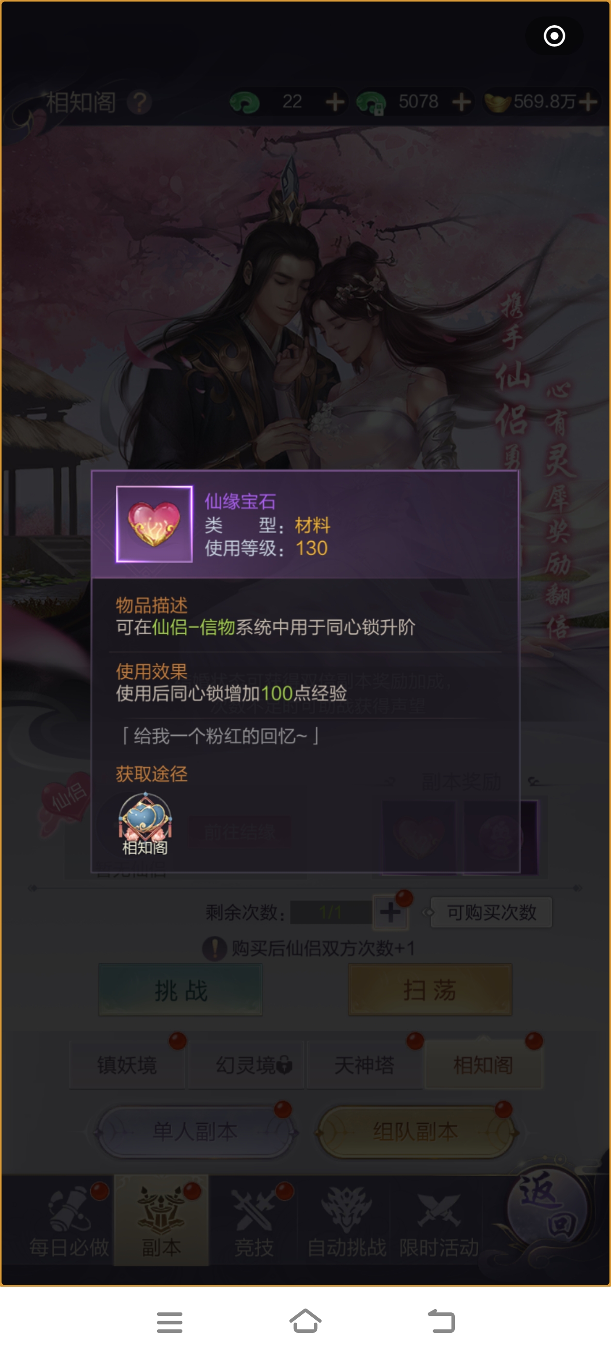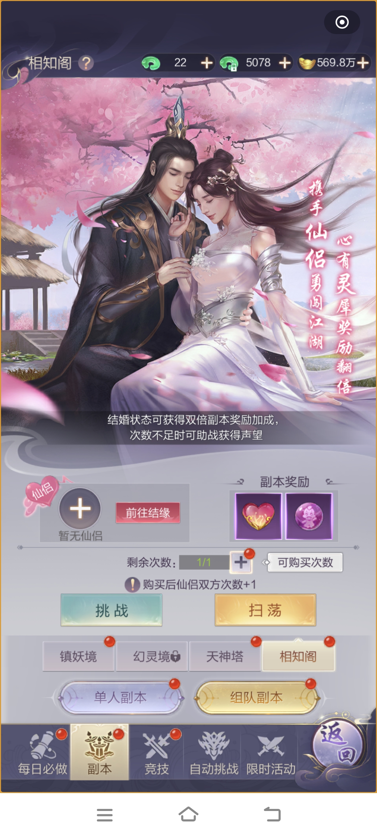 仙侣副本需双人组队进入,支持与玩家伴侣或好友组队挑战,每日可免费参与并额外购买次数,副本场景设定在仙缘灵岛,氛围感十足。通关过程含“心有灵犀”考验,双方需从鲜花、喜酒、糖果三种图案中选择,选对相同图案可获双倍奖励,事先约定选择类型能提高成功率。奖励含情缘值、战力加成道具,累积情缘值可解锁仙娃、同心锁等系统,助力战力提升与玩法进阶。