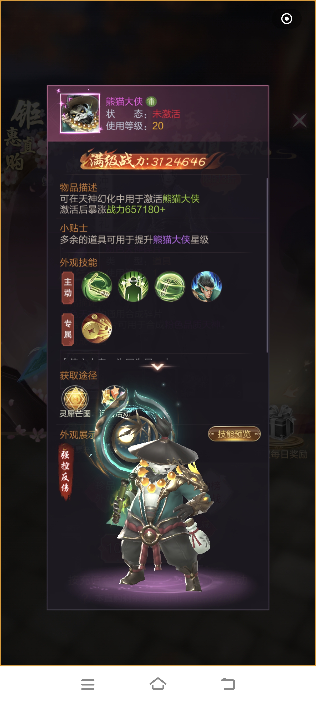 天神熊猫是游戏中具备辅助增益能力的实用天神,常与盘古等强力天神搭配出战,二者协同可激活伤害加成与减免的羁绊效果,大幅提升队伍实战能力。 + 其获取主要依赖运营活动及合服后的扭蛋玩法,虽非初始易得,但养成后价值显著。作为团队增益型天神,它能为出战阵容提供关键属性加持,搭配天神圣装后属性加成进一步放大,是中后期组建强势天神队伍、强化战力体系的重要选择。