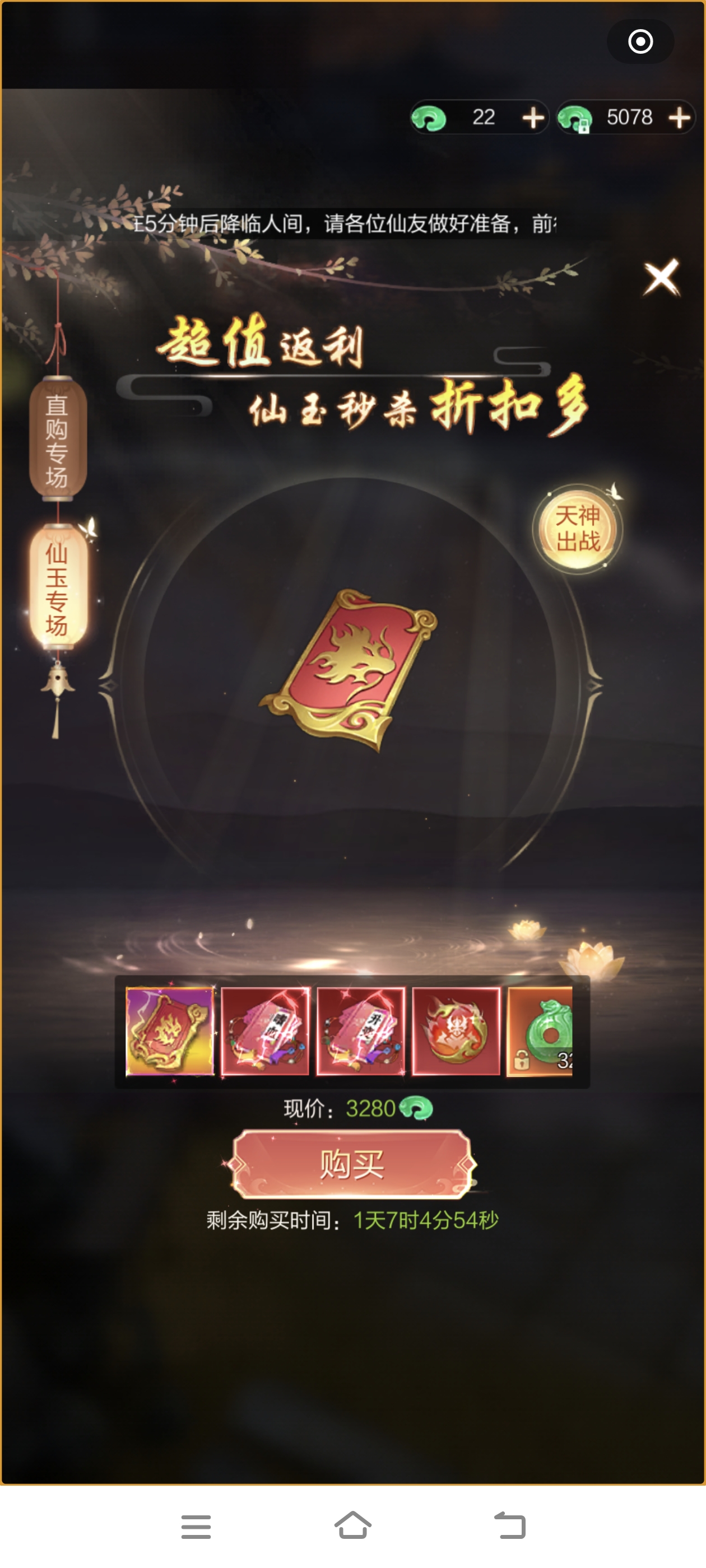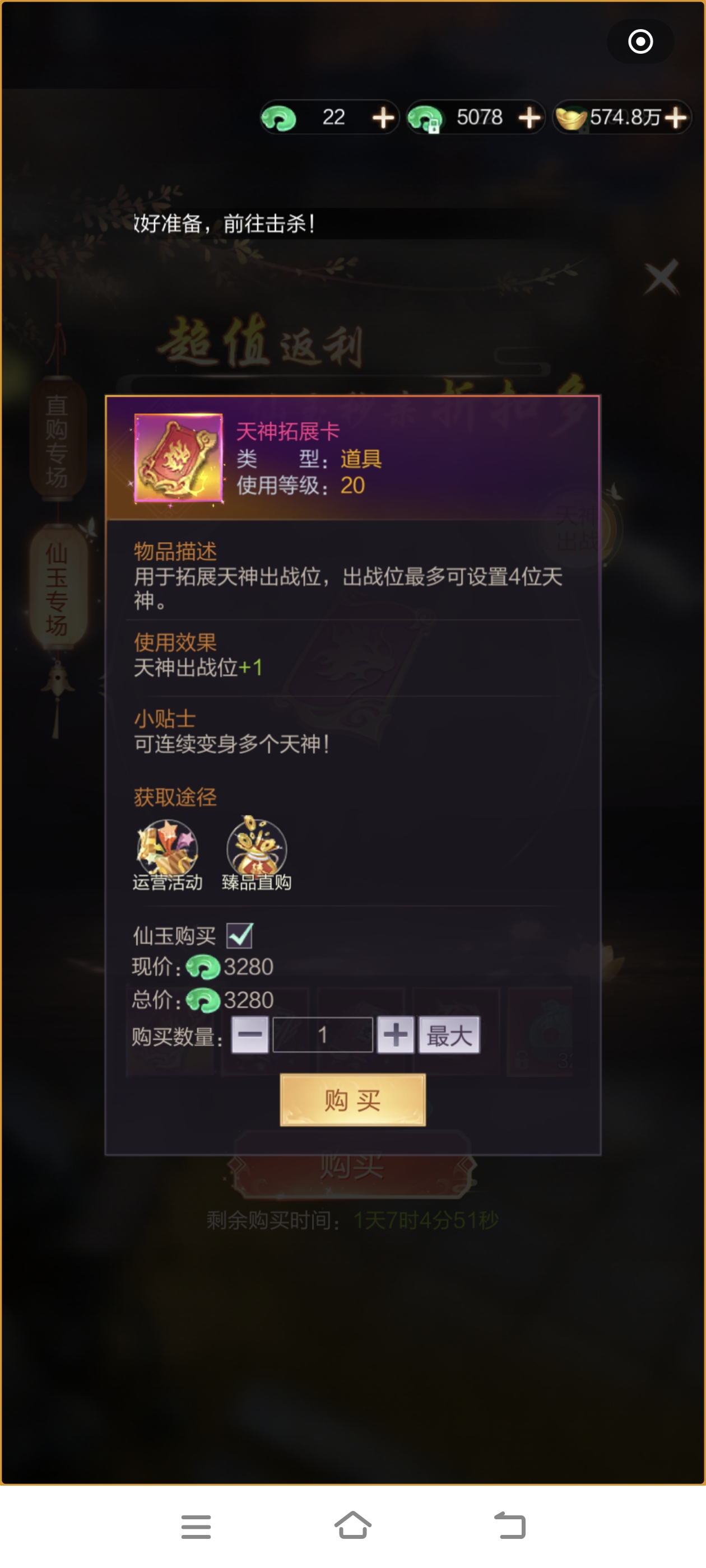 天神出战卡是提升战力的关键道具。玩家可激活4个天神出战,前两个随等级解锁,后两个需花费3280绑元或元宝购买天神出战令激活。技能配置可拖动调整顺序,挂机优先释放最左技能,还能根据系统推荐一键上阵天神光环,助力玩家在仙侠对战中披荆斩棘。