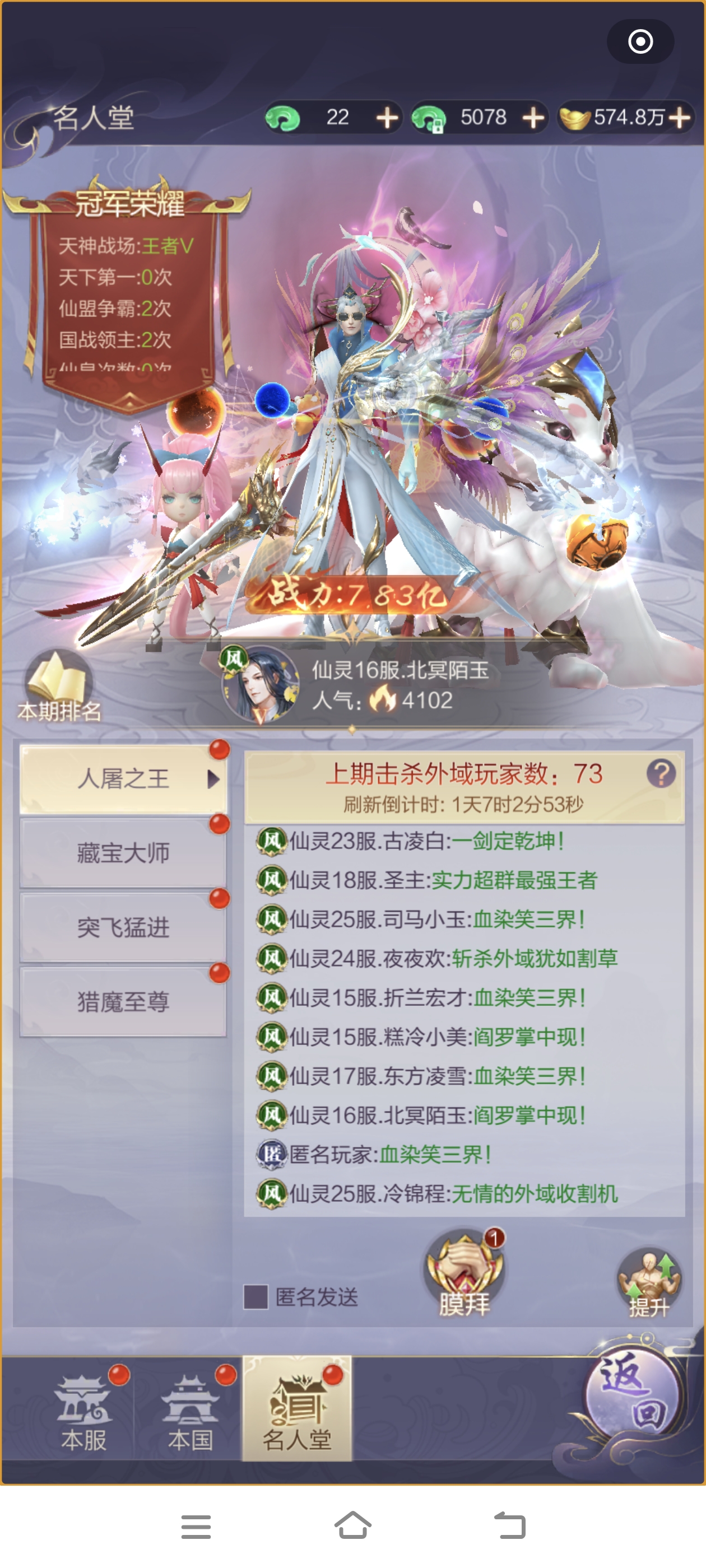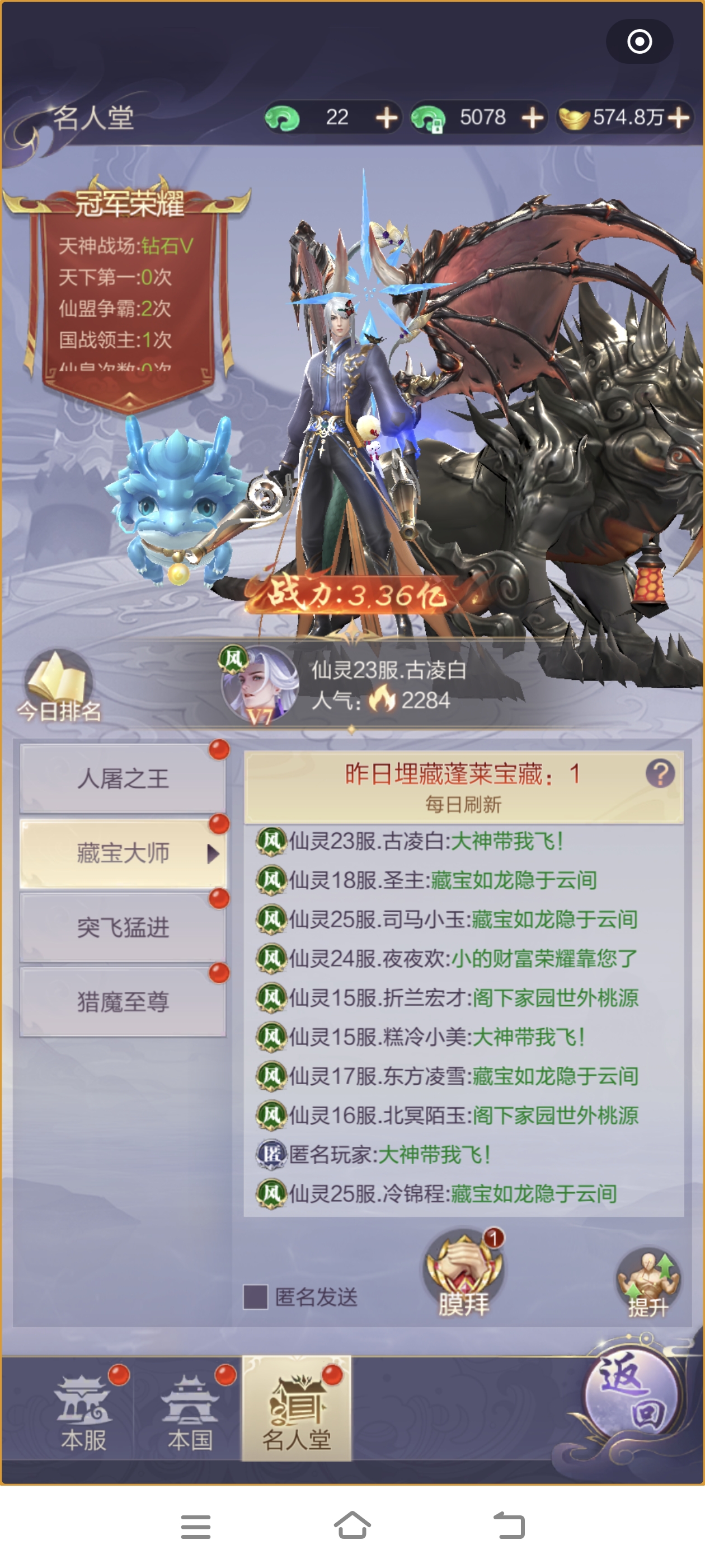 《巨龙猎手》财神排名以祈福积分论高下,榜单实时刷新,榜首常年被氪金大佬占据,其积分往往是榜二的数倍。前三者可斩获橙色秘宝、大量仙玉等顶级奖励,四至十名能获得伙伴升级材料与铸币。 玩家通过财神祈福积累积分,高频率参与活动是冲榜关键。榜单每日结算前竞争最激烈,末位玩家常因积分微弱被超越。上榜者不仅得丰厚奖励,其ID还会全服展示,成为众人艳羡的对象。