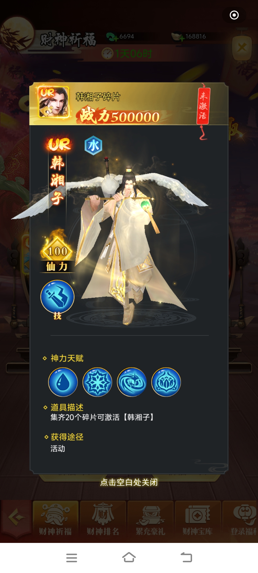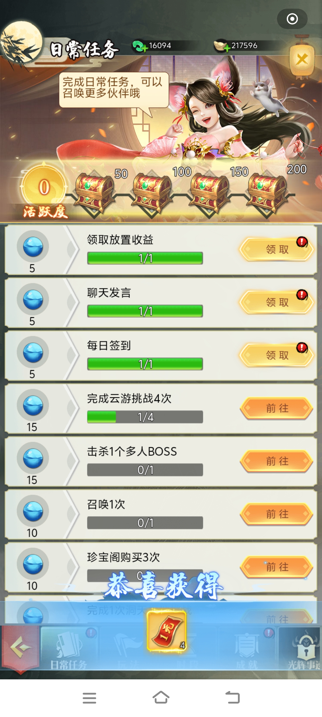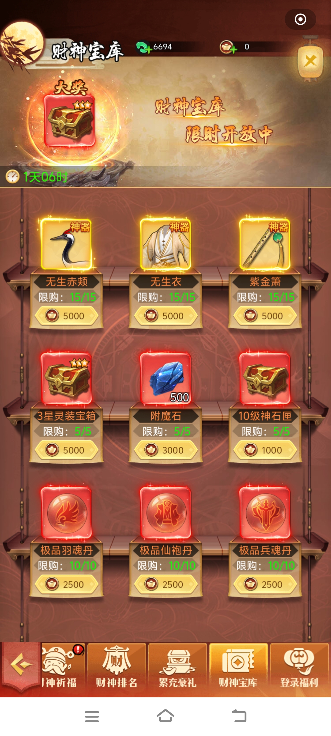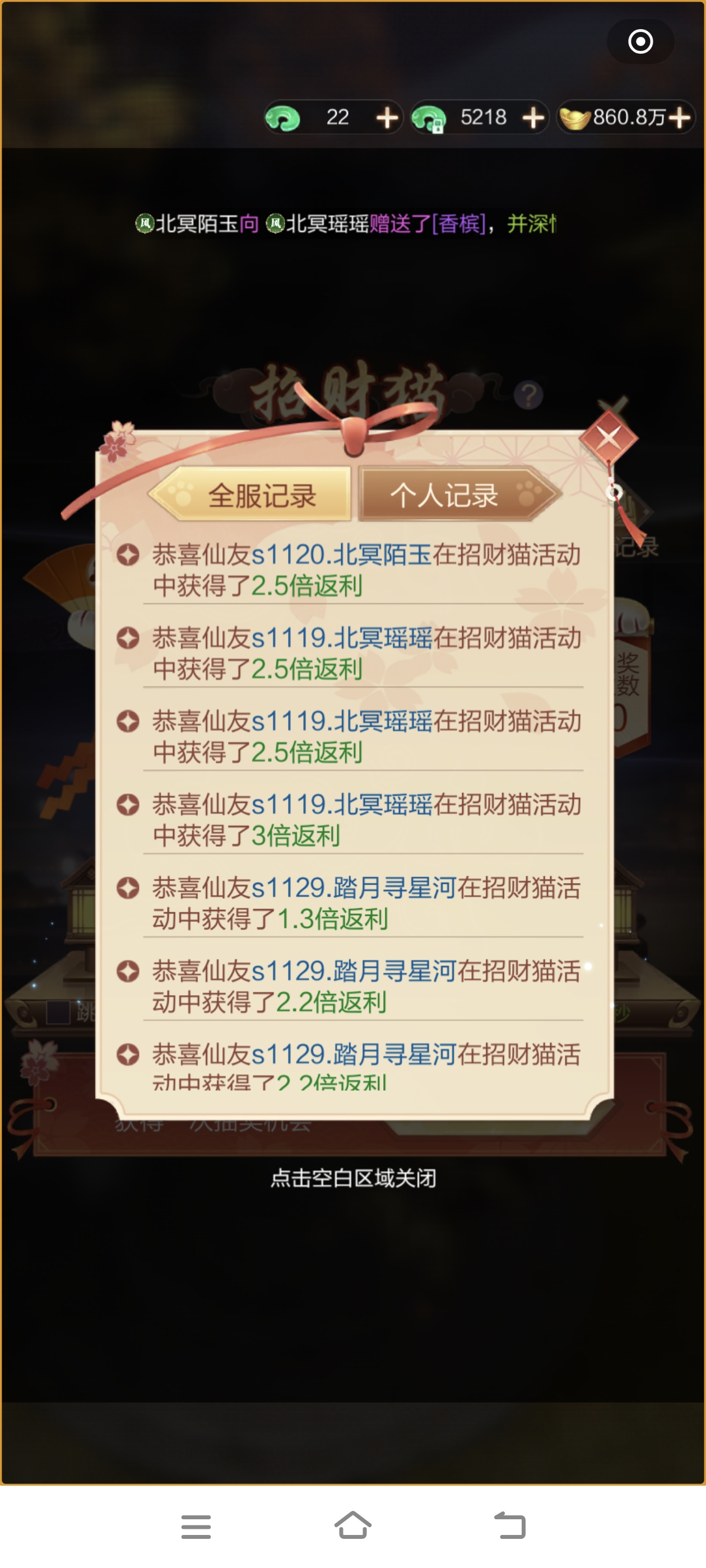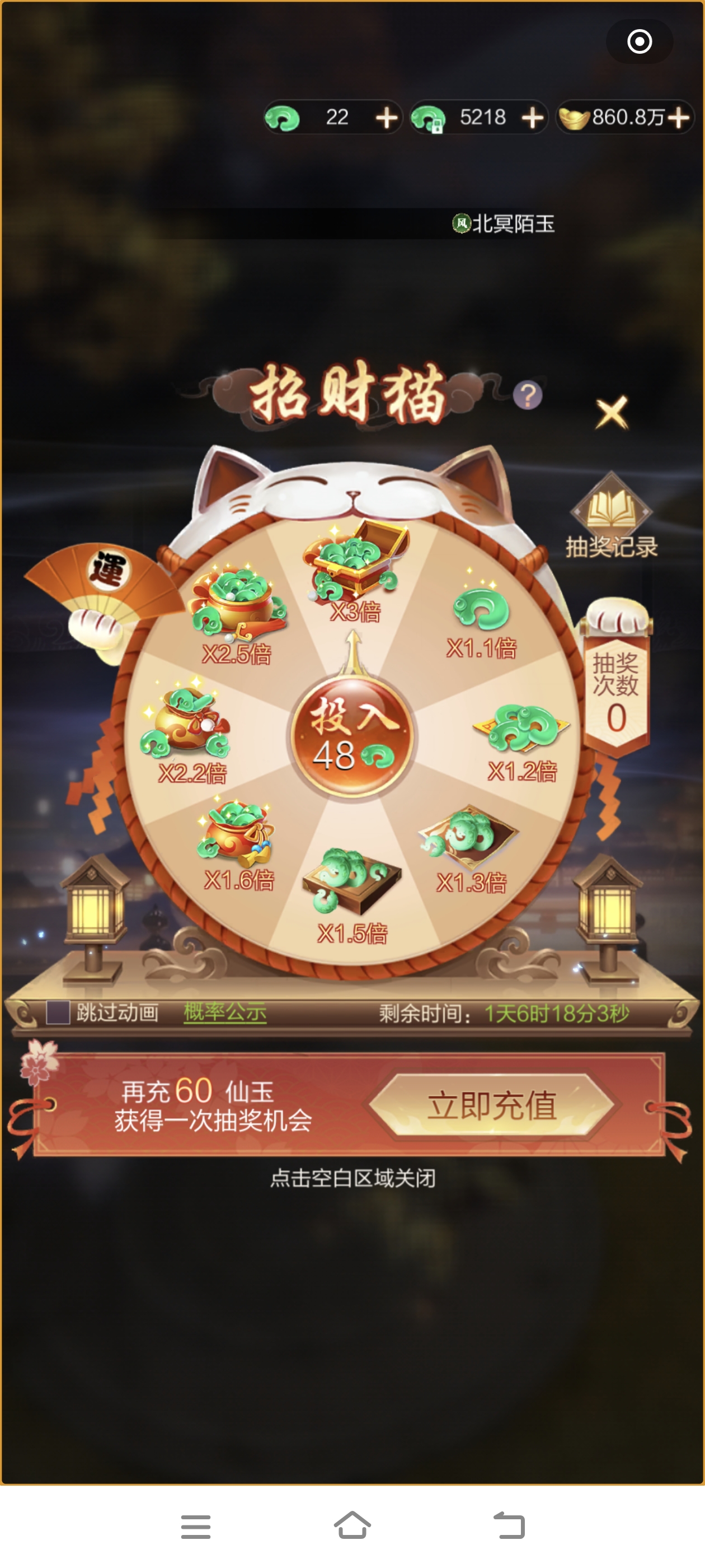 招财猫系统名为“招财进宝”。玩家点击游戏界面的“招财猫”图标即可进入。充值达到一定额度后,可获得转盘抽奖机会,投入仙玉转动转盘,有机会赢取大量绑定仙玉。该活动每天重置抽奖次数和充值档位,为玩家提供了获取绑玉的好机会。