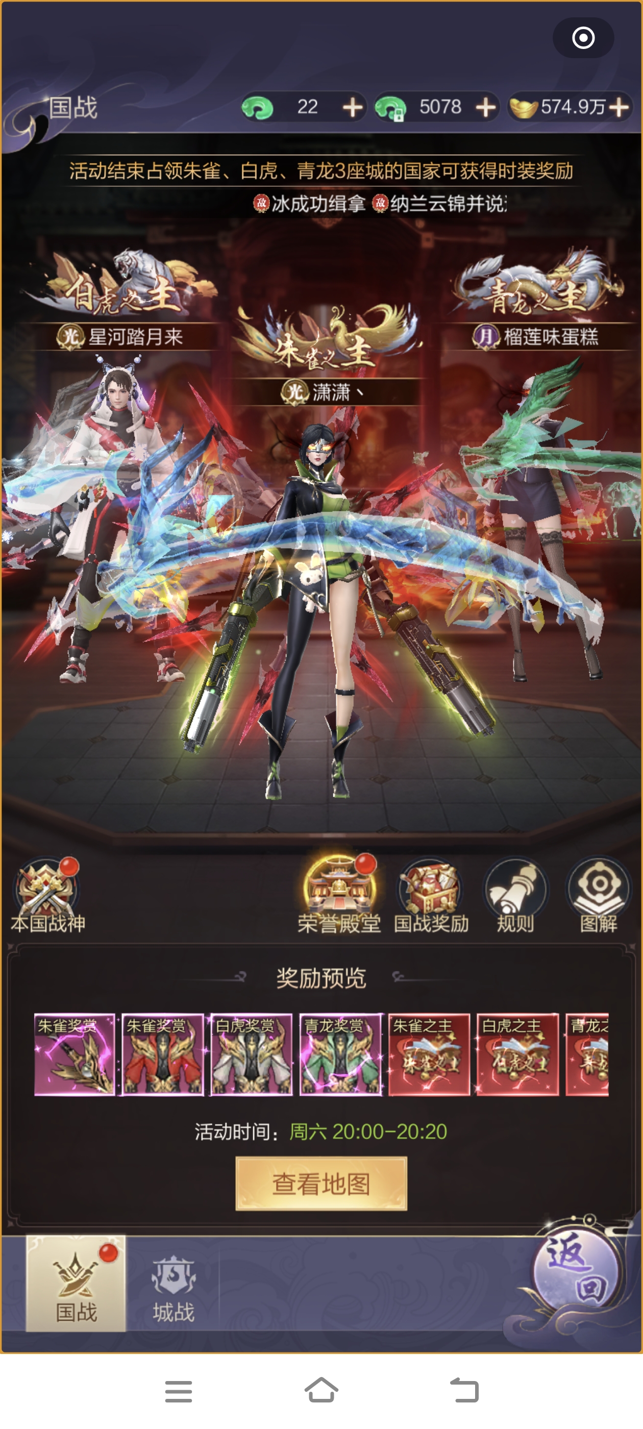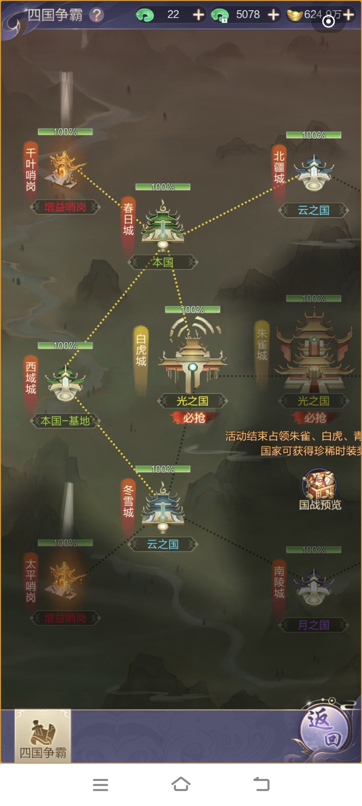 四国争霸是每周六晚开启的跨区阵营对抗盛宴,四大区各自为战,上演热血厮杀。活动分两阶段,玩家需采集高品水晶赚积分,虽会减速但收益丰厚。战场中,白虎城等四座城池是核心争夺目标,占领可获珍稀道具与阵营属性加成。每阵亡5次可解锁无敌技能,助力续航作战。最终冠军阵营功勋榜首者将荣膺【争霸四方·唯我独尊】限时称号,彰显王者荣光。