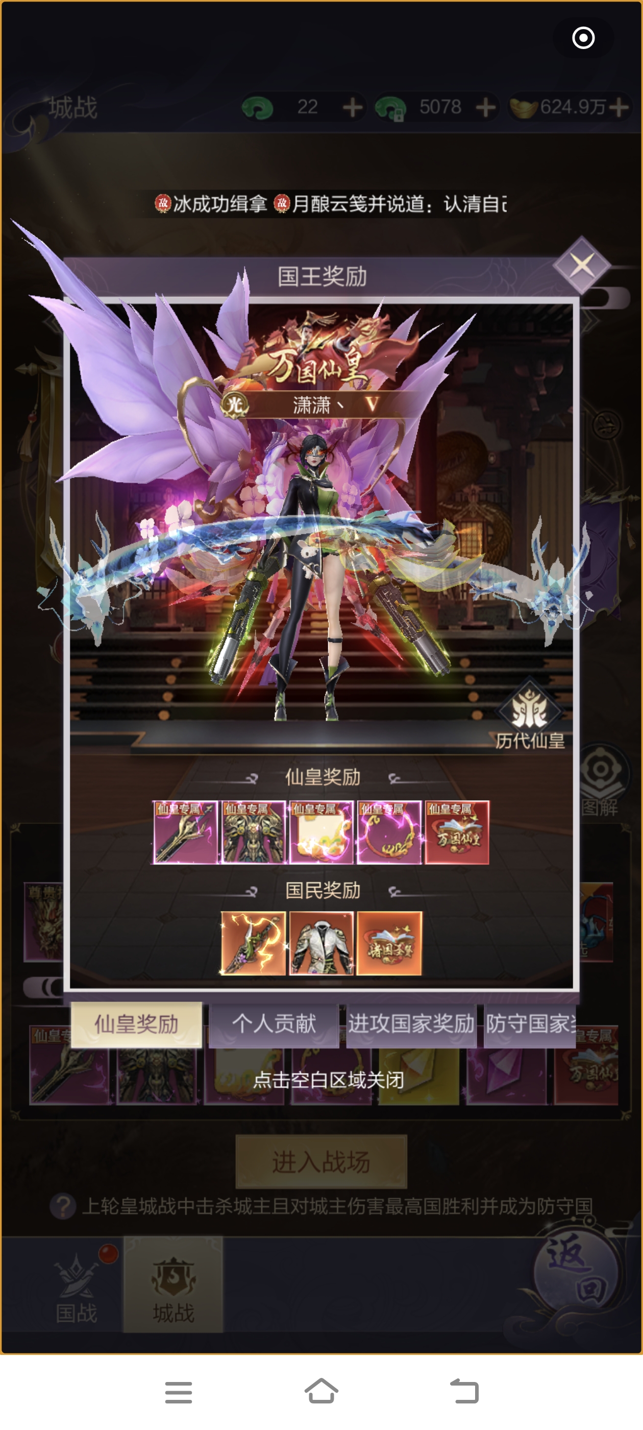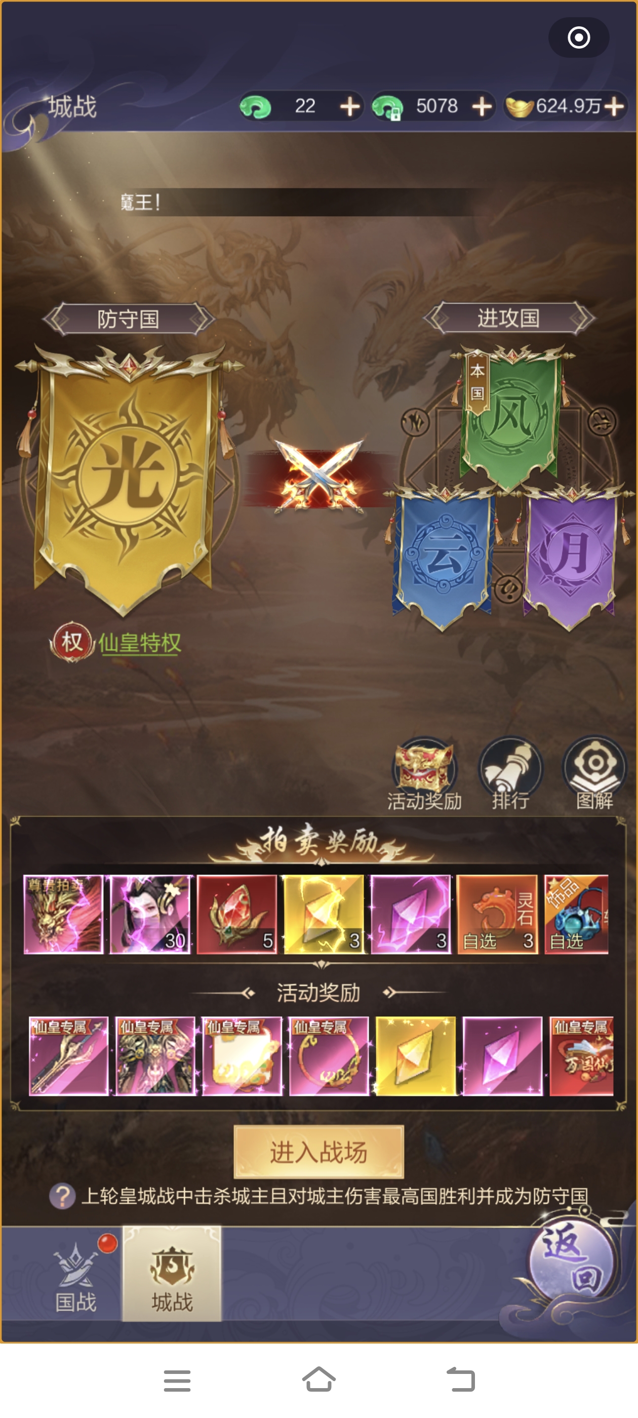 “万国仙皇”核心玩法为跨服国战“夜战皇城”,每周日晚开启,是游戏中规模宏大的空战对抗。玩法分攻防阵营,进攻国需先击溃皇城将领,才能对城主造成有效伤害,三国中伤害最高者将成为新的防守国;防守国则由国内贡献最高者执掌仙皇之位。 高战玩家可变身龙骑,借神兽加持提升伤害,是冲击城主的关键;低战玩家则负责地面牵制。仙皇可为本国争取仙玉返还福利,且刷新宝箱必出红色,7天能刷35个红宝箱,福利丰厚。