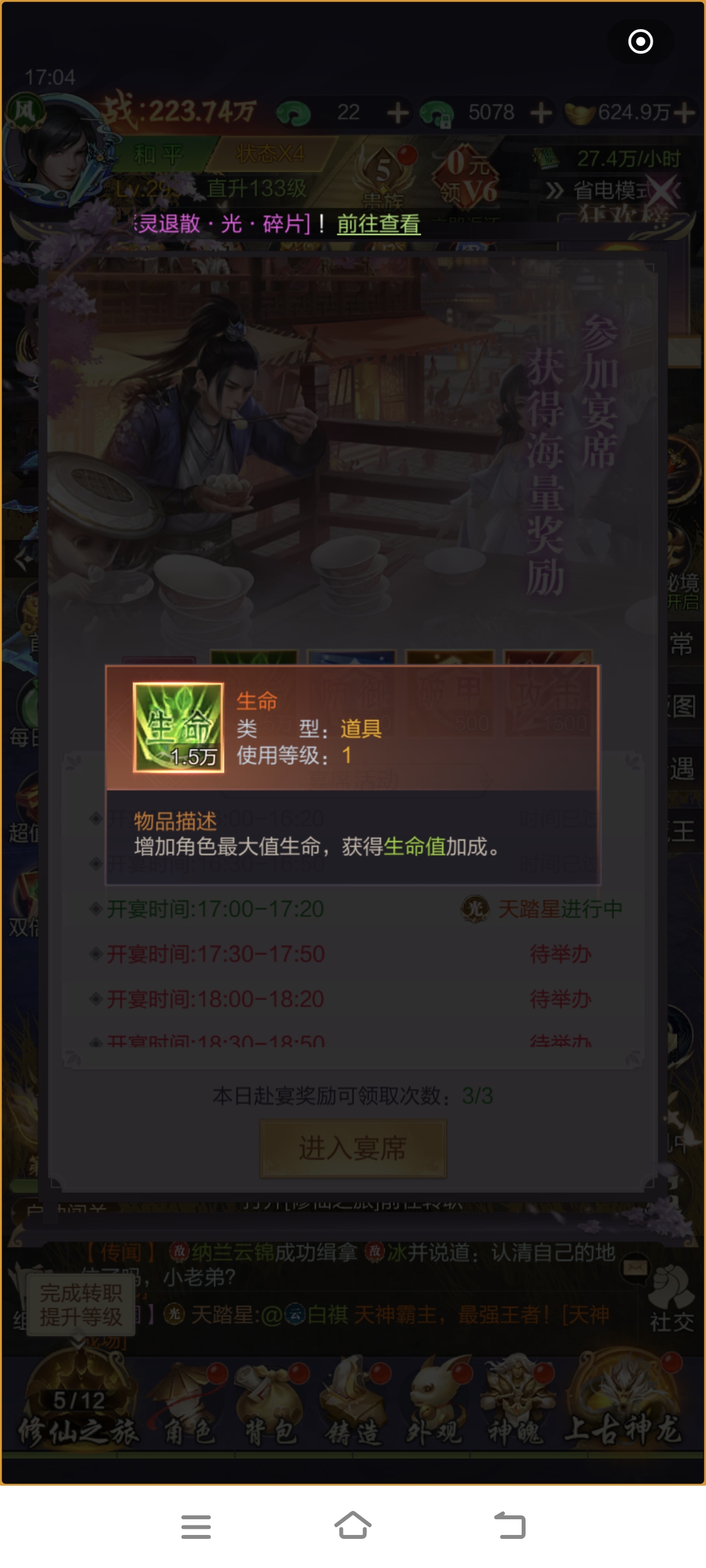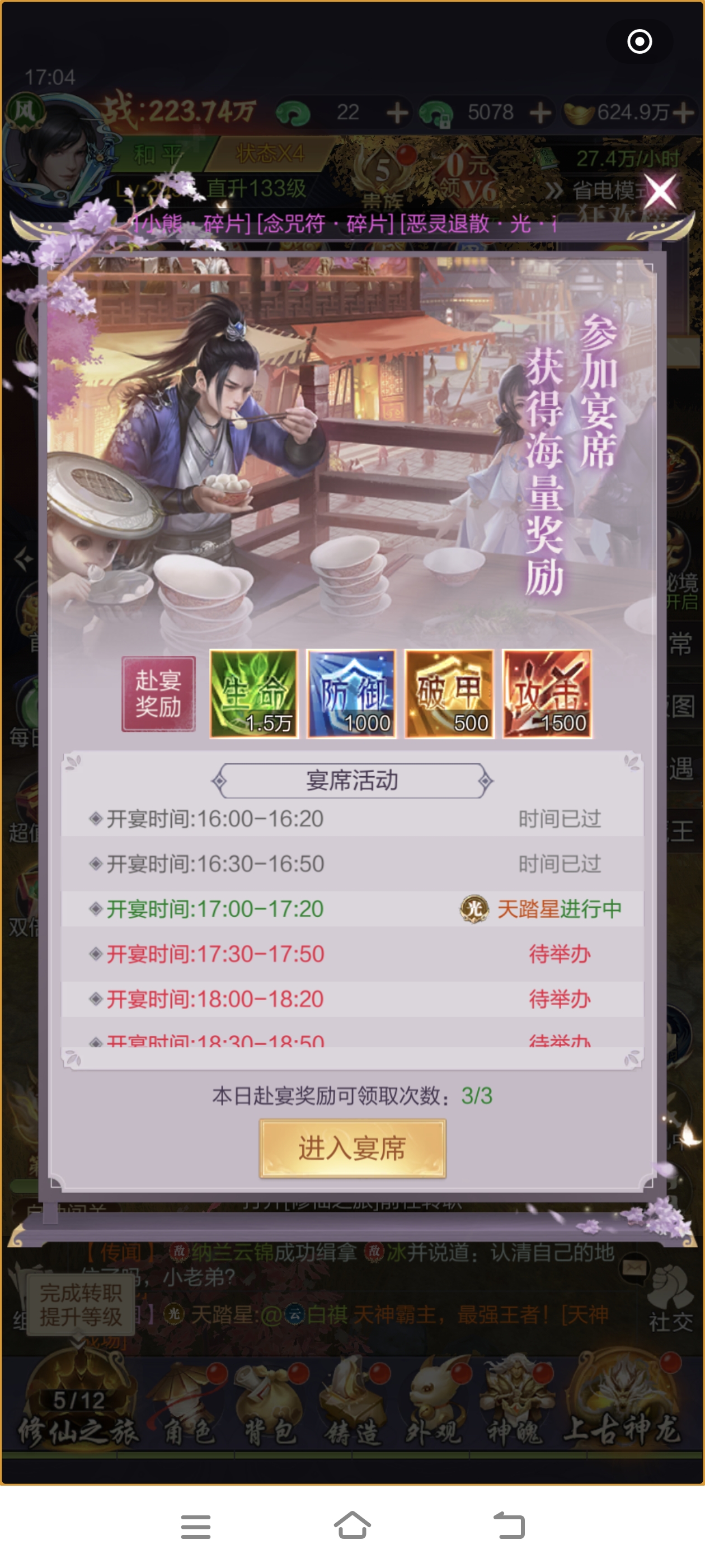 隐士宴席是隐士身份玩家的特色玩法。玩家需利用化鲲带回的食材制作菜肴来开启宴席。宴席开启后,玩家可与其他玩家一同享用美食,享受悠闲的社交时光,同时还能获得建材、食材、道具等奖励,提升隐士身份等级。这一玩法为玩家在紧张的修仙战斗之余,提供了别样的休闲体验。
