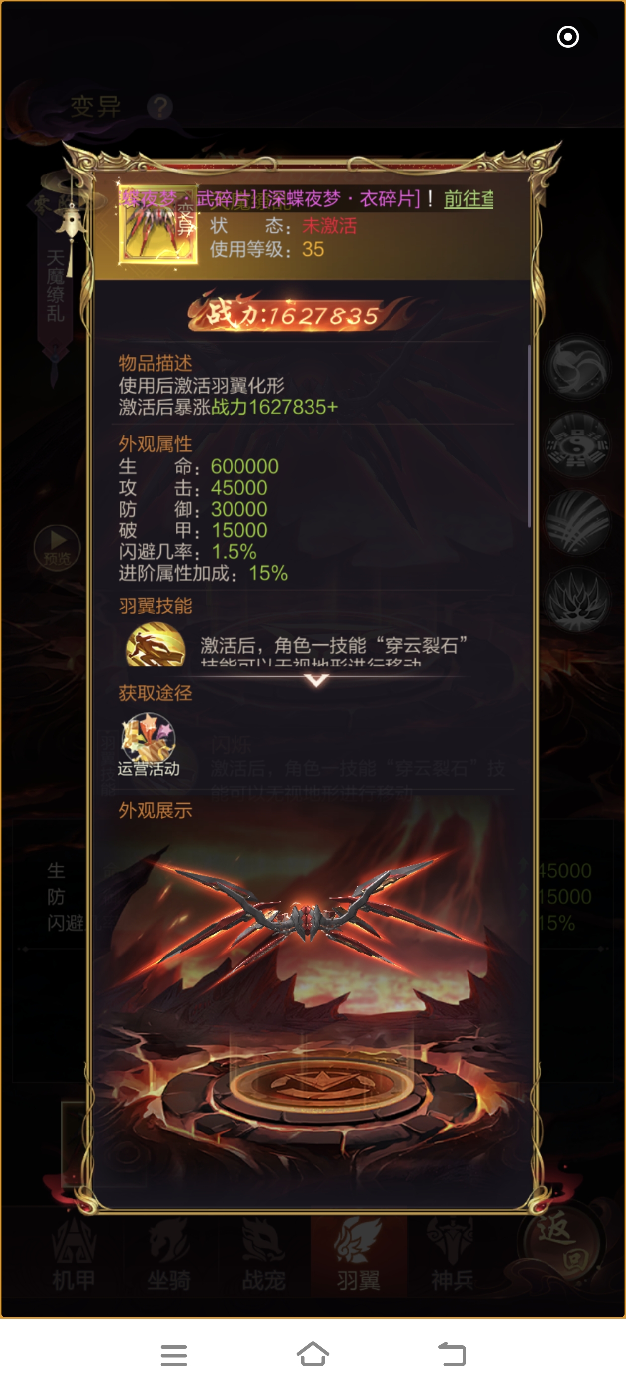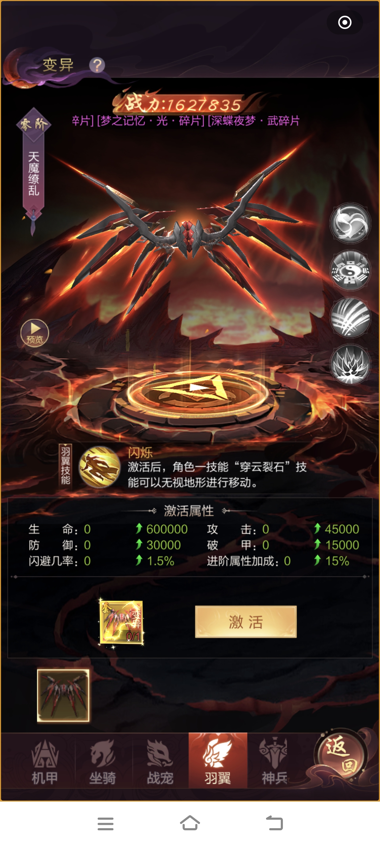 变异翅膀是仙途顶级战力象征,需经特殊材料淬炼或限定活动获取,概率珍稀至极。外观自带专属流光特效,「天魔缭乱」覆幽冥鬼火,「碧空幻影」缀星辰碎光,辨识度拉满。 + 不仅带来生命、攻击等巨额属性加成,更解锁强力技能:或无视地形闪现,或击杀玩家永久叠加闪避与生命值。技能激活后可跨翅膀装配,搭配羽翼护符抵御法宝伤害,无论是跨服竞技还是魔王挑战,都是扭转战局的核心底牌。